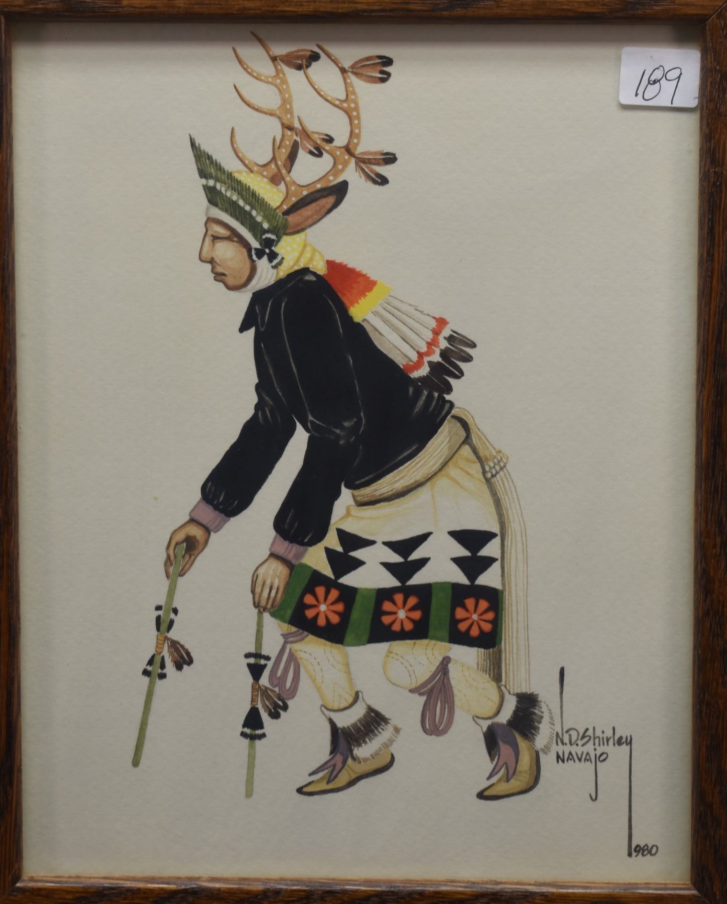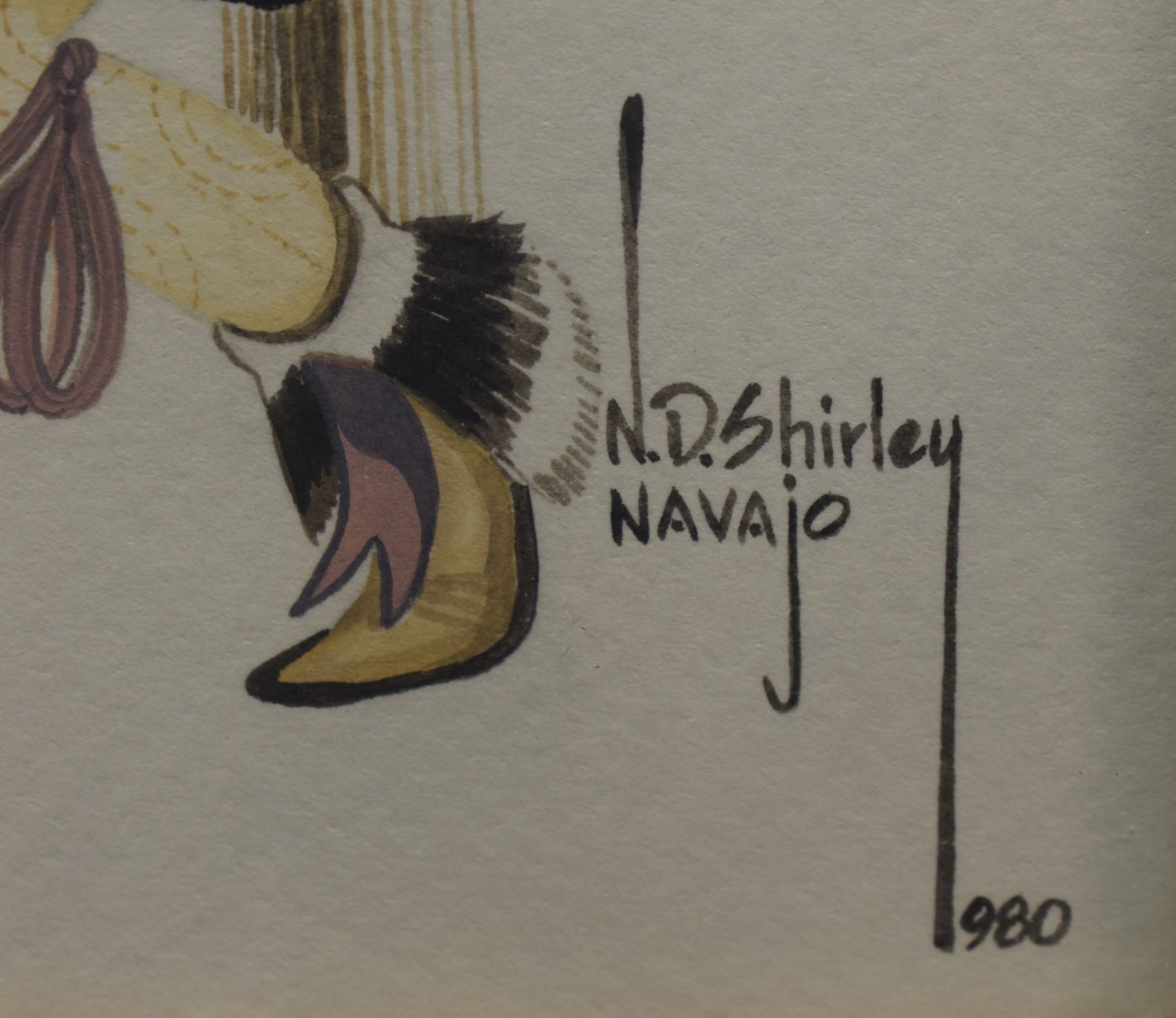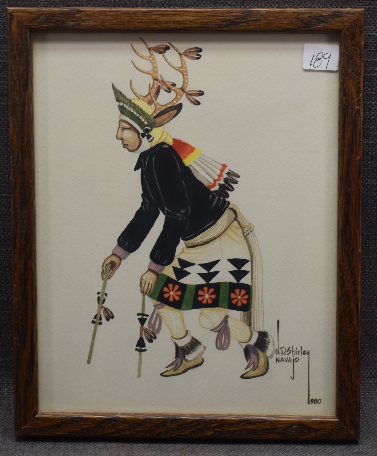 1980 Navajo. Original on paper depicting deer dancer, signed N.D. Shirley. 10'' x 8'' frame size 11'' x 9''