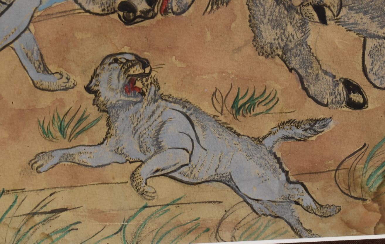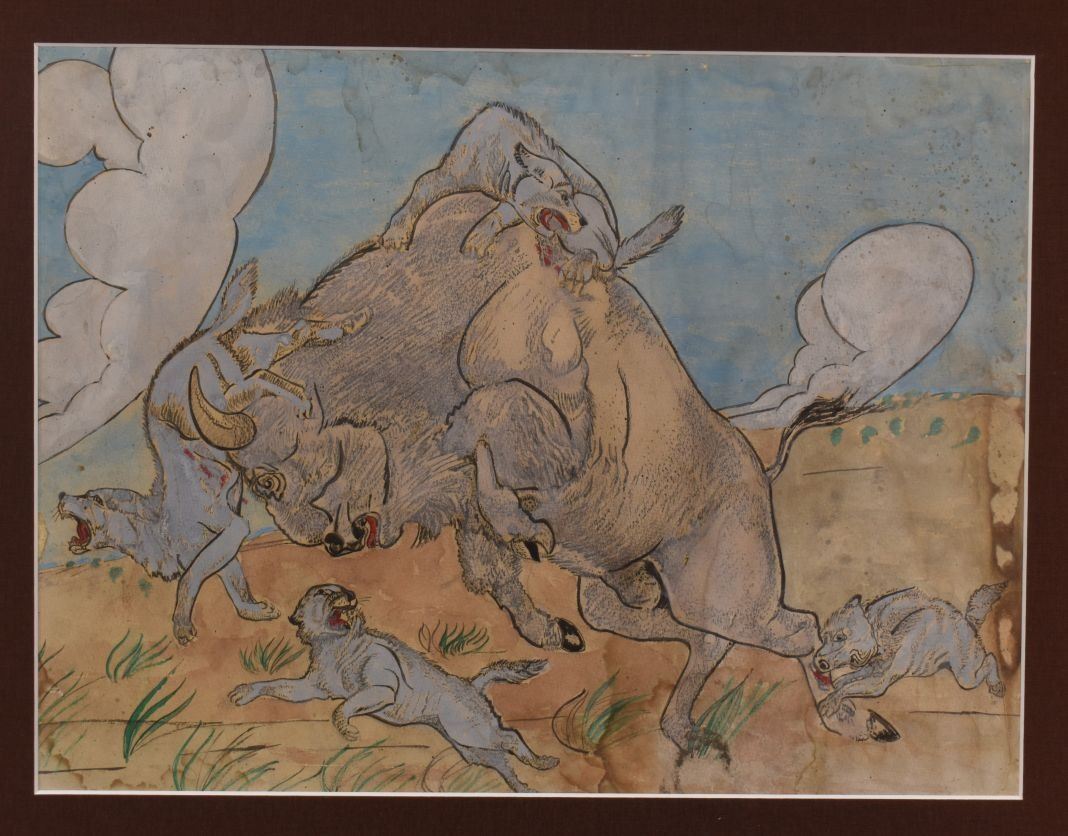 1960's Navajo. original on paper depicting buffalo and wolves titled "last Struggle" signed on the back. Image has been trimmed and has water damage 11'' x 15'' frame size 20'' x 24''