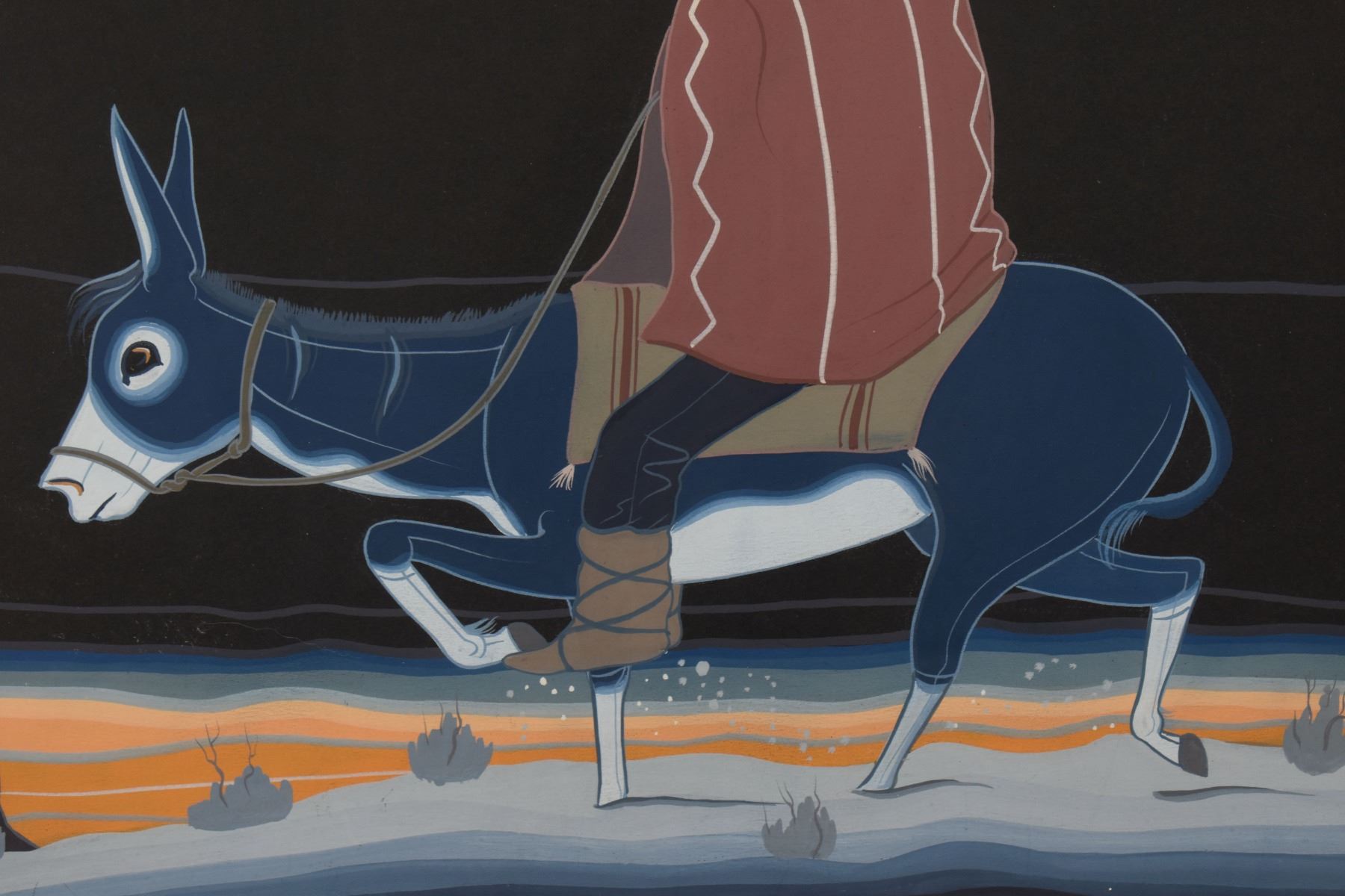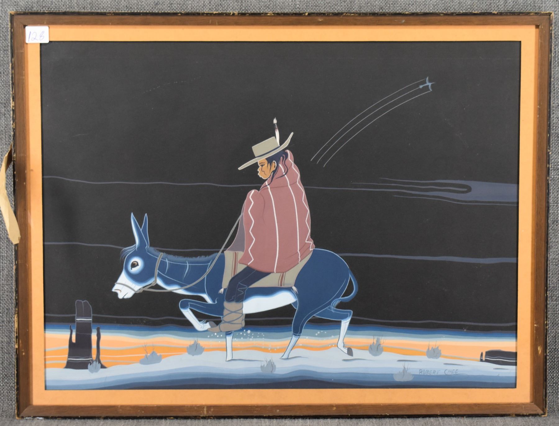 1960's Navajo, original hand painted on paper depicting man on burro by Robert Chee 13.5" x 18.5" matted and framed to 15.75" x 20.5"