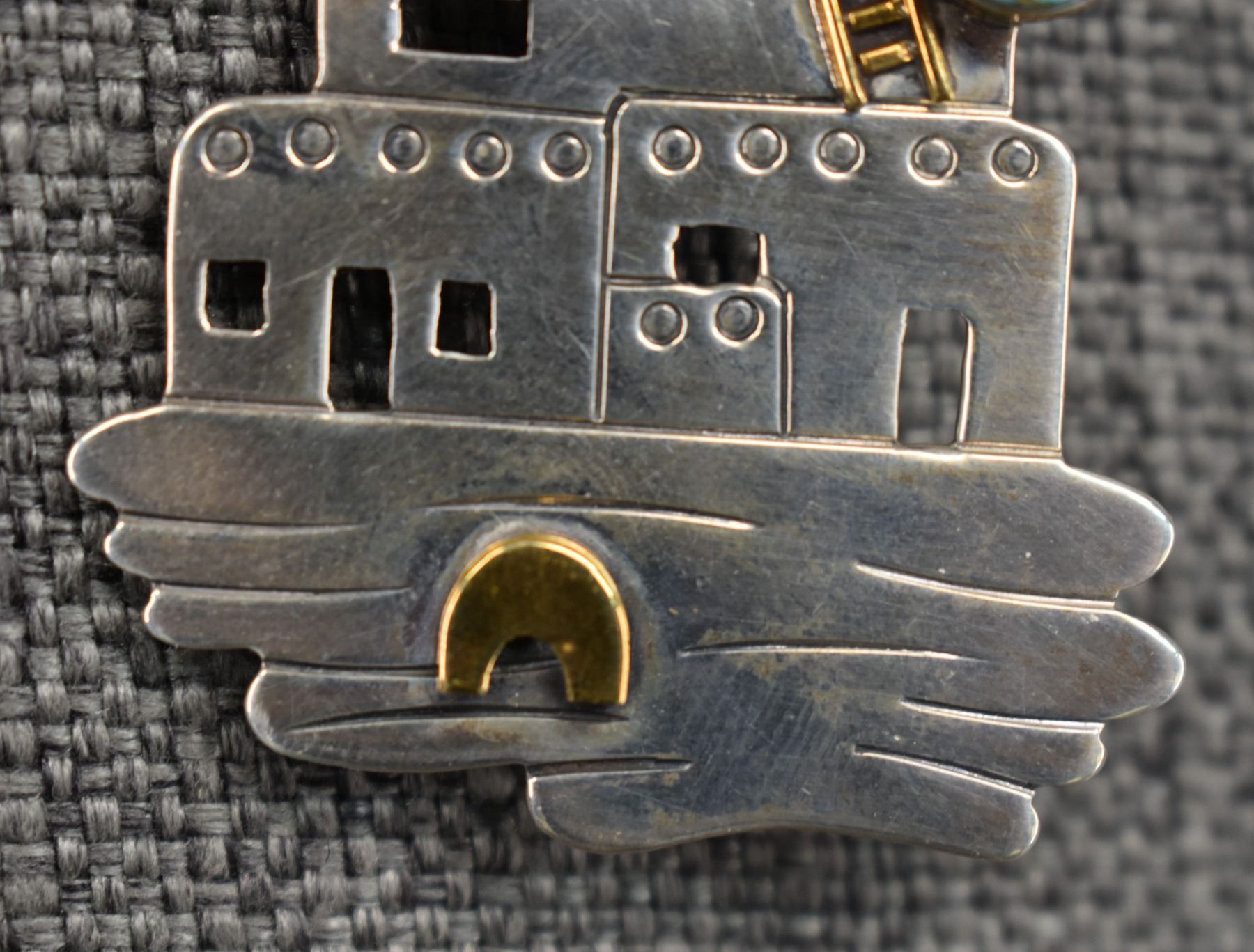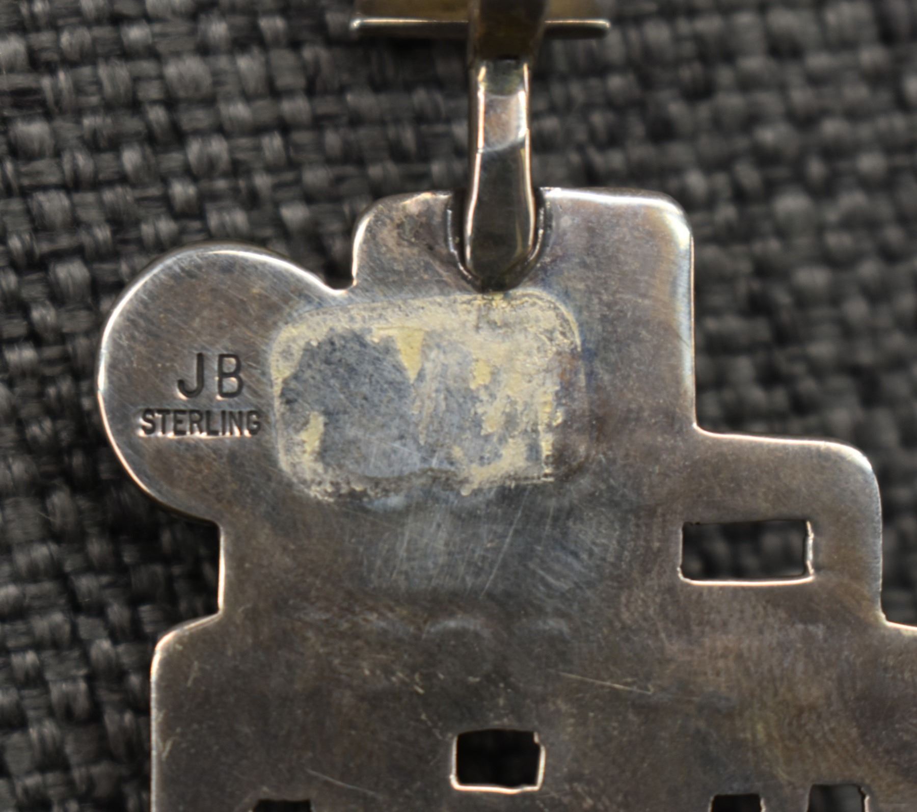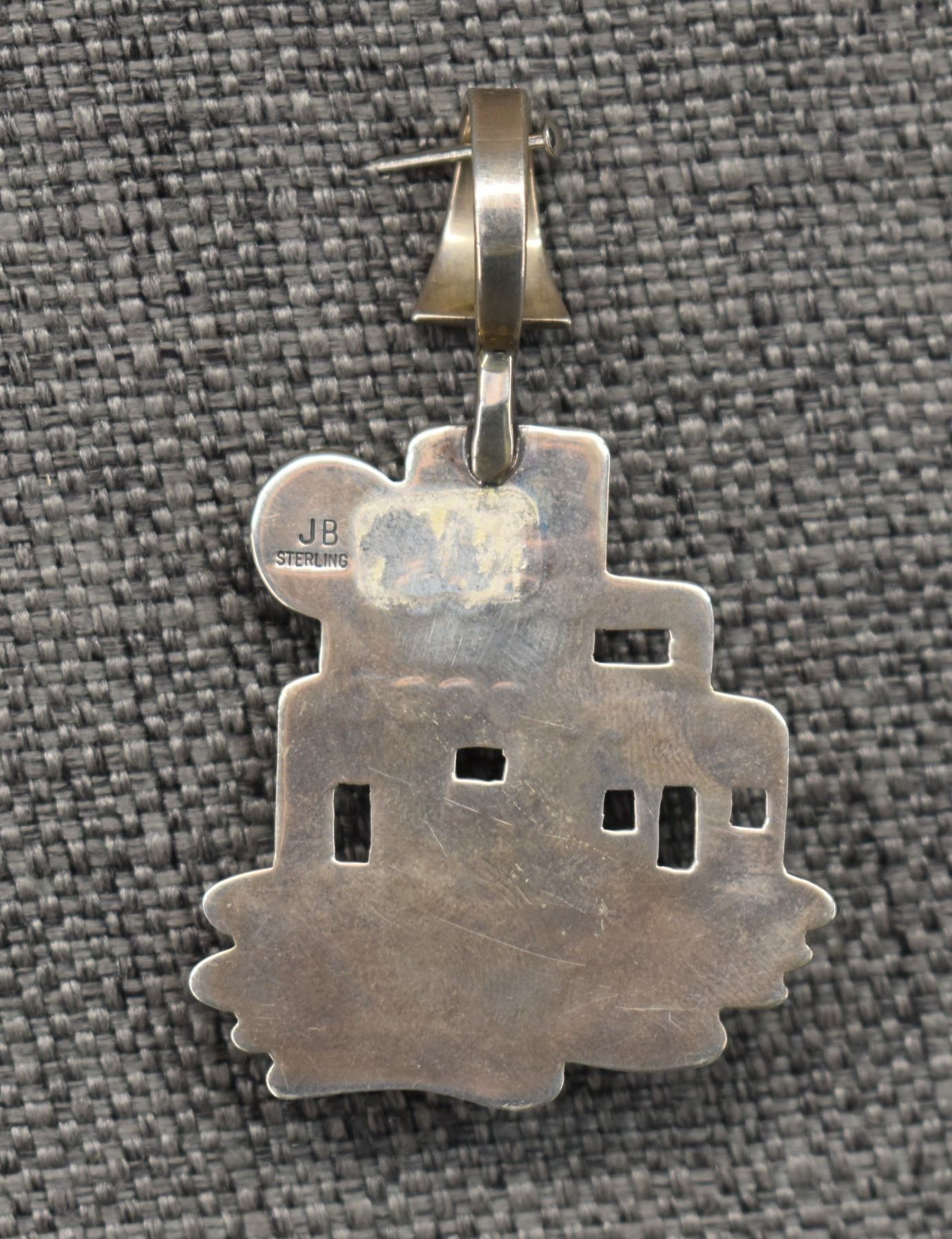 1990's Navajo, sterling silver stamped design with cutout pueblo design and turquoise stone signed JB. 2.75" x 1.75" total weight 16 grams