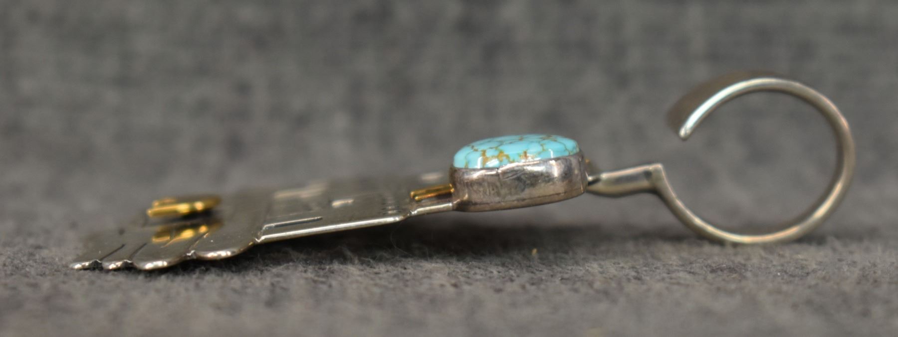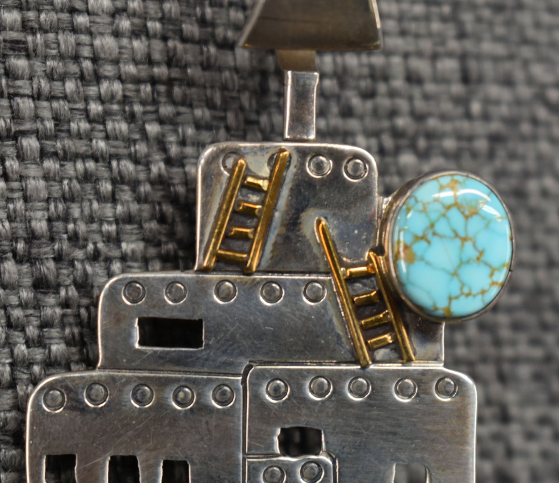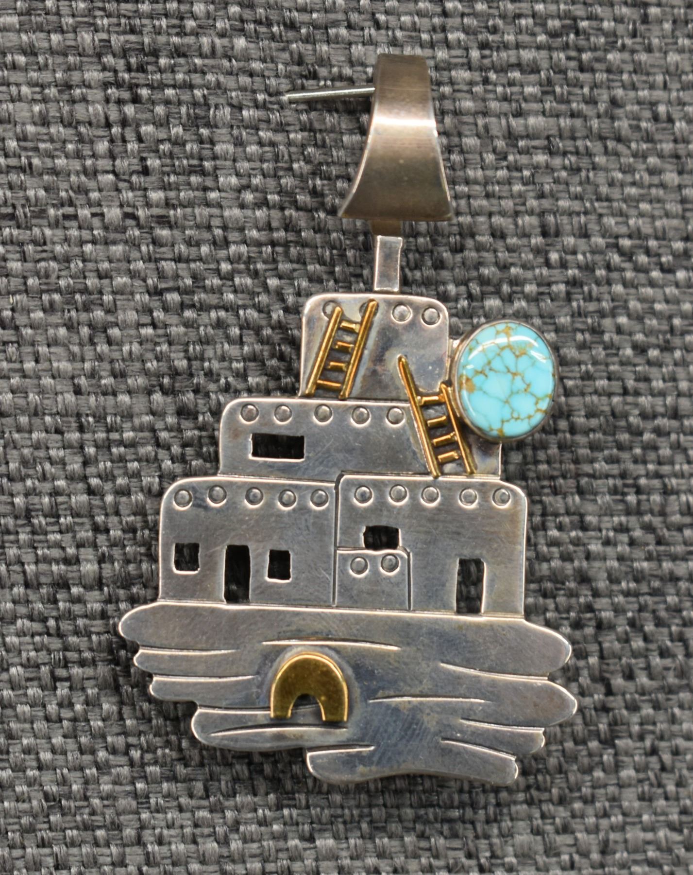 1990's Navajo, sterling silver stamped design with cutout pueblo design and turquoise stone signed JB. 2.75" x 1.75" total weight 16 grams