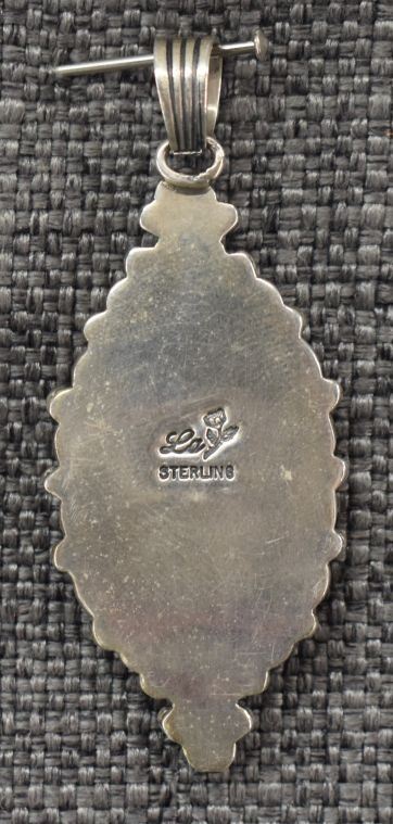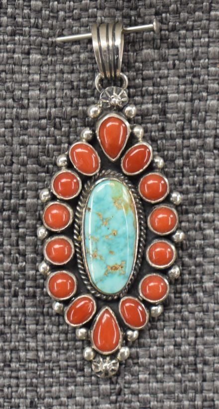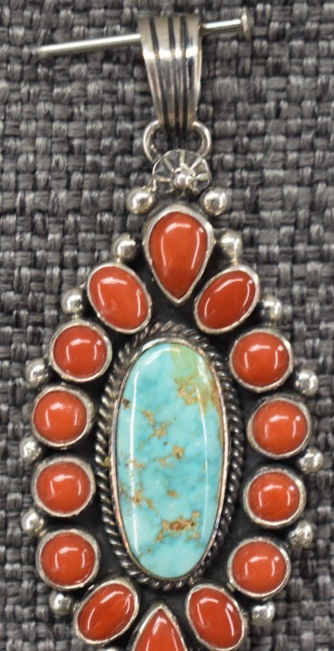 1990-2000's Navajo, sterling silver coral and turquoise signed with hallmark for LaRose Ganadonegro 2.25" x 1" total weight 14 grams