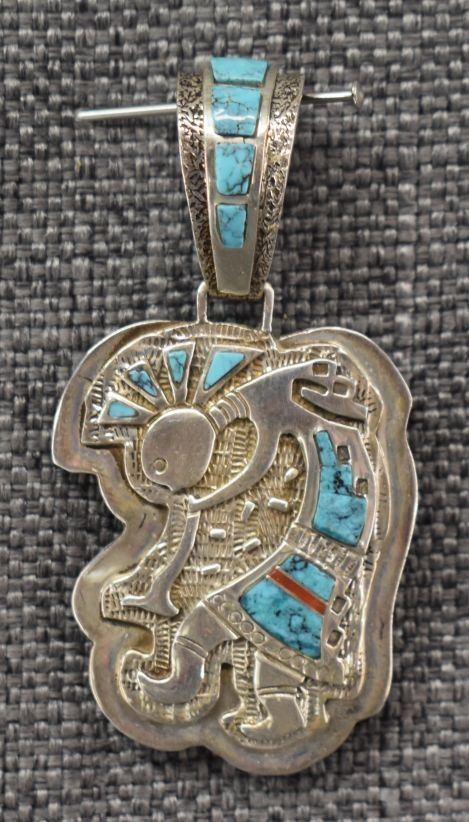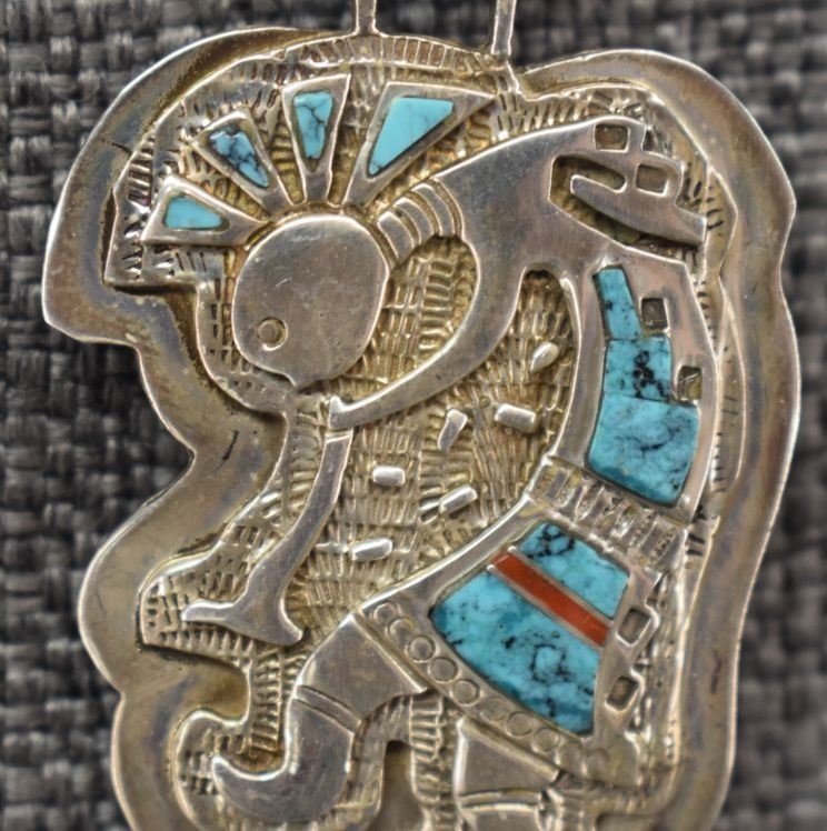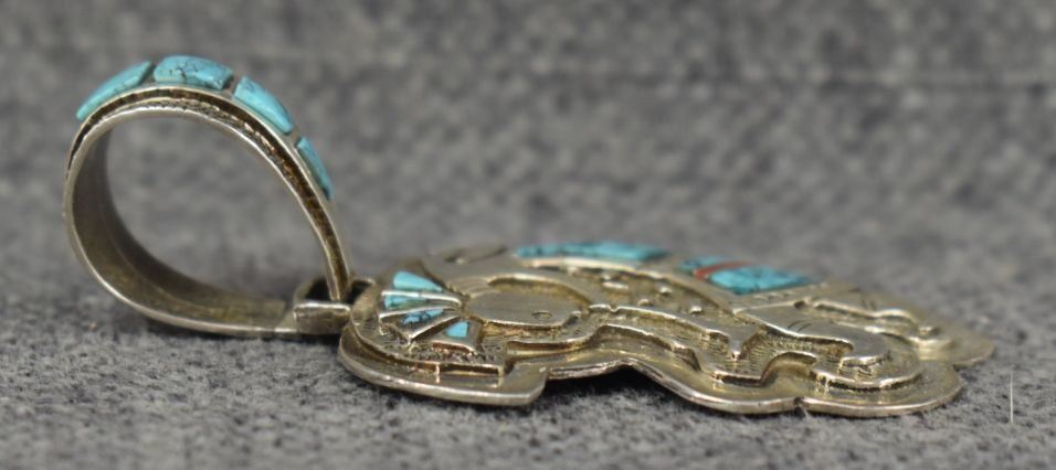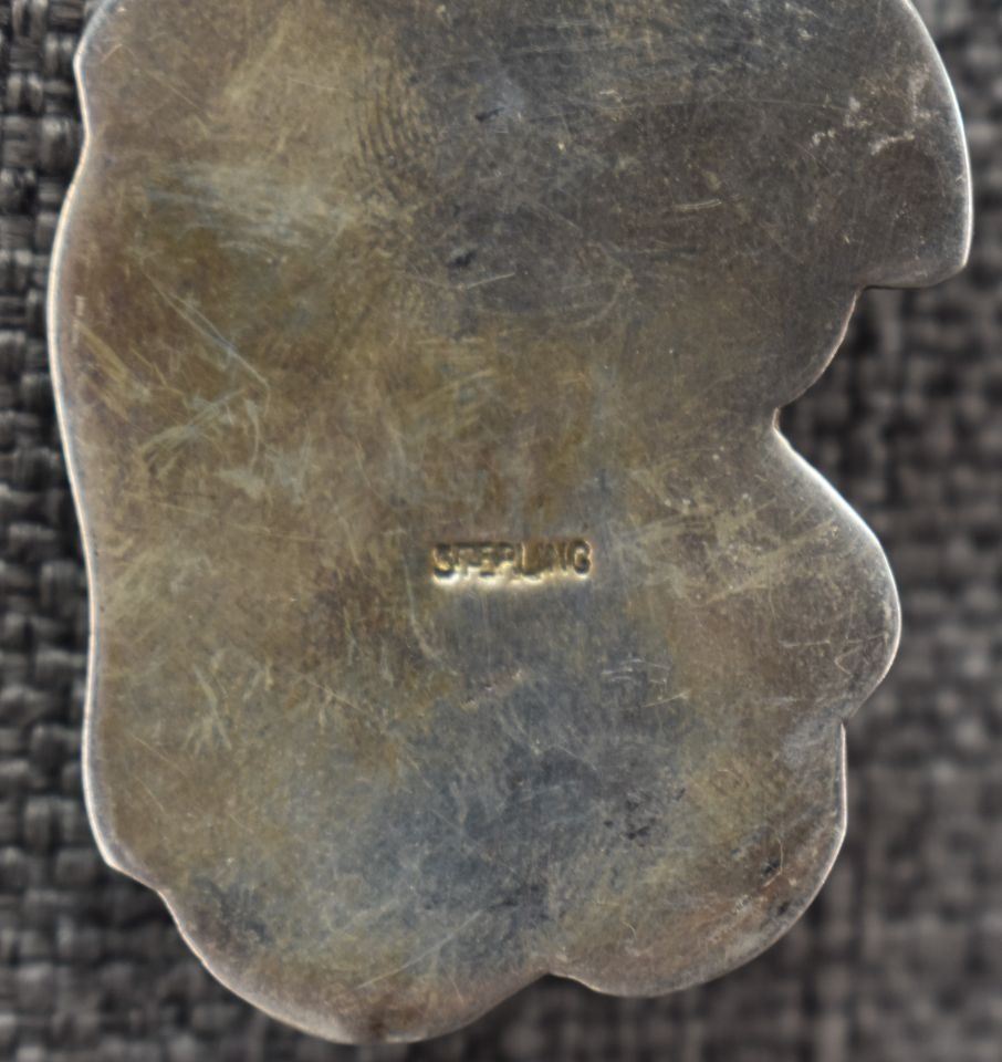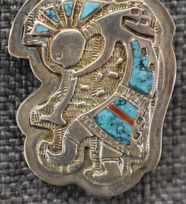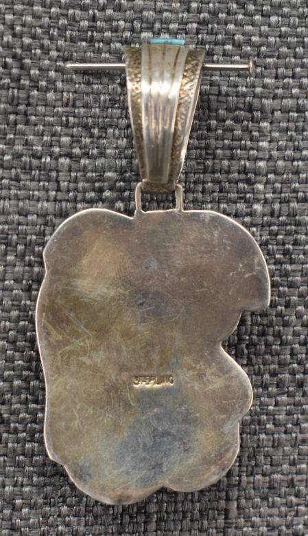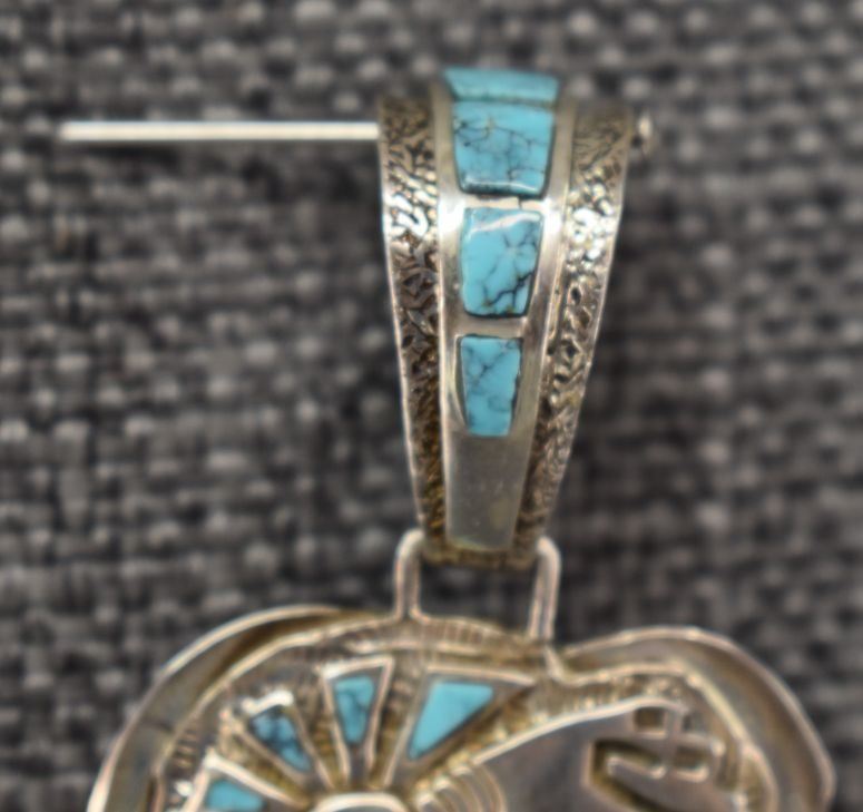 1990-2000's Navajo, sterling silver stamped design with inlaid turquoise 2.5" x 1.5"