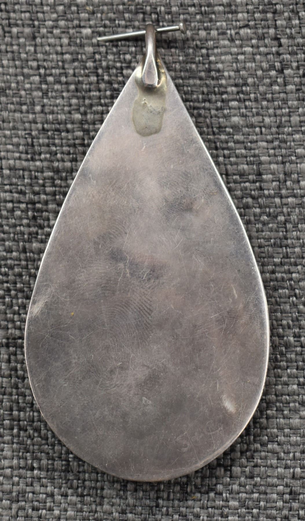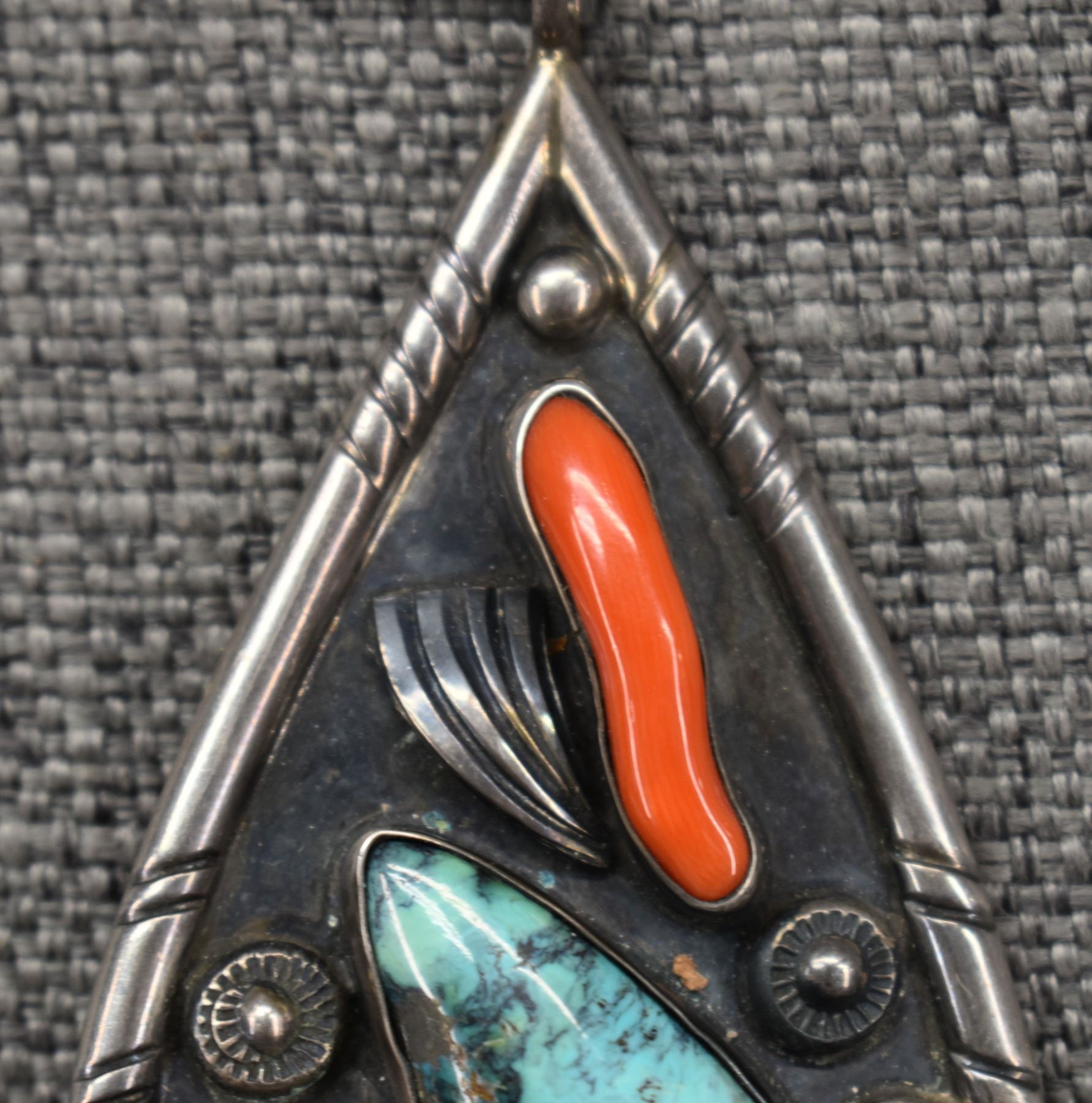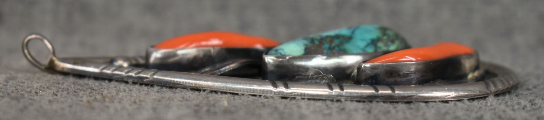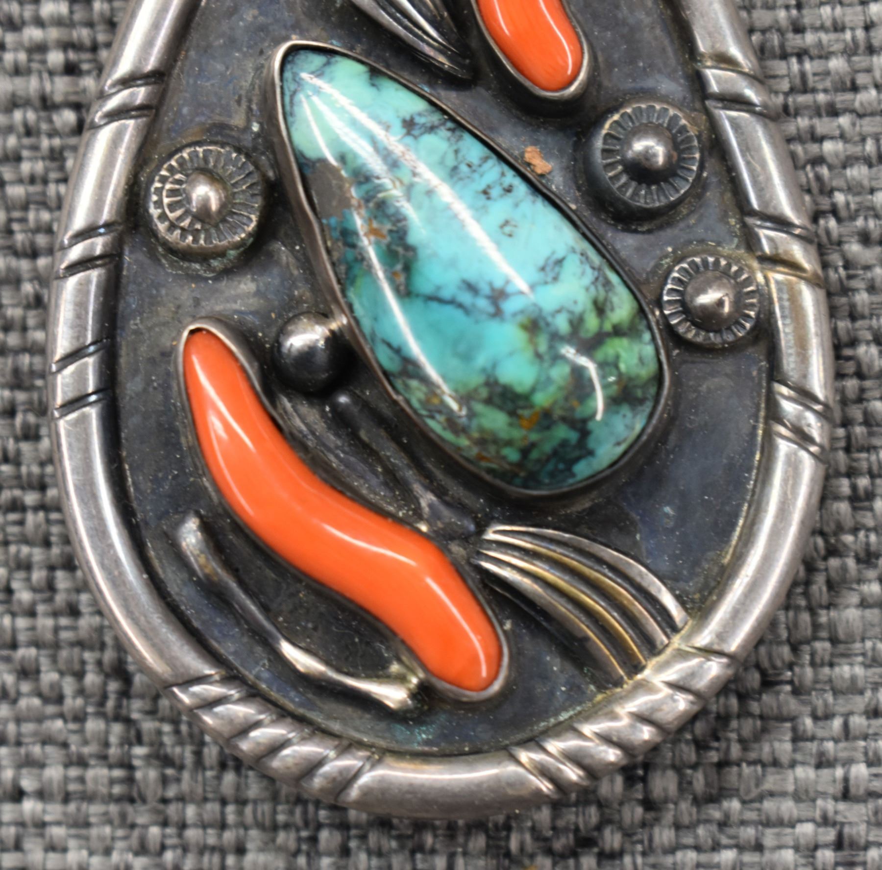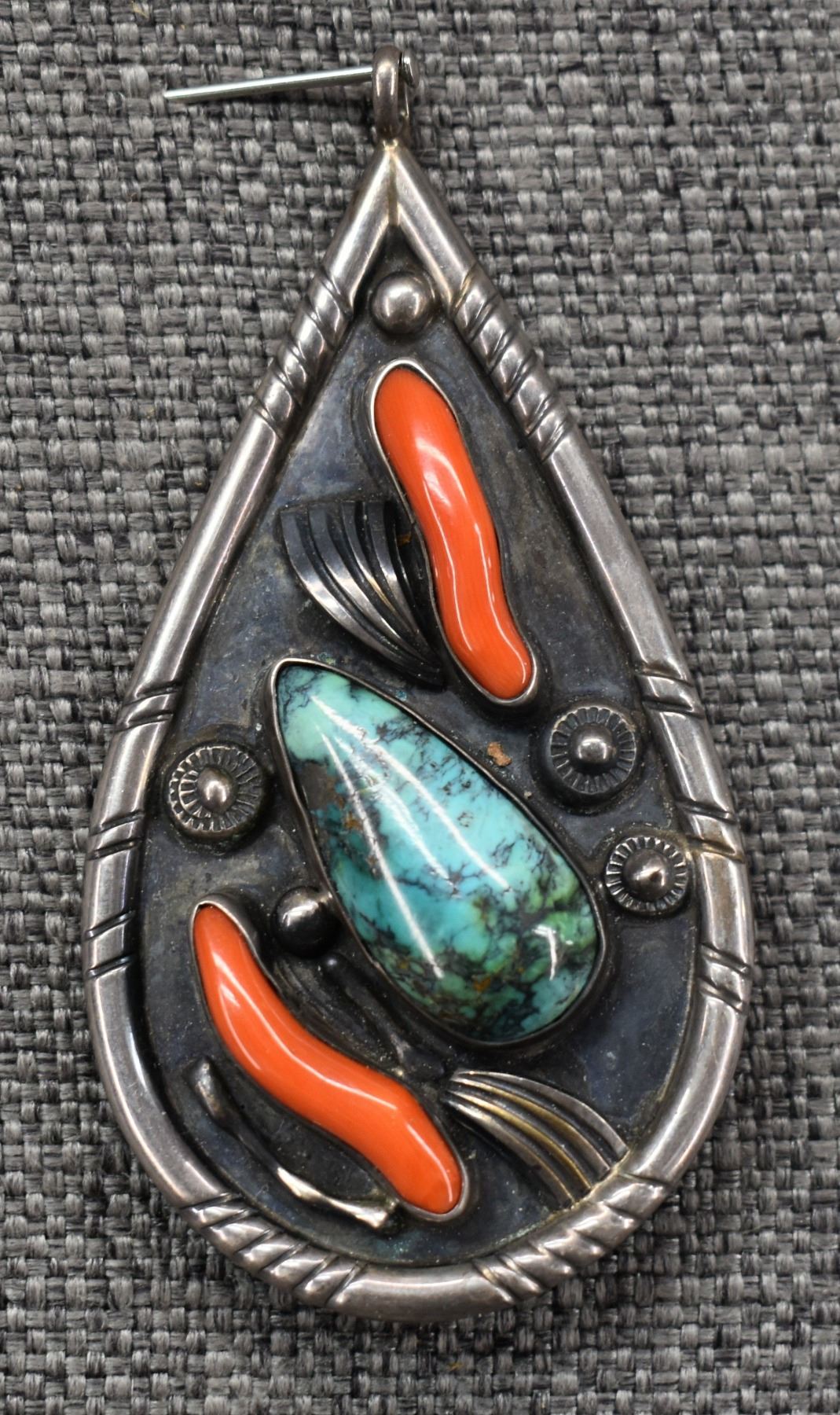 1970's Navajo, sterling silver stamped design with turquoise and coral. 3.5" x 2", total weight 43 grams
