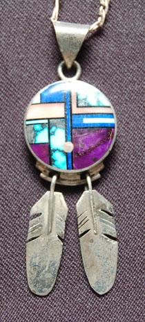 1980'S sterling silver, inlaid pendent, signed Duray, 2.75" x 1", 18" chain