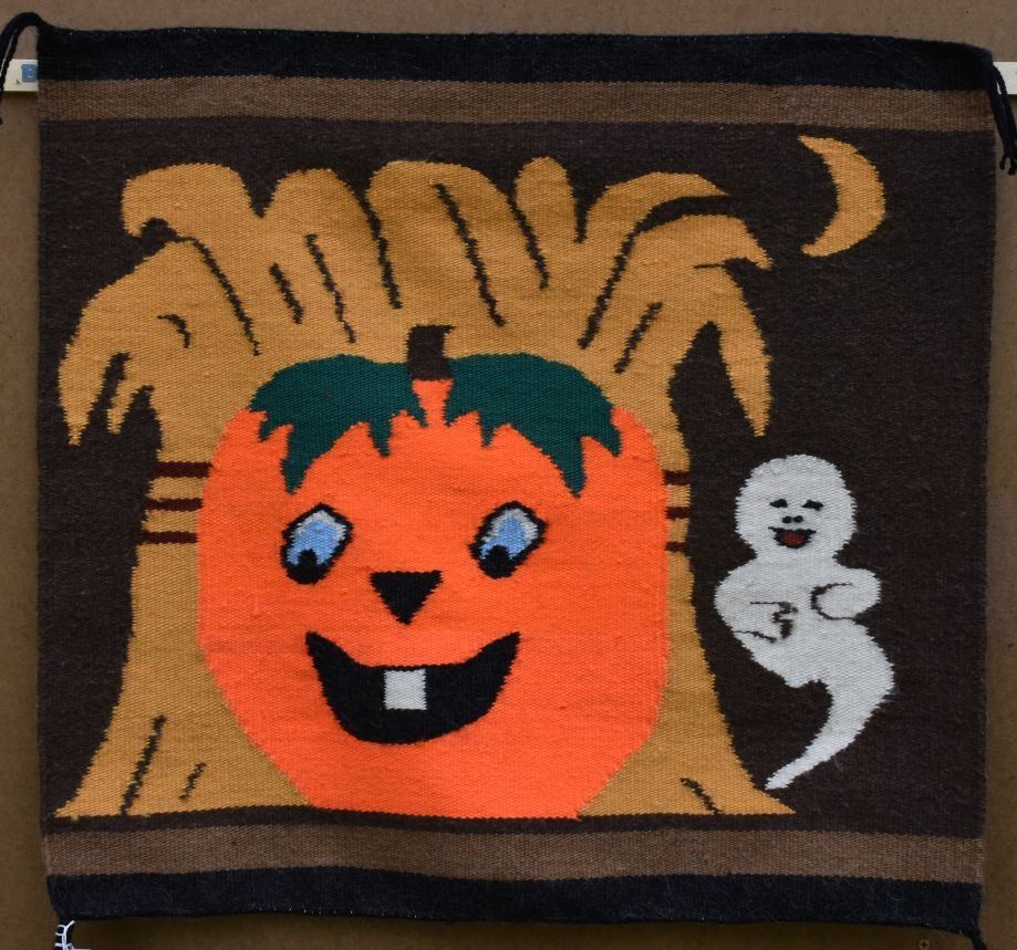 1990's Navajo, hand woven Pumpkin and Ghost design has tag attributing to Frannie Rita 26" x 24"