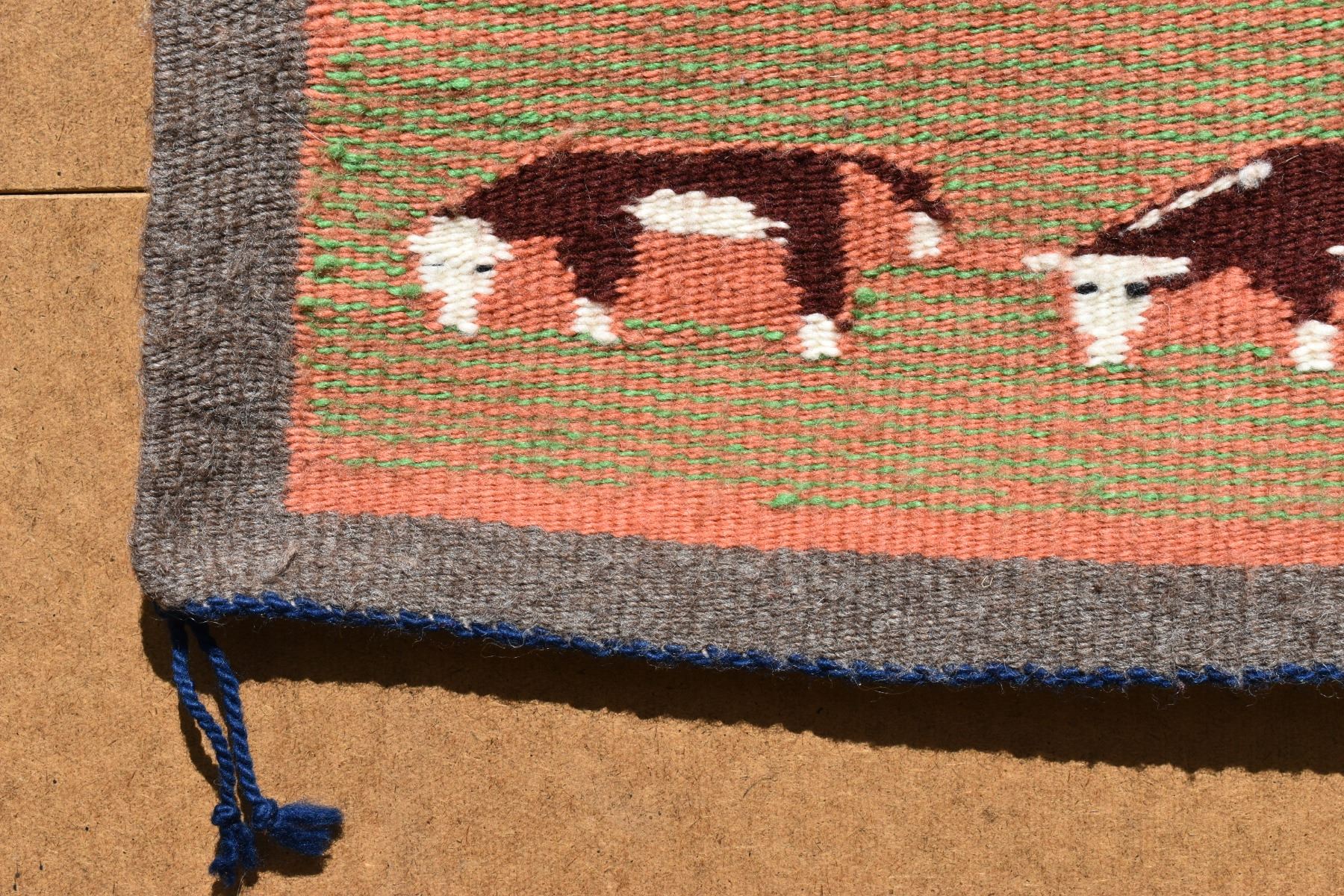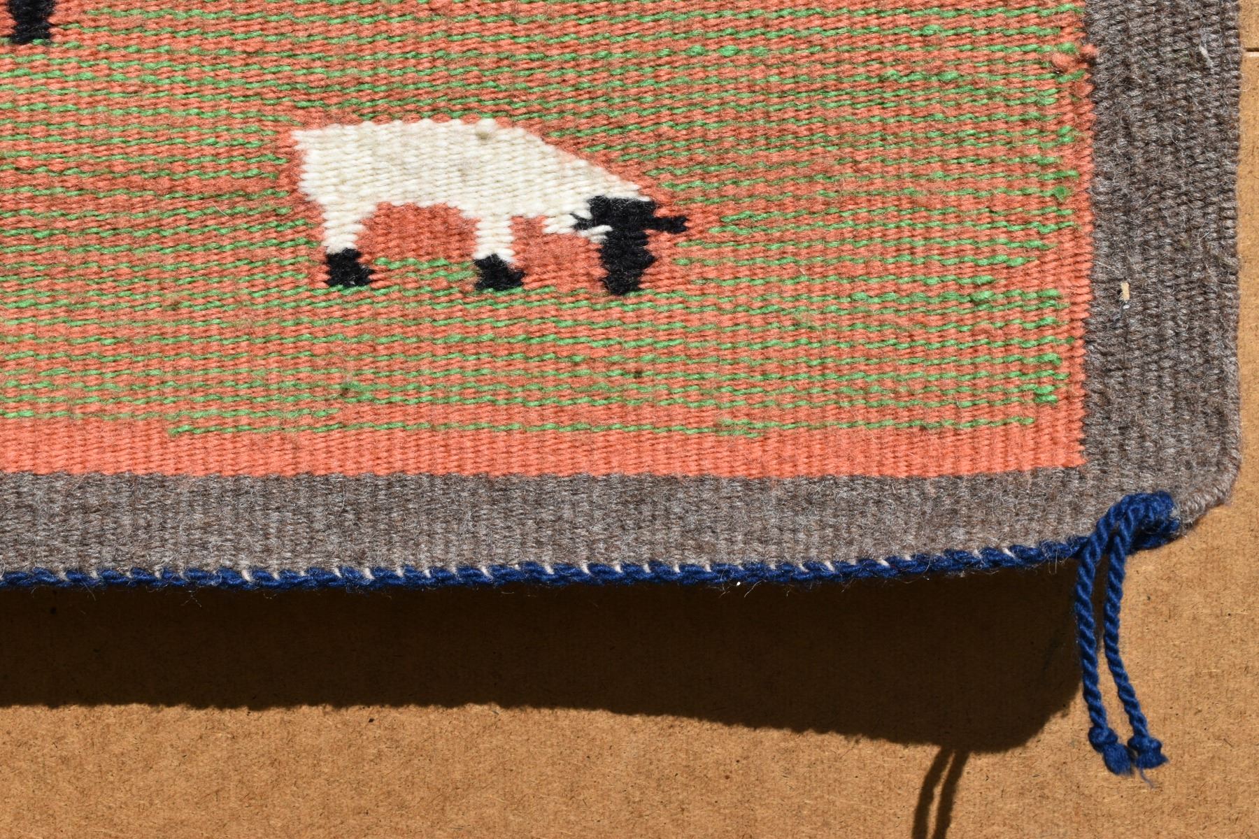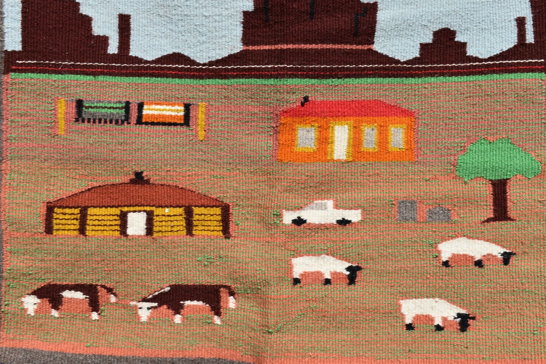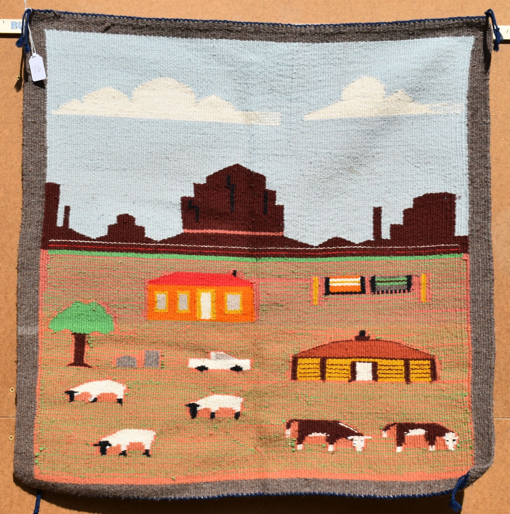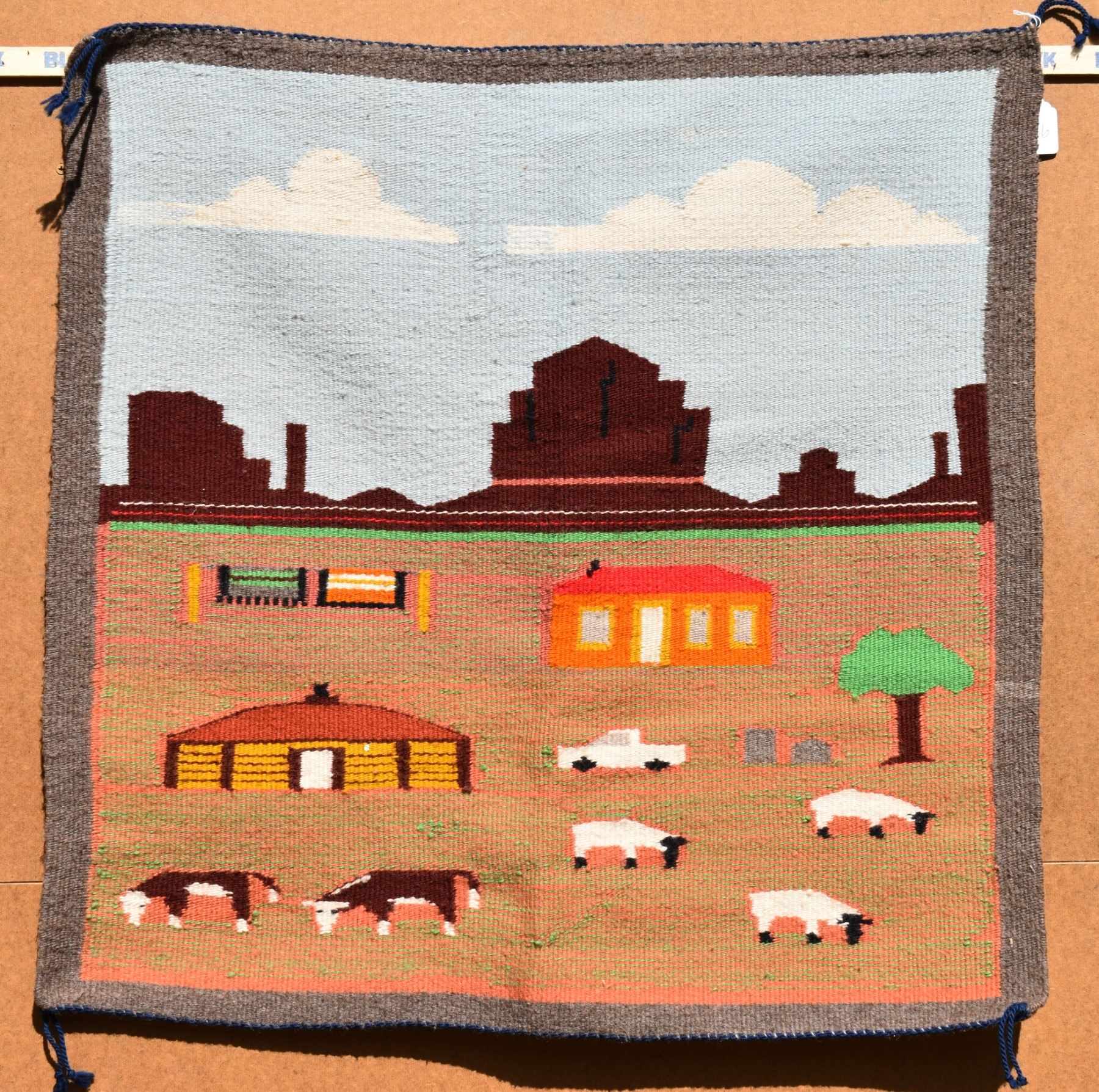1980's Navajo, hand woven pictorial with sheep, cows, hogan and mountains 30" x 30"