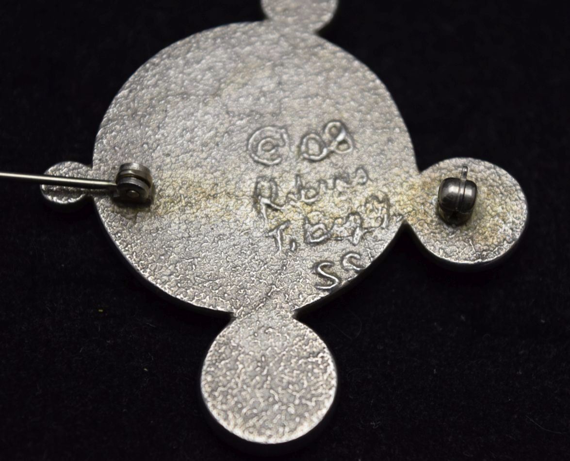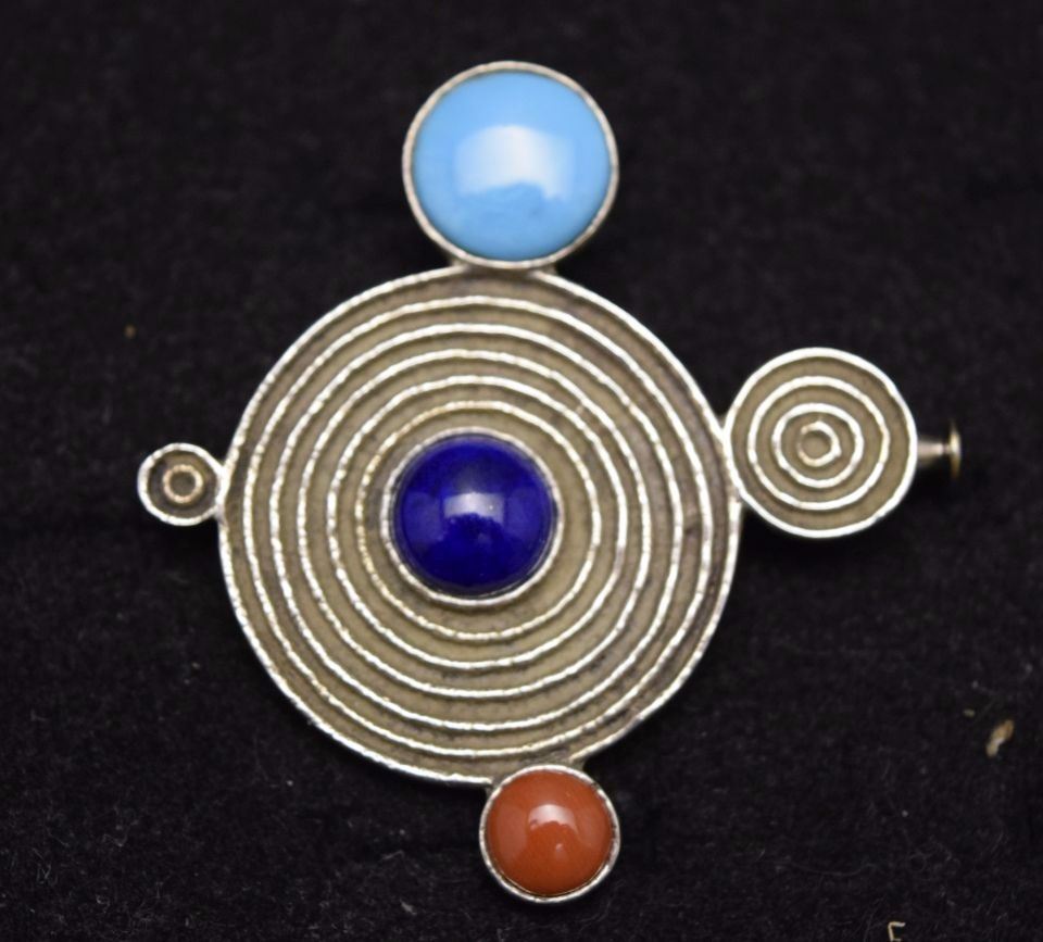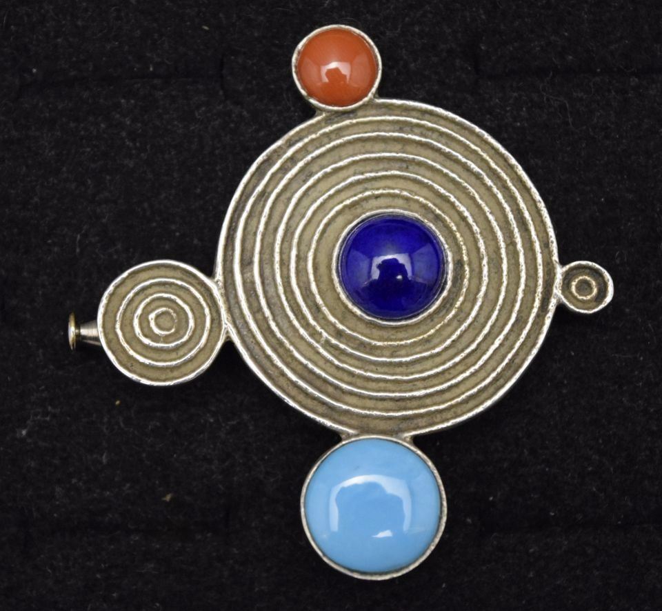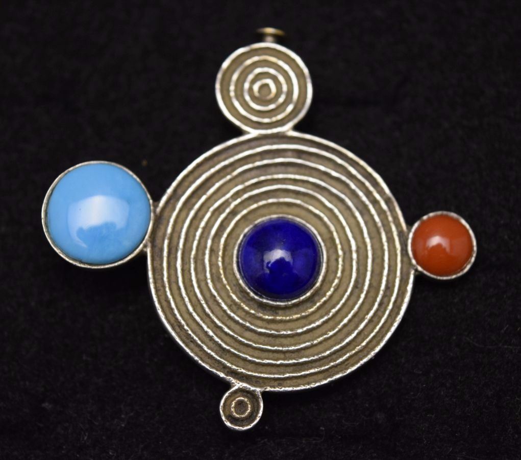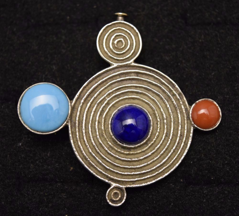 1980 tufa cast sterling silver turquoise coral and lapis by Rebecca Begay. 1.75'' x 2'' total weight 13 grams