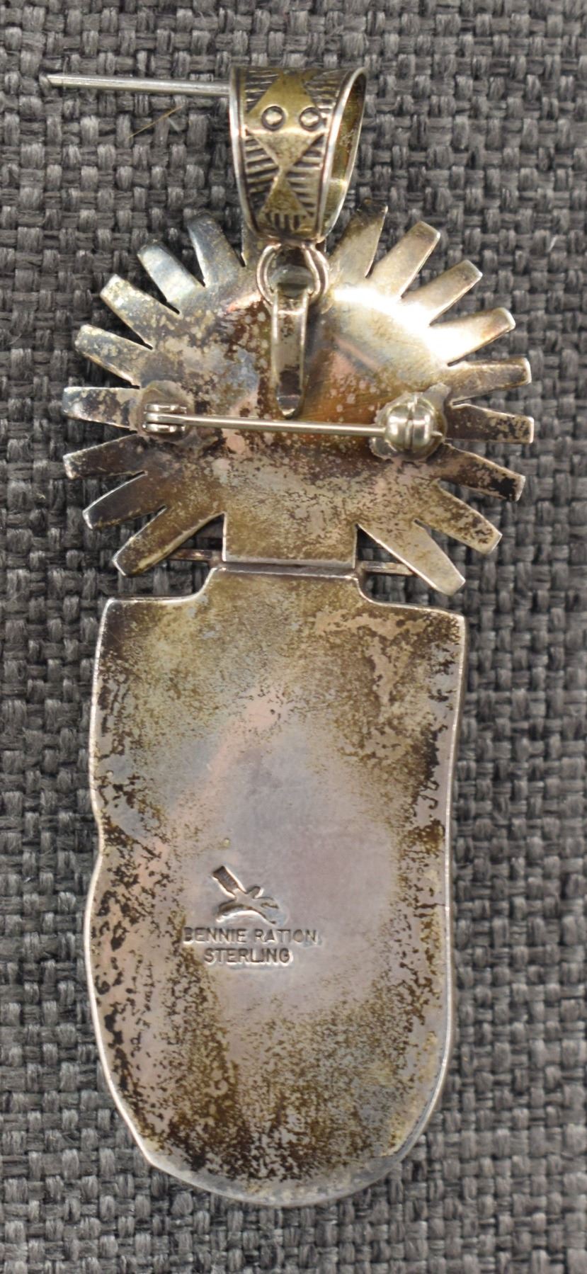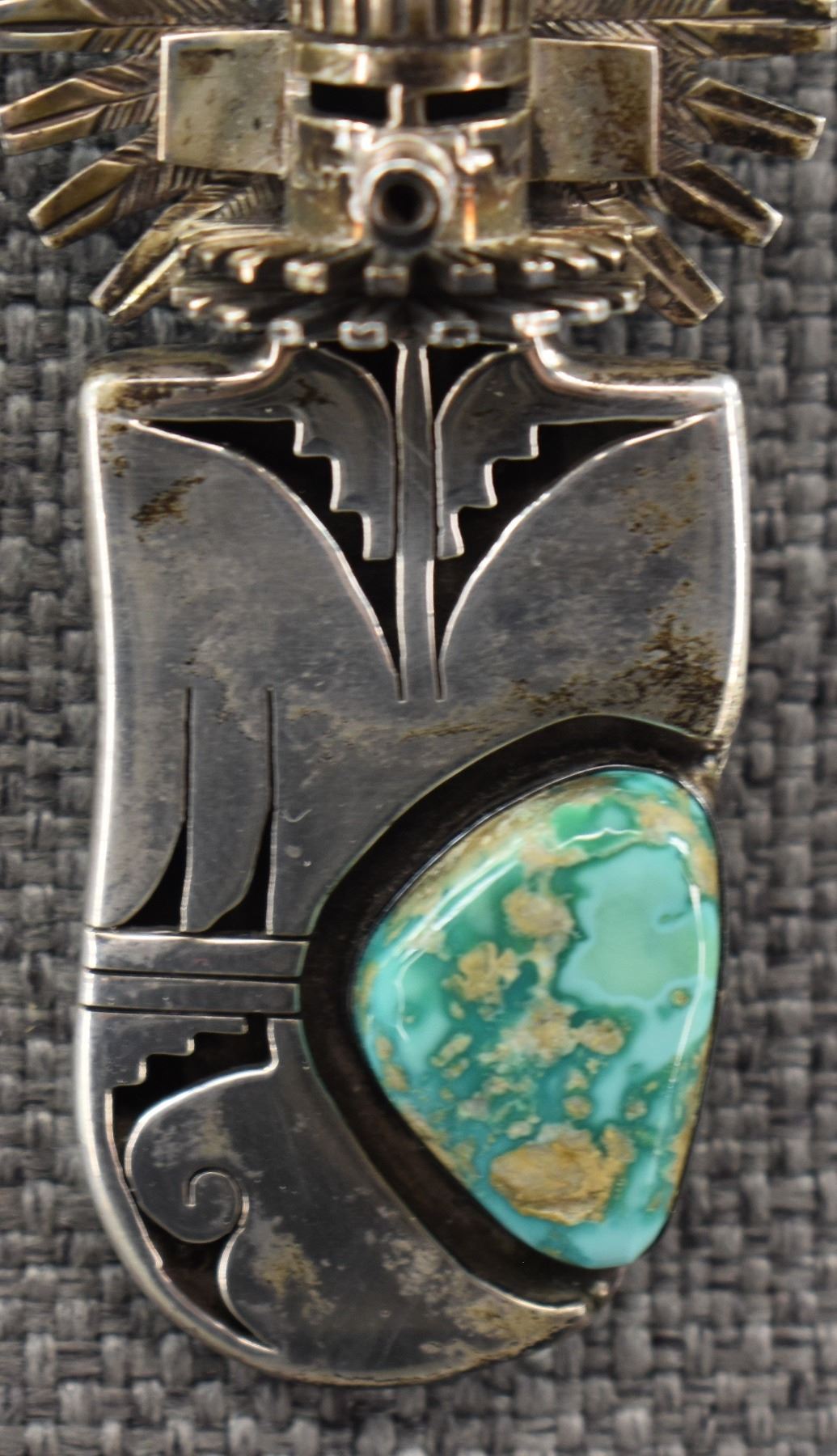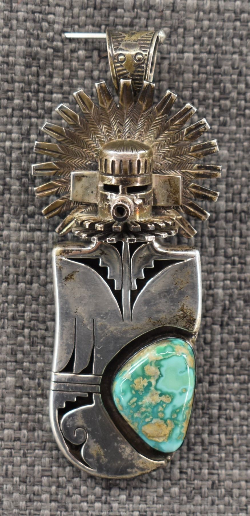 1980's Navajo, sterling silver stamped design with 3d kachina face with cutout hollow wear and turquoise stone signed with hallmark and Benny Ration 3.25" x 1.5" total weight 42 grams