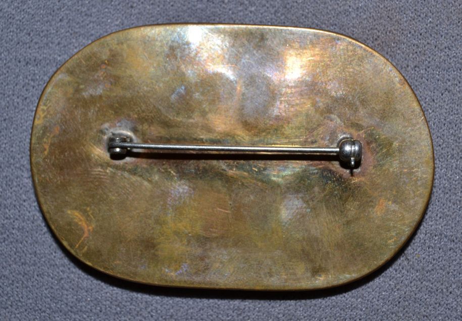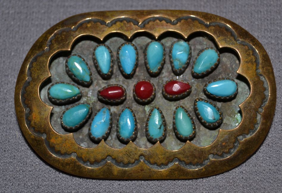 1970s 80s brass turquoise and coral 1.5"x2.5"