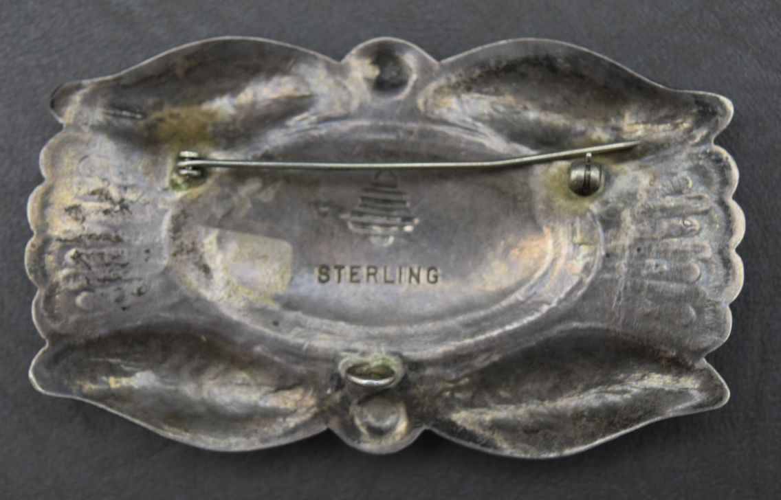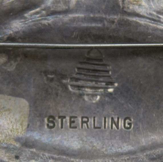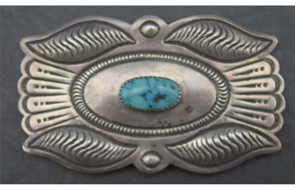 1950's sterling silver stamped design and turquiose has unknown hall mark 1.75'' x 3''