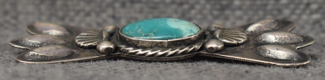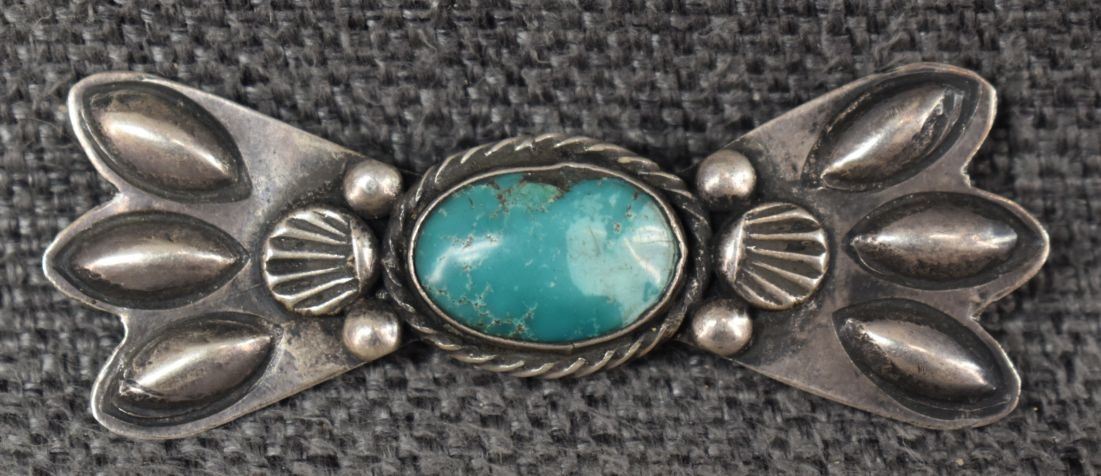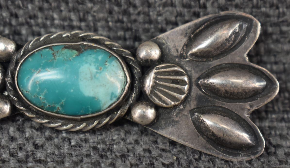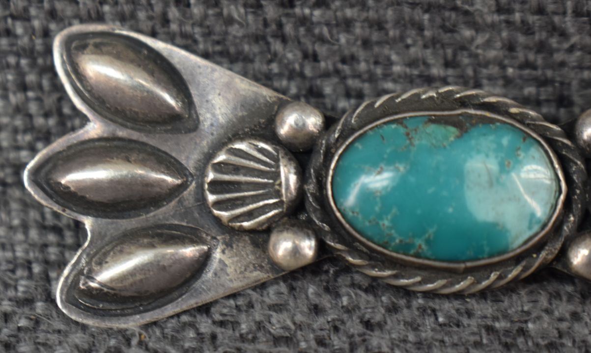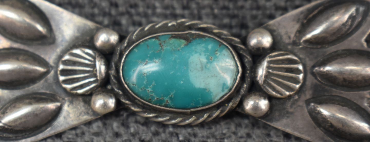 1950's Navajo, sterling silver stamped design with turquoise stone 1" x 2.5" total weight 12 grams