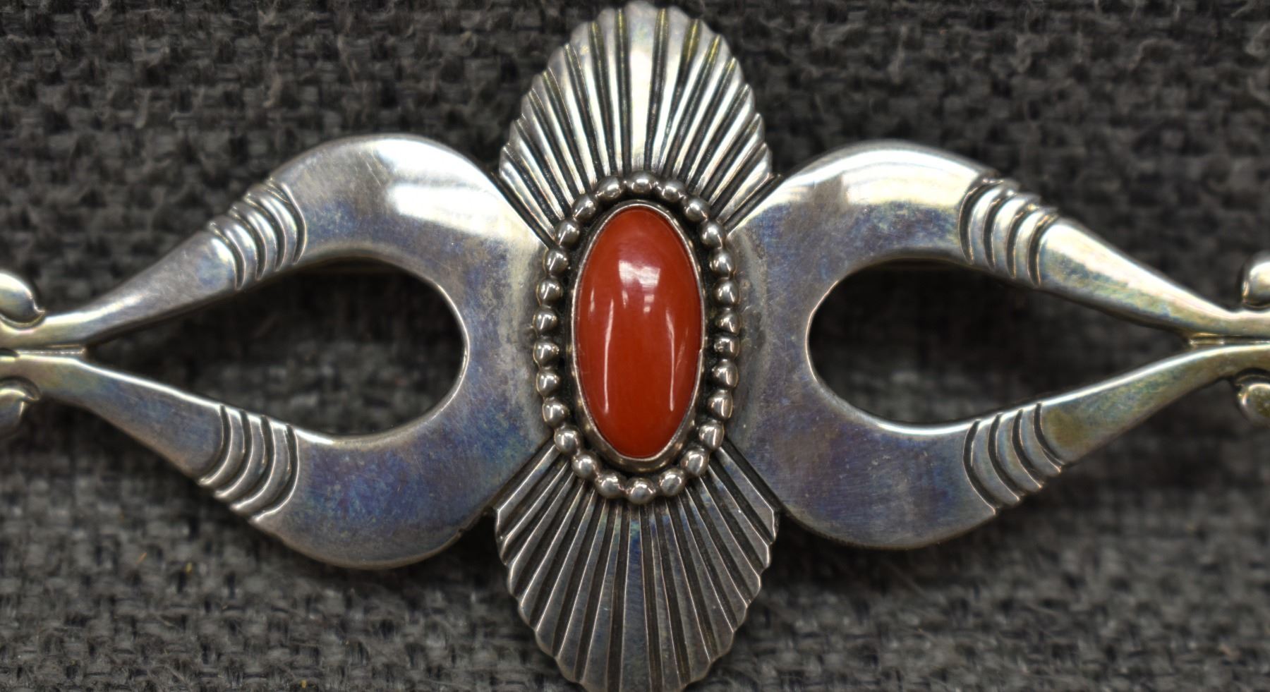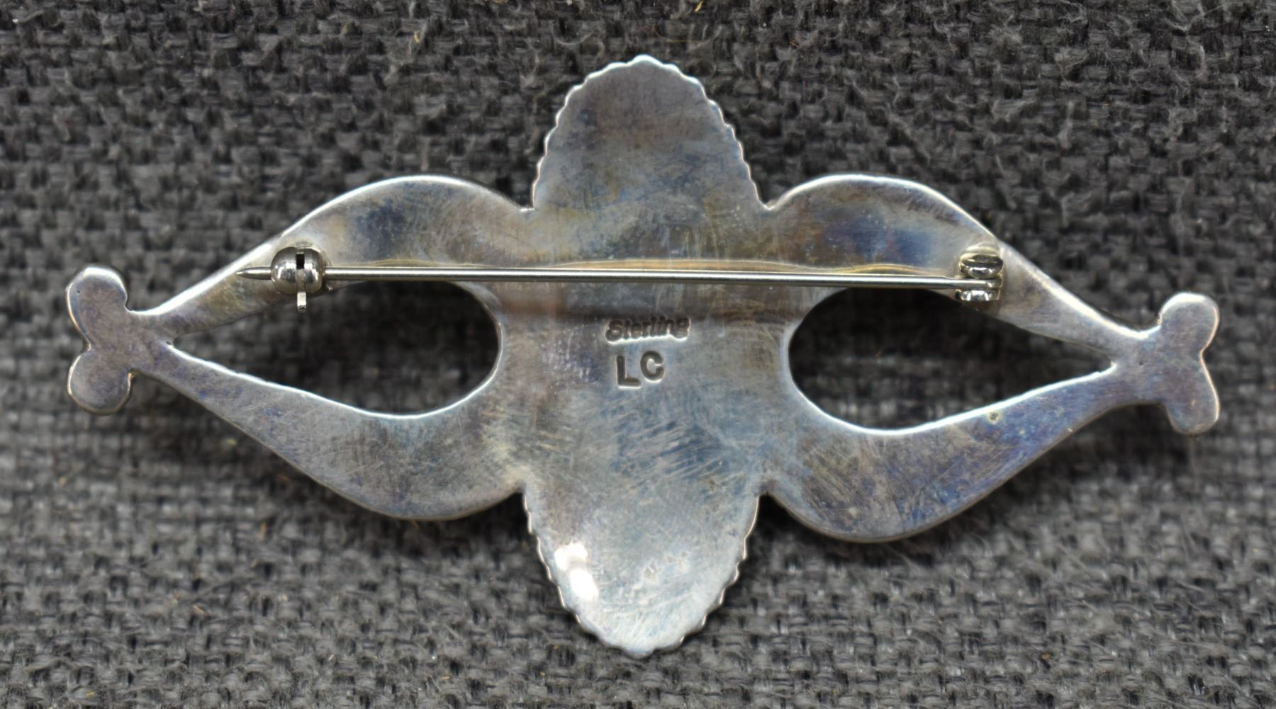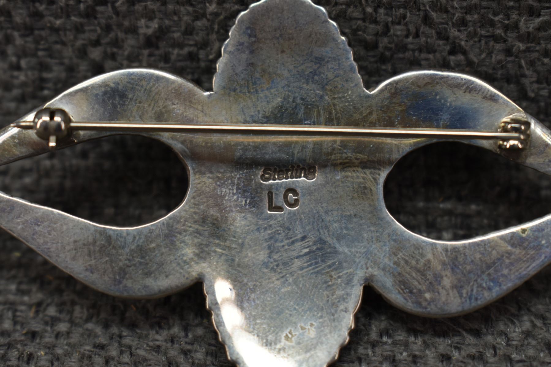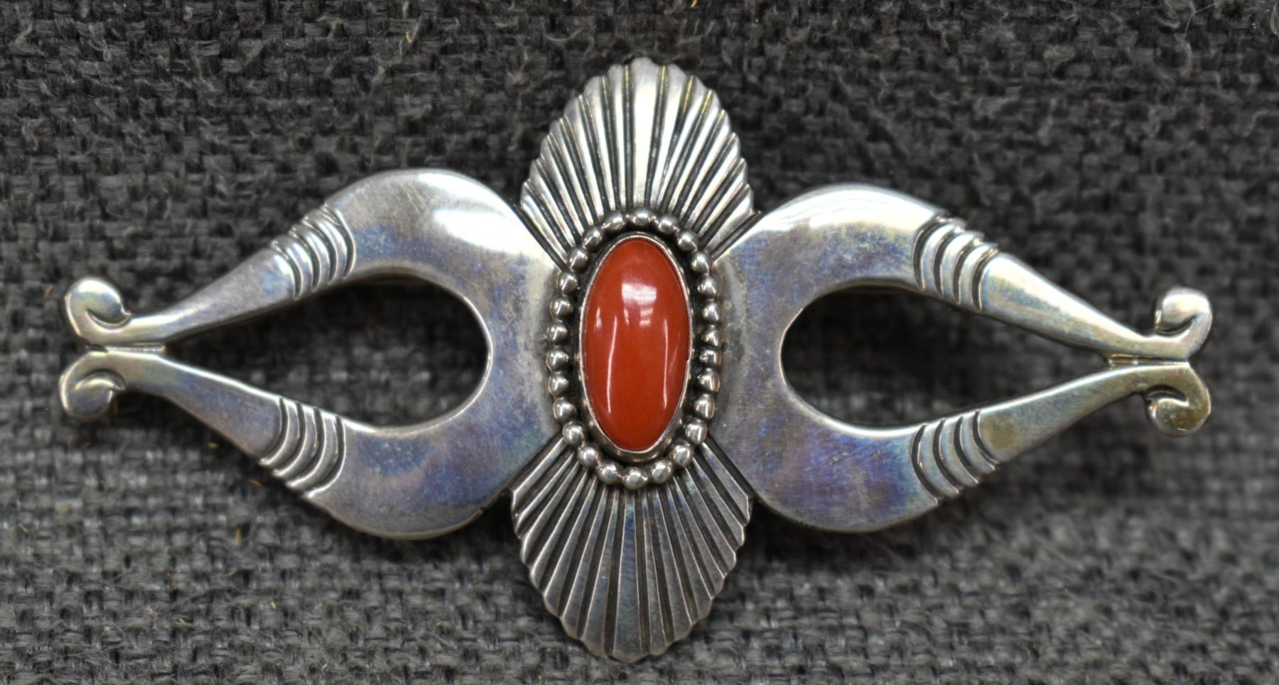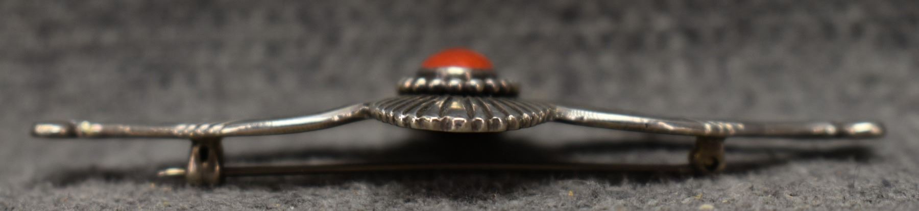 1990's Navajo. Sterling silver and coral pin. Signed L.C. 1.5'' x 3''. Total weight 22 grams