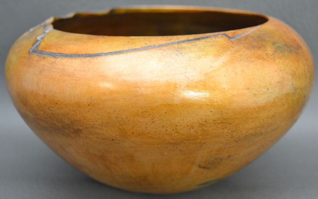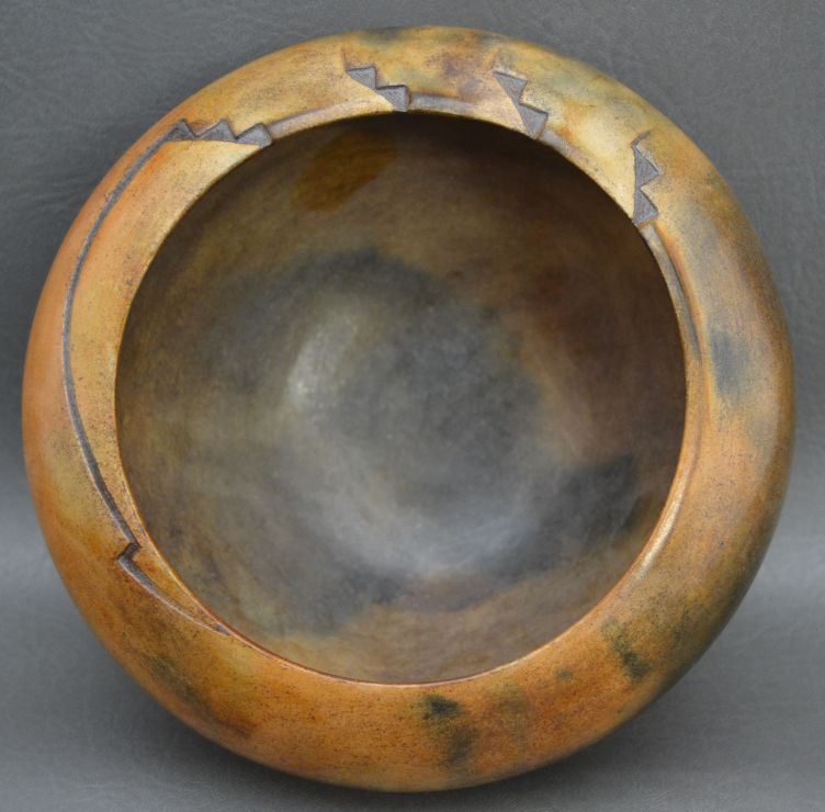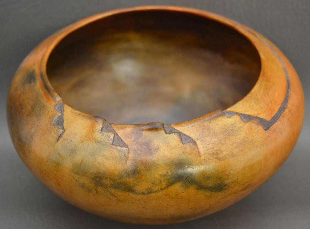 1980's hand made with sgraffito design on rim with traditional cactus glaze signed LM Horse 4.5" x 7.5"