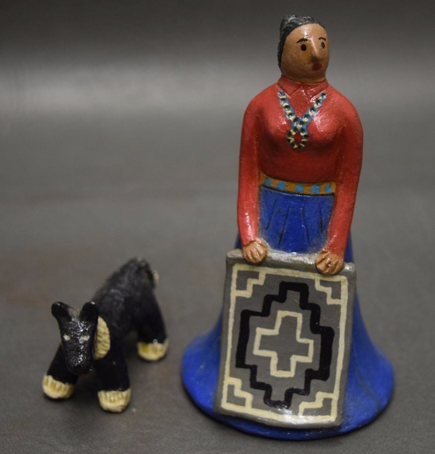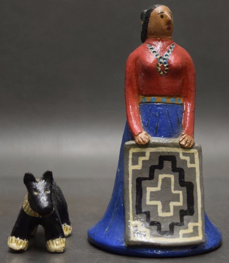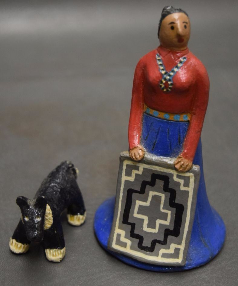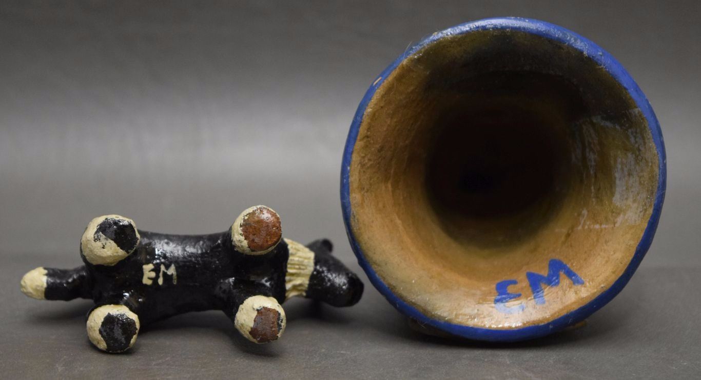 1980's pottery figures depicting dog 1.5'' tall and native woman 4.75'' signed EM for Elizabeth Manygoats.