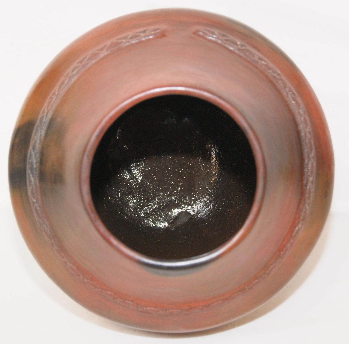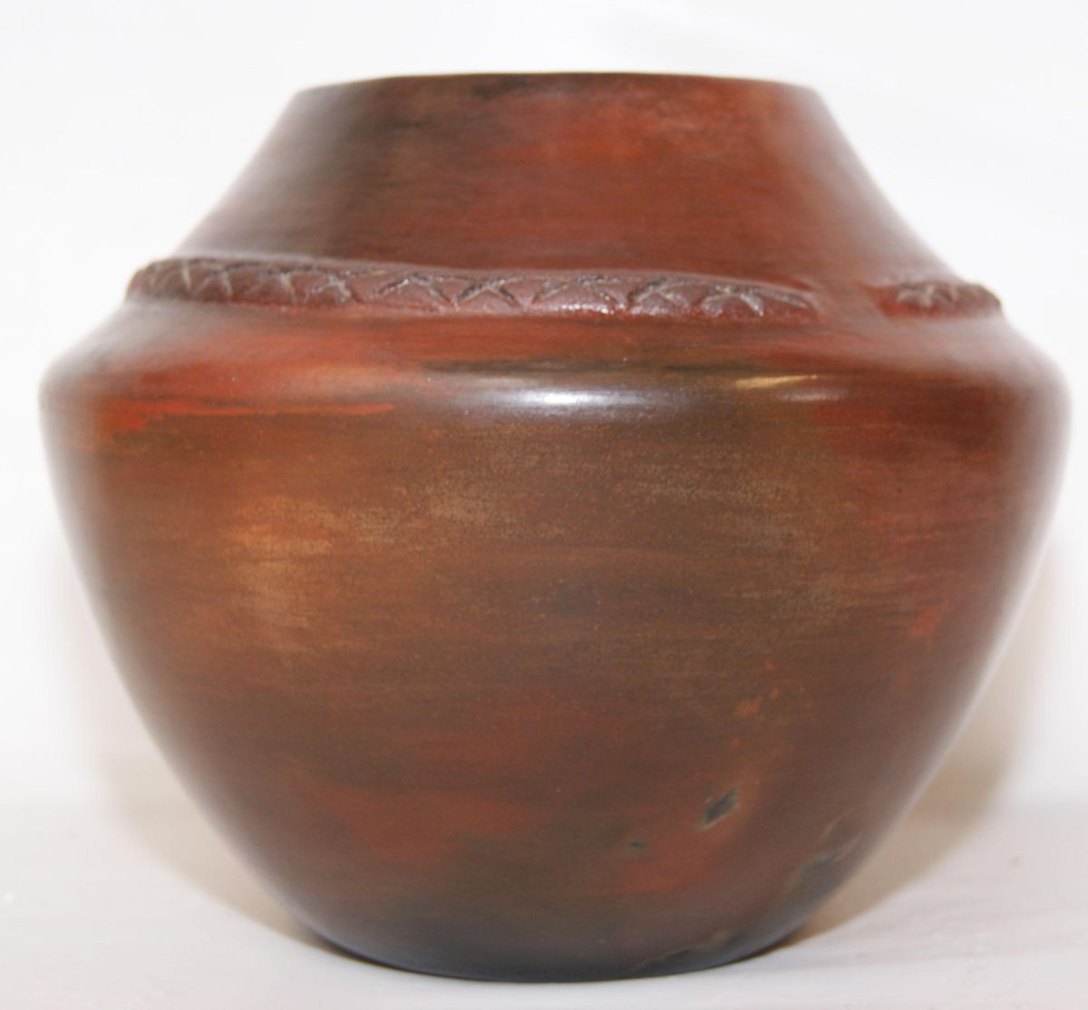 1990'S red ware, fire clouds, raised rope band design, signed Susie W.Crank, 6.5" x 8"