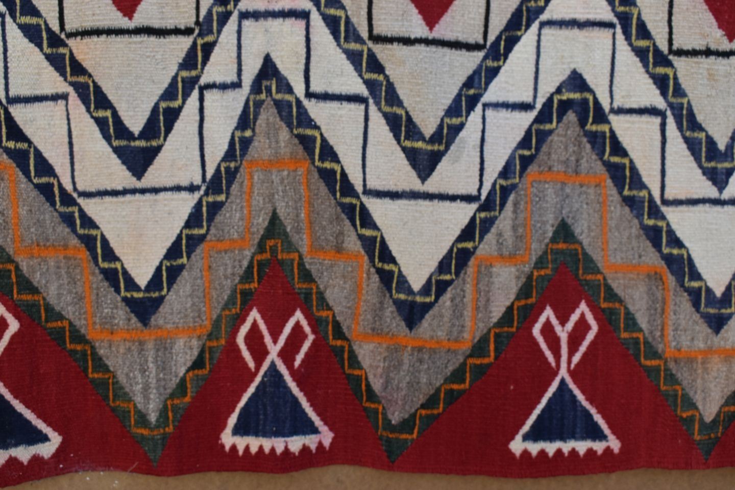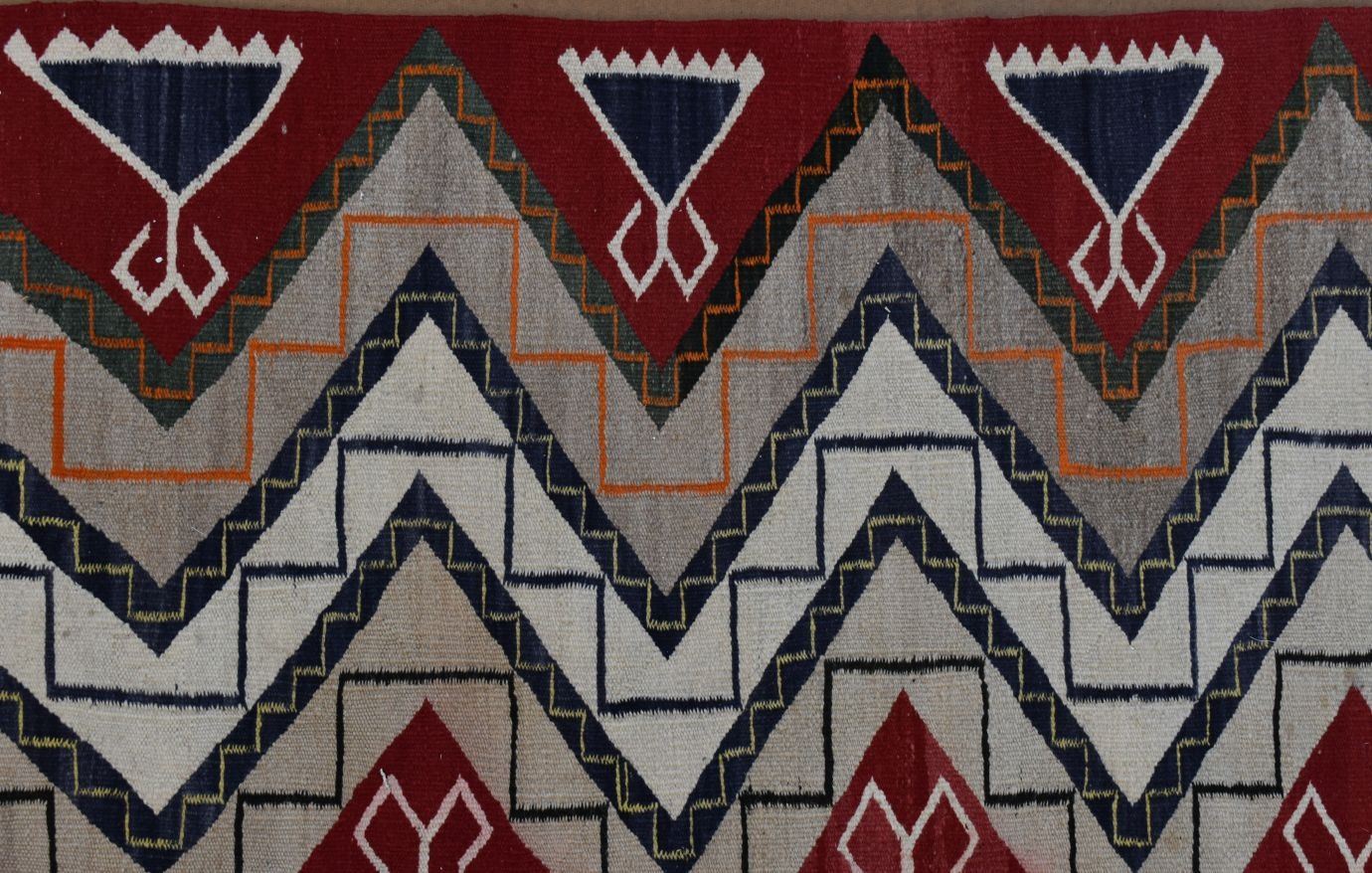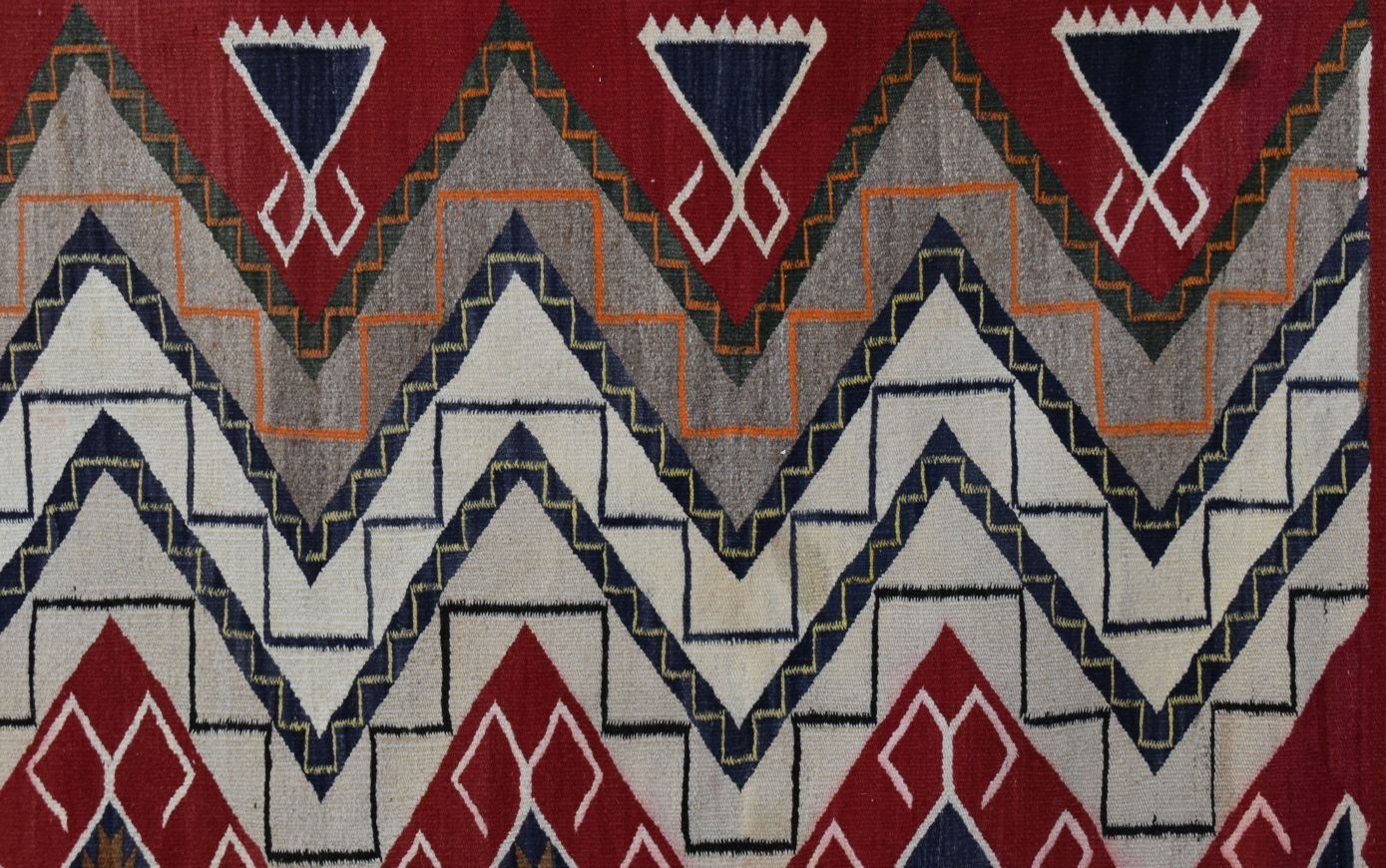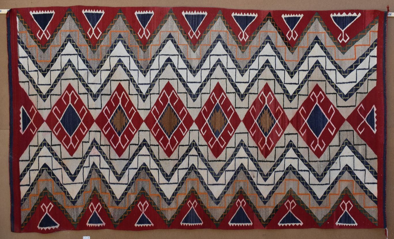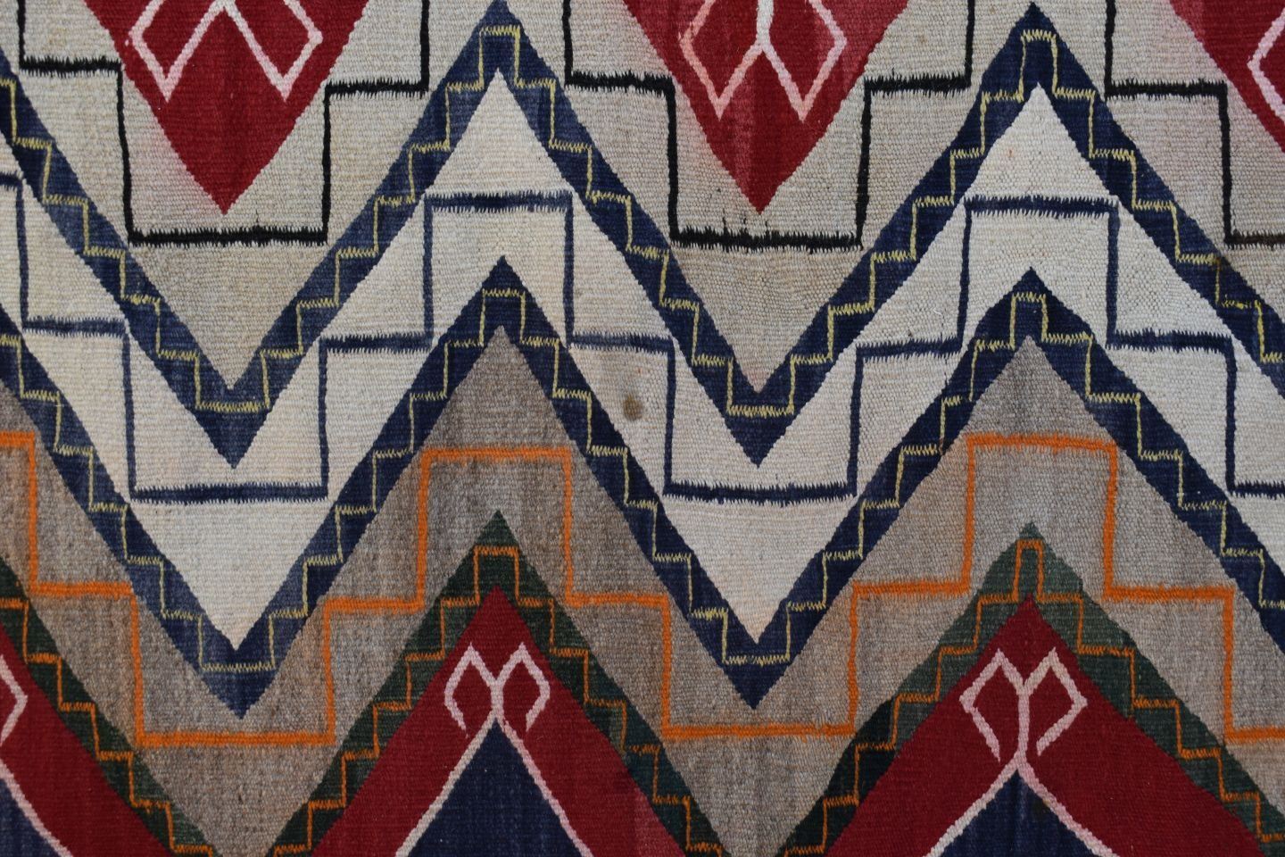 1930's Navajo, hand woven busy geometric and teepee design 82" x 48" is dirty and has minor bleed