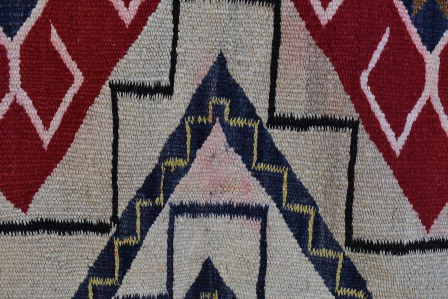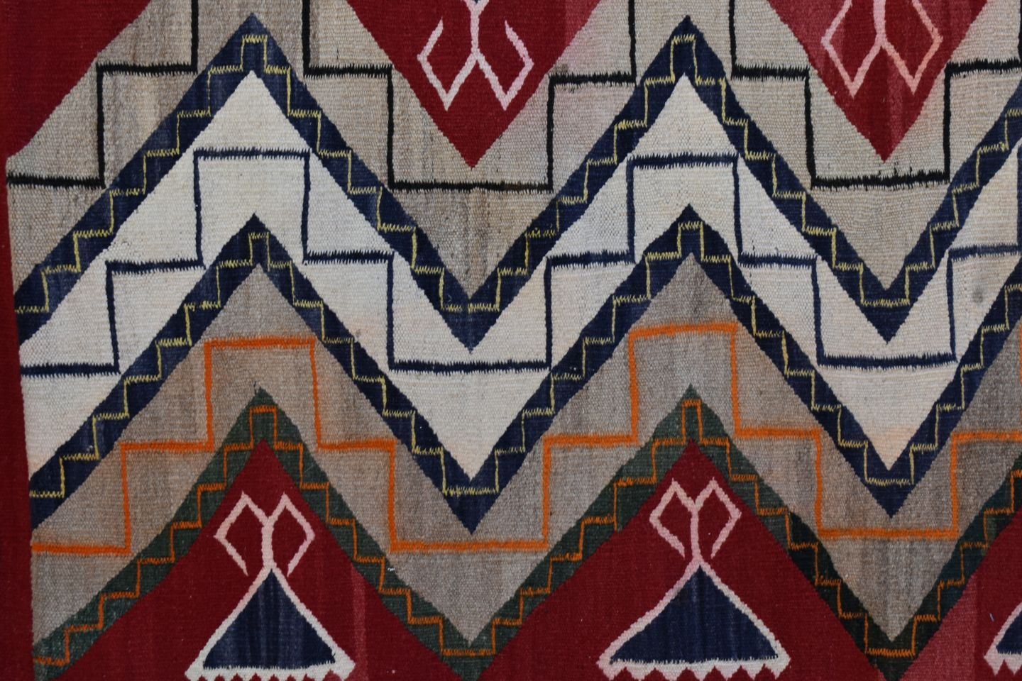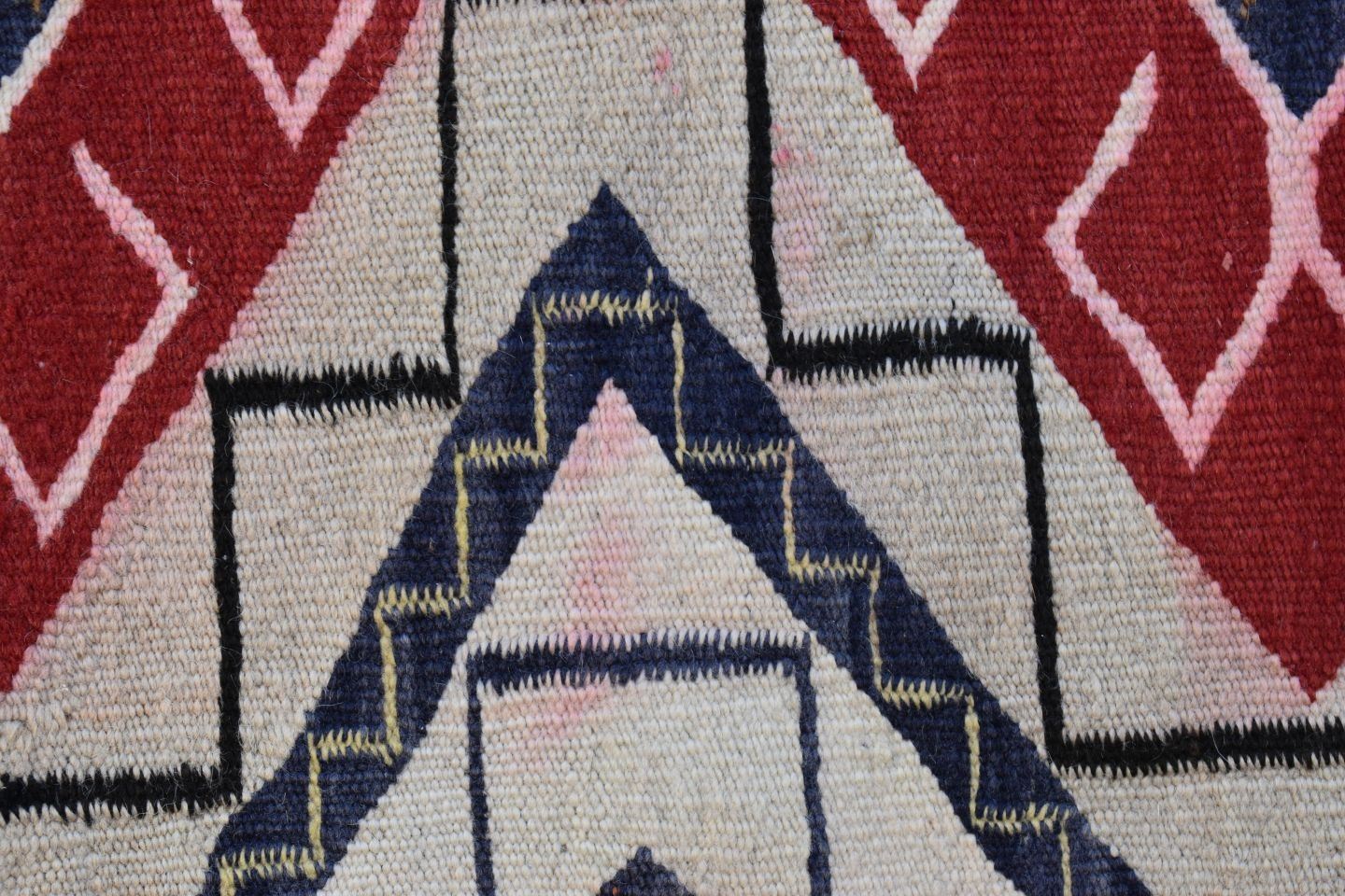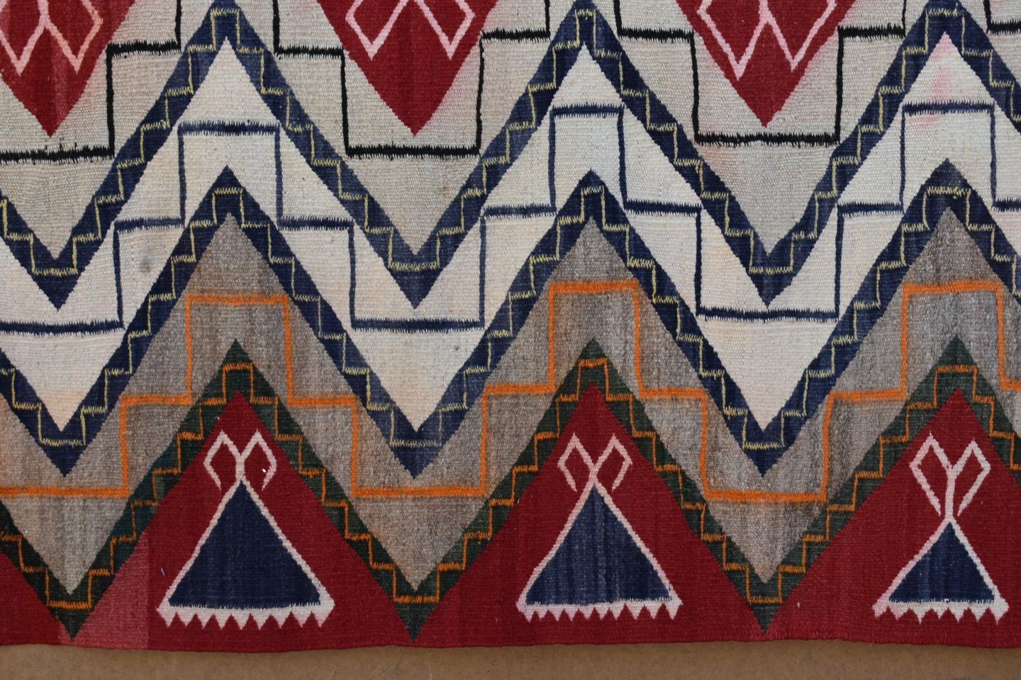 1930's Navajo, hand woven busy geometric and teepee design 82" x 48" is dirty and has minor bleed