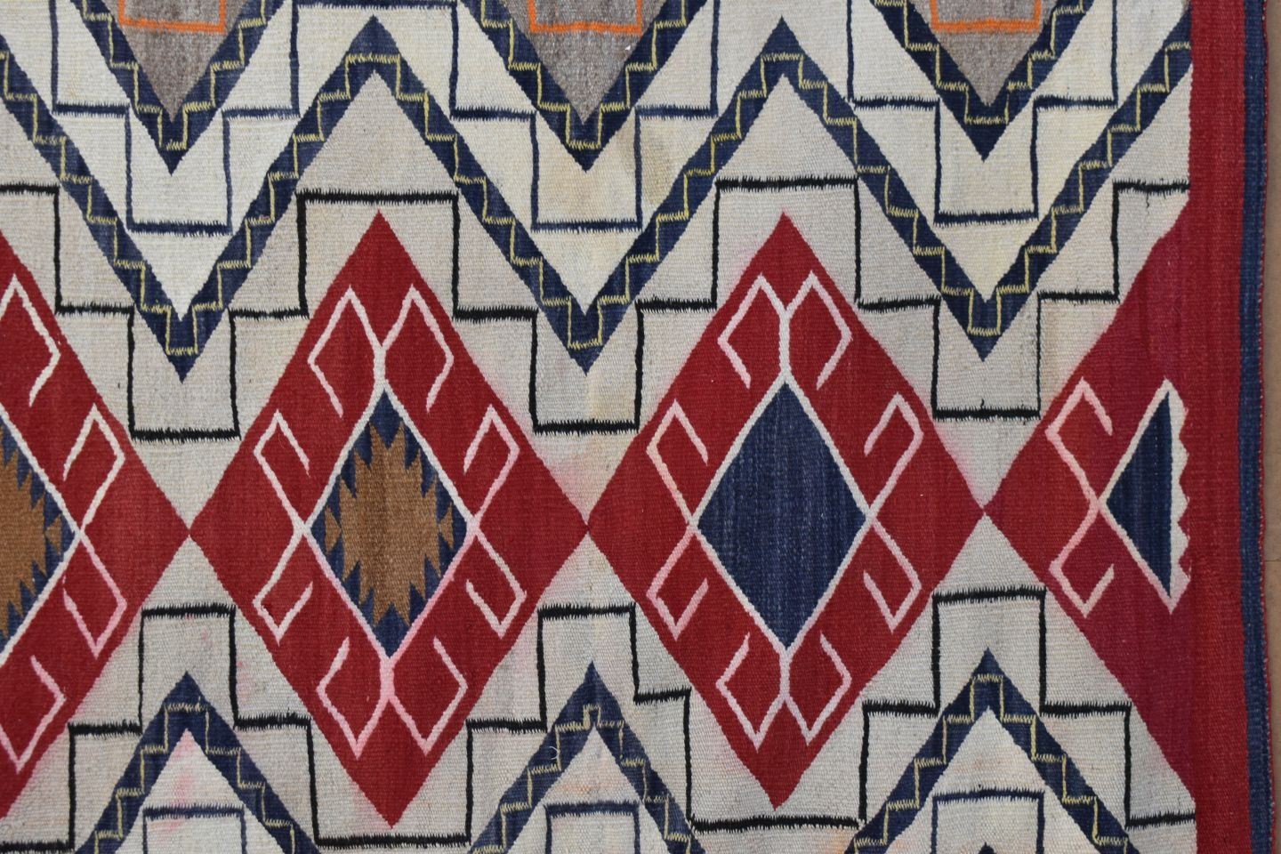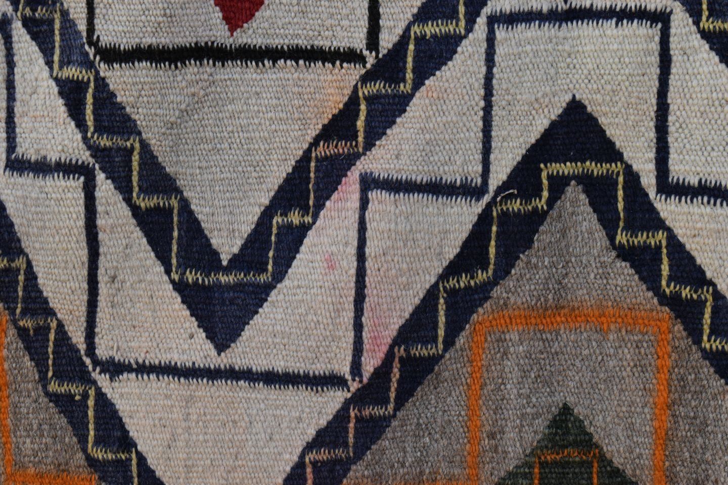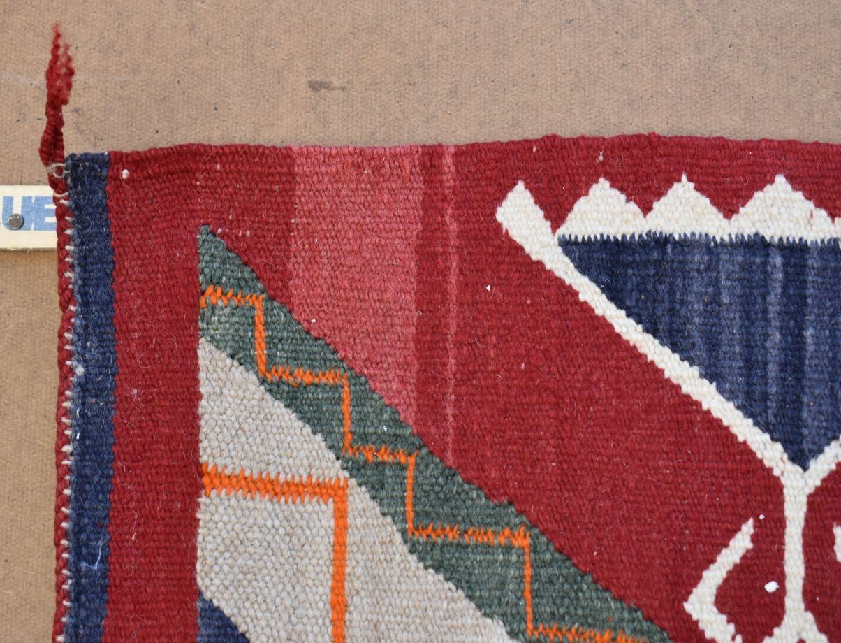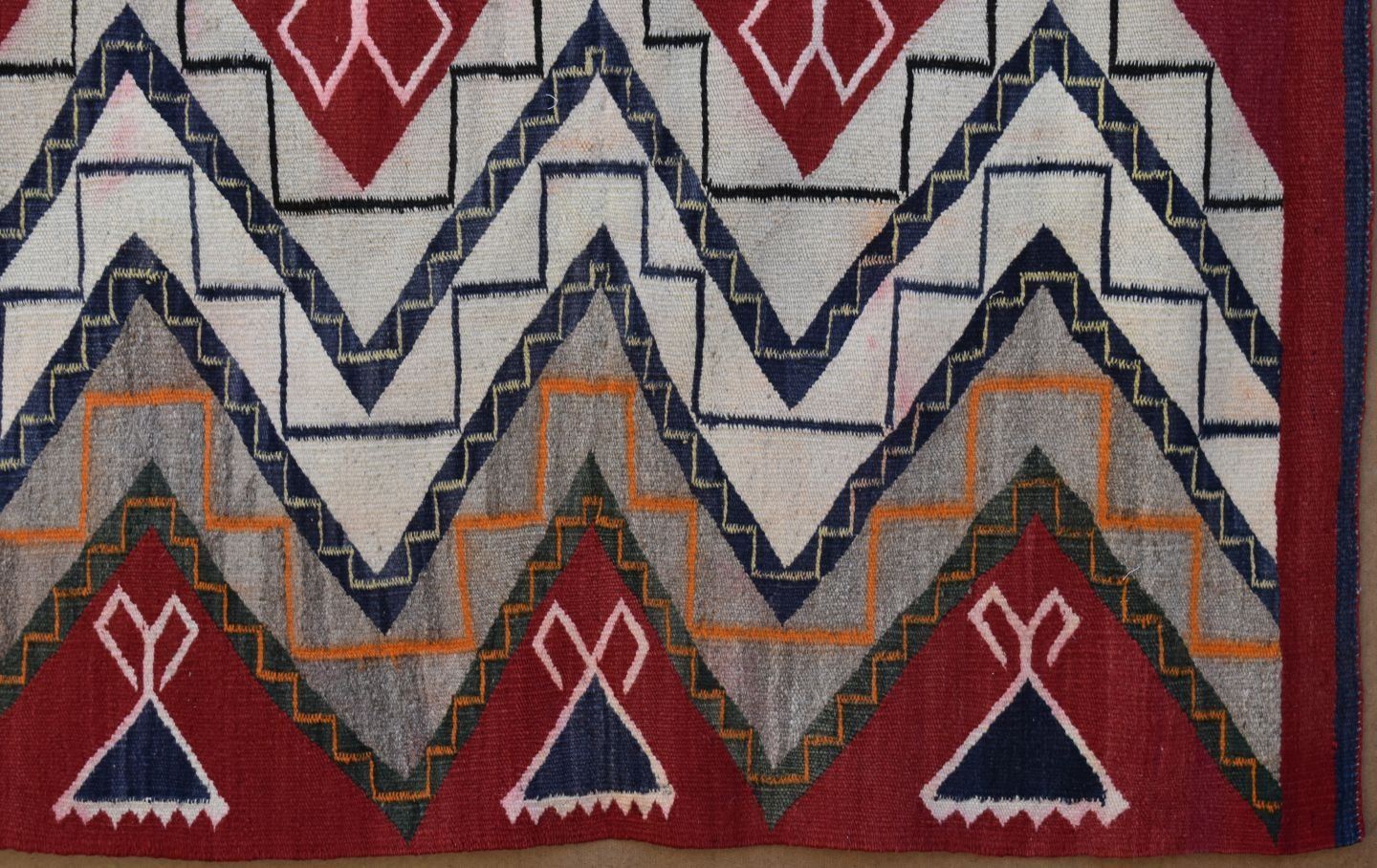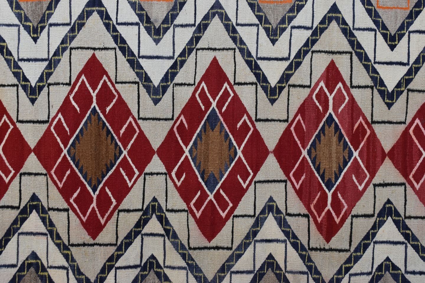 1930's Navajo, hand woven busy geometric and teepee design 82" x 48" is dirty and has minor bleed