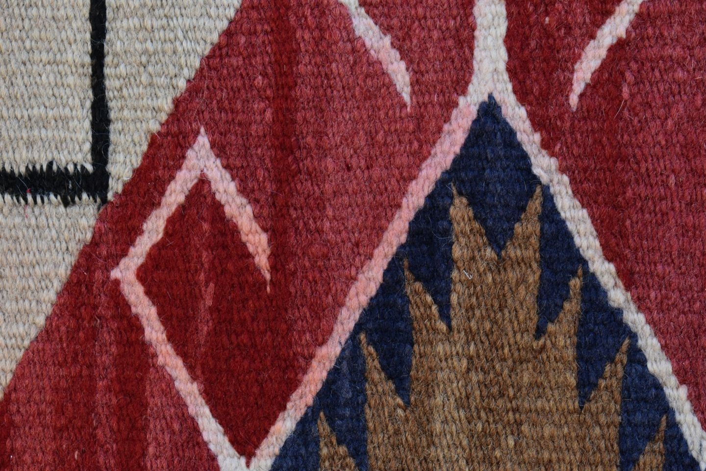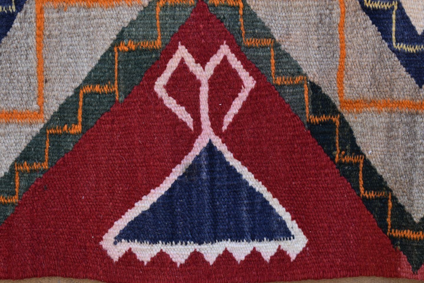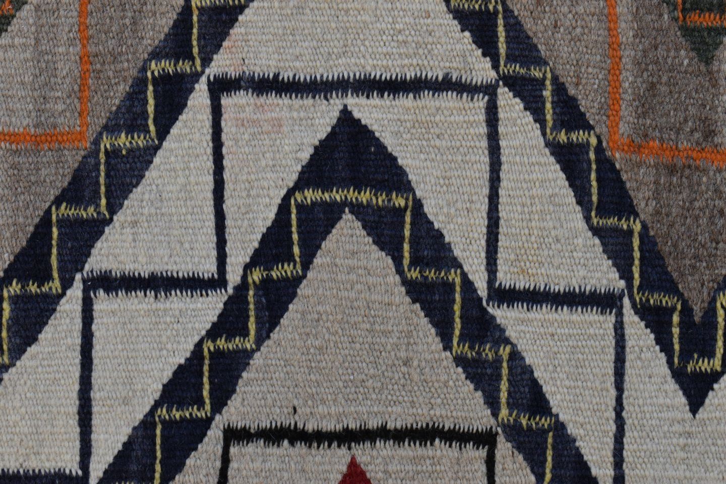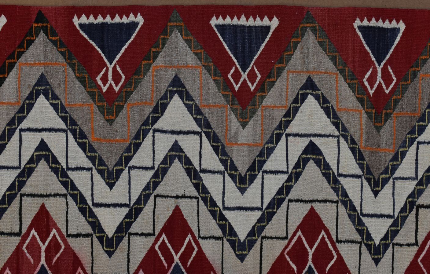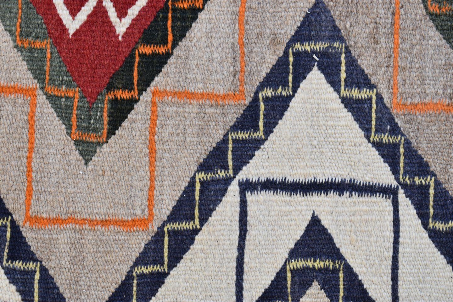 1930's Navajo, hand woven busy geometric and teepee design 82" x 48" is dirty and has minor bleed