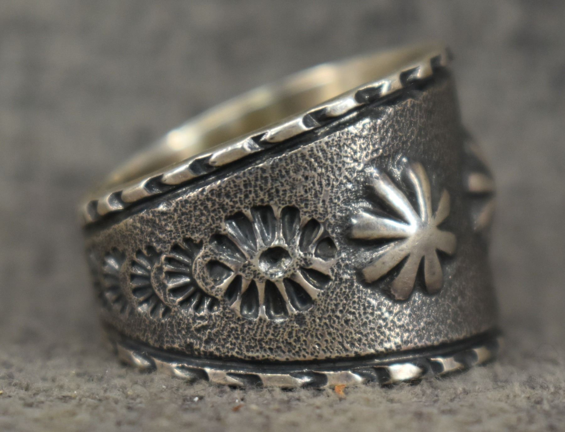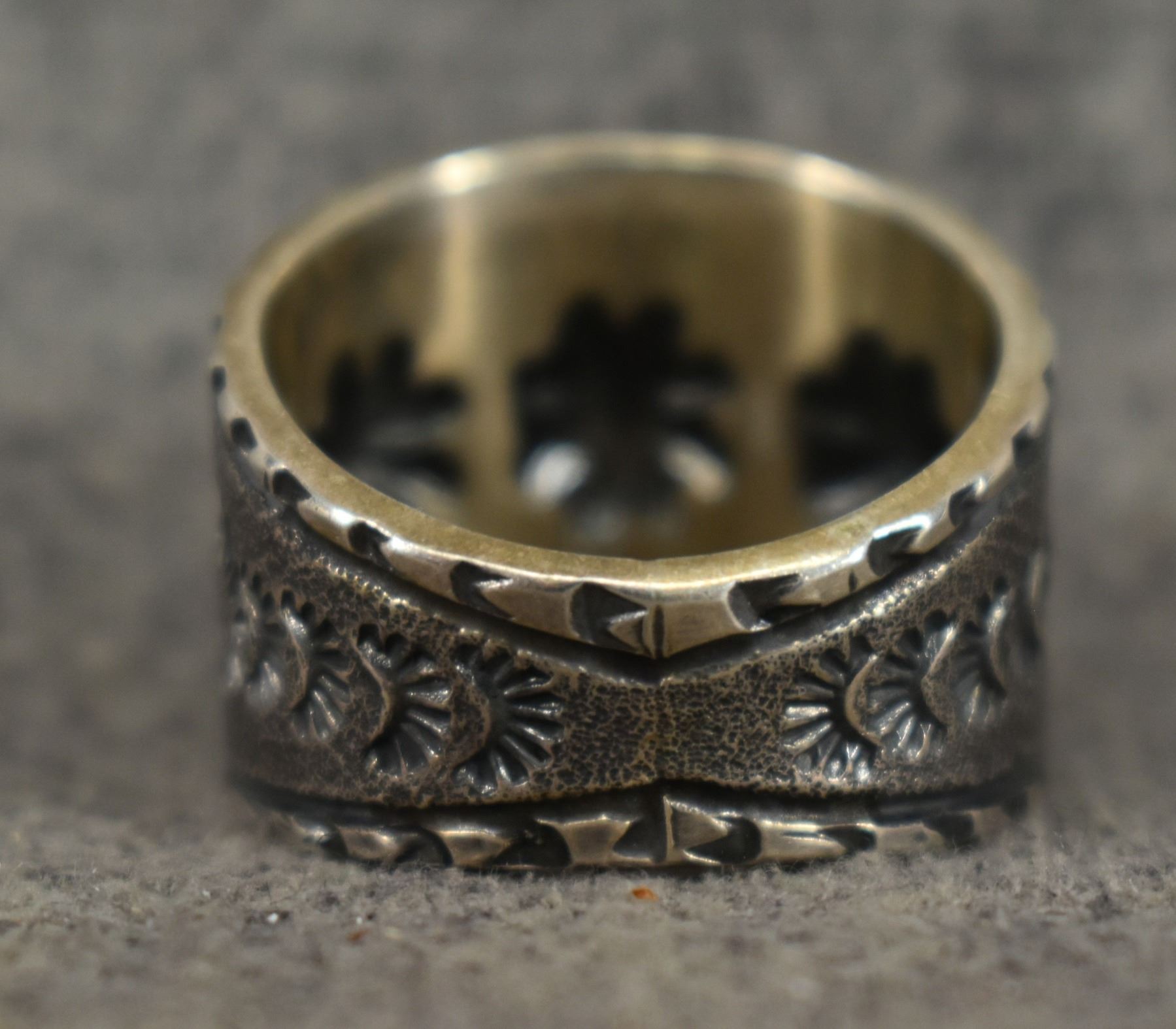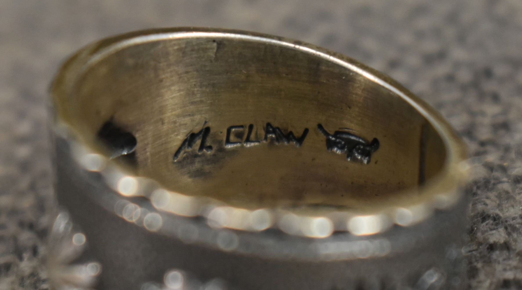 1990's Navajo. Sterling silver tufa cast geometric ring size 12. signed M Claw with owl hallmark total weight 18 grams