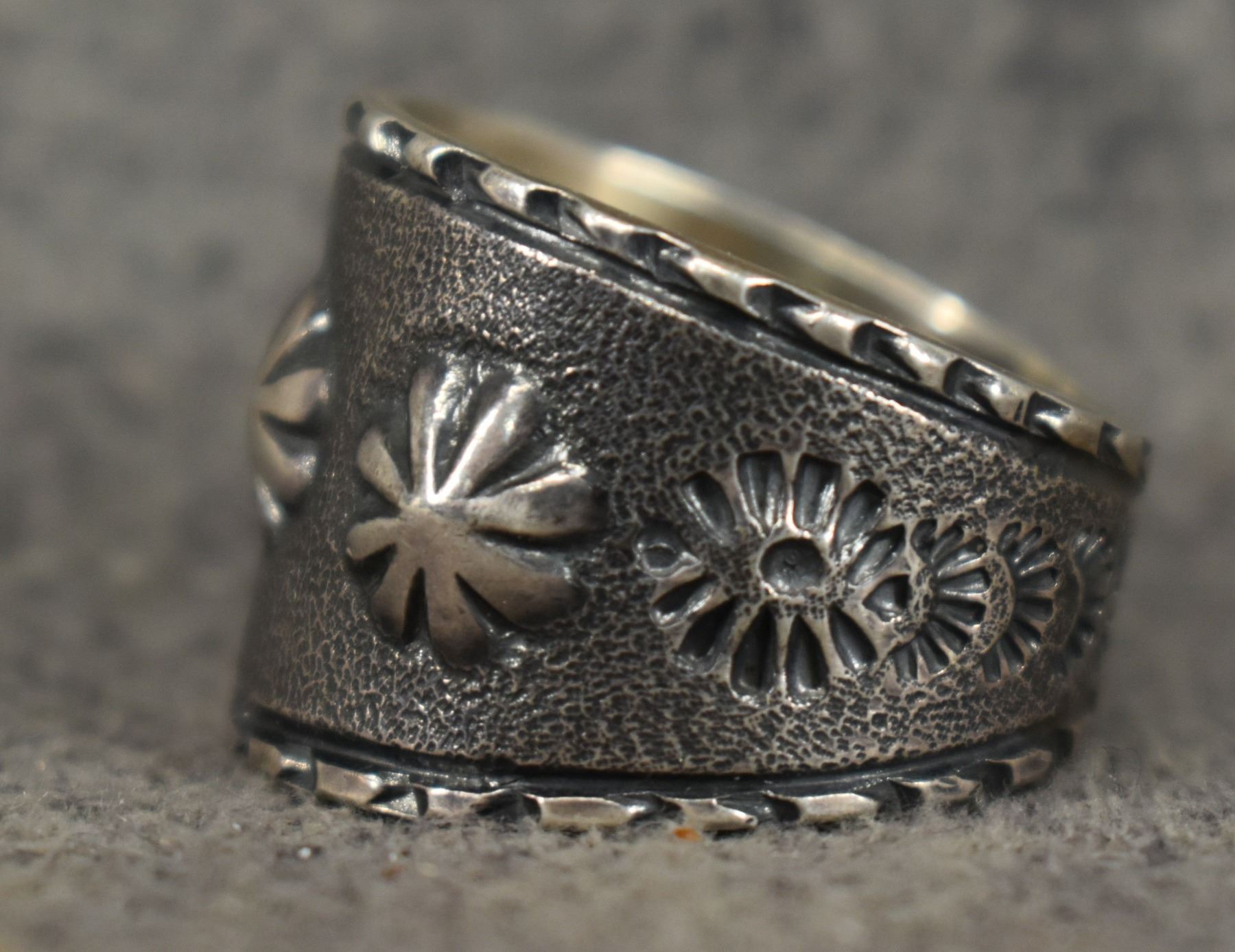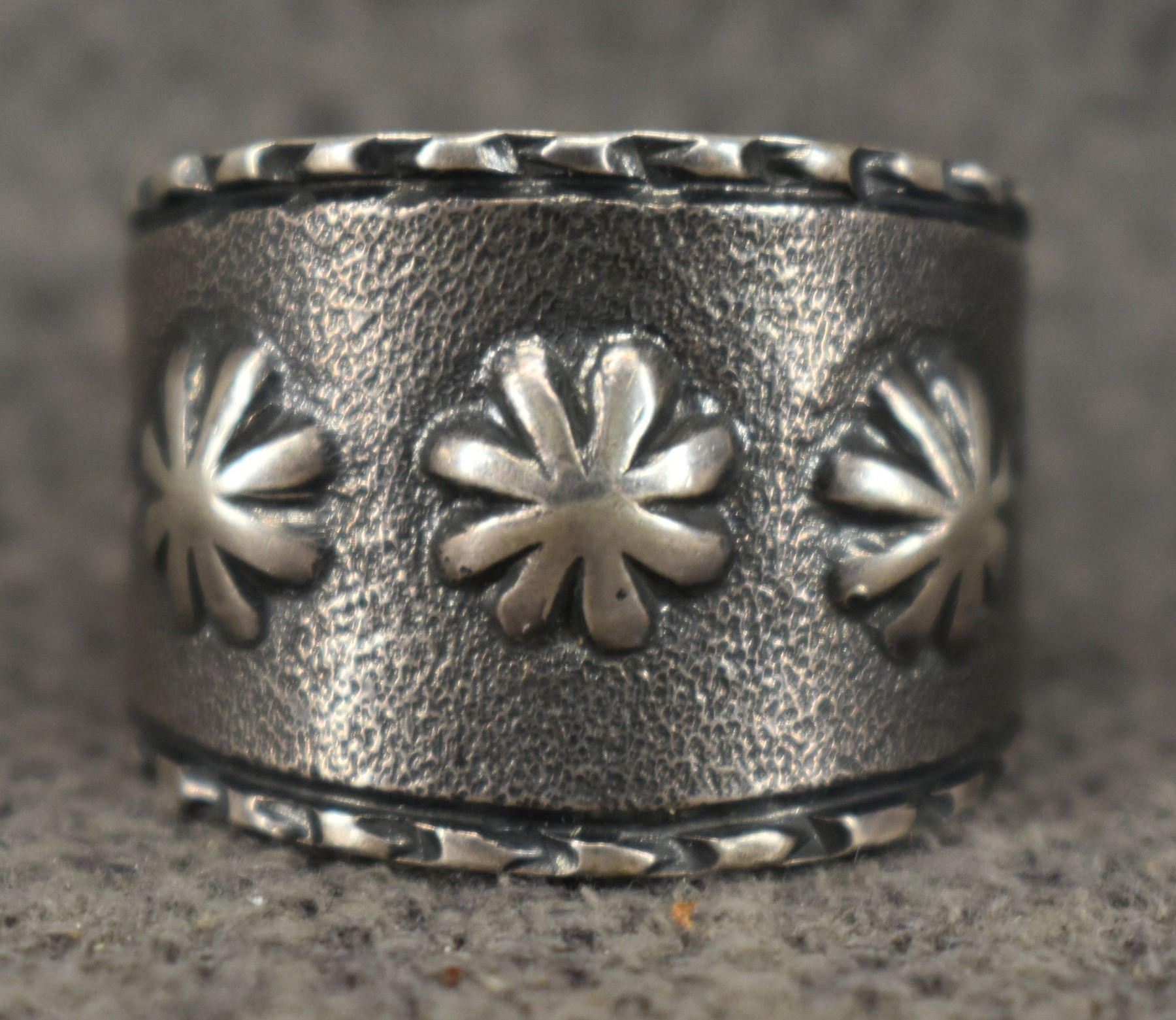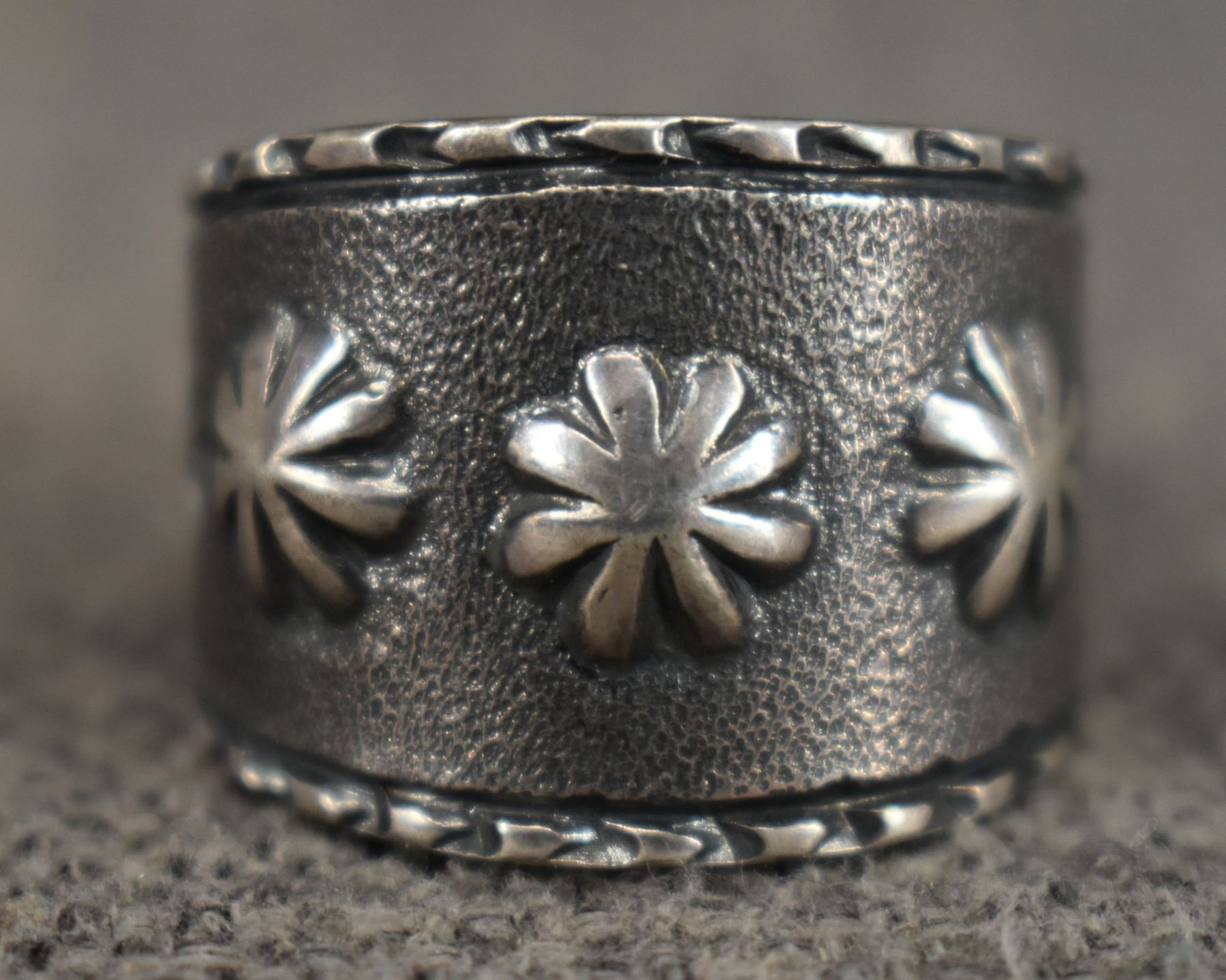 1990's Navajo. Sterling silver tufa cast geometric ring size 12. signed M Claw with owl hallmark total weight 18 grams