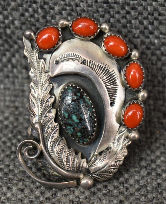1980-90's Navajo, sterling silver leaf applique with stamped design has turquoise and coral stones signed with hallmark and Whirling Wind for Ray Morton 1.75" x 1.25" size 7.5 total weight 15 grams