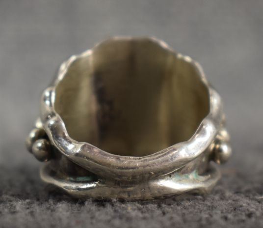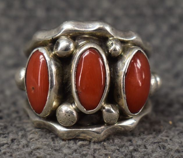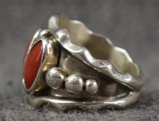 1990-2000's Navajo, sterling silver with coral signed with bear logo and R.B. size 6.5 total weight 9 Grams