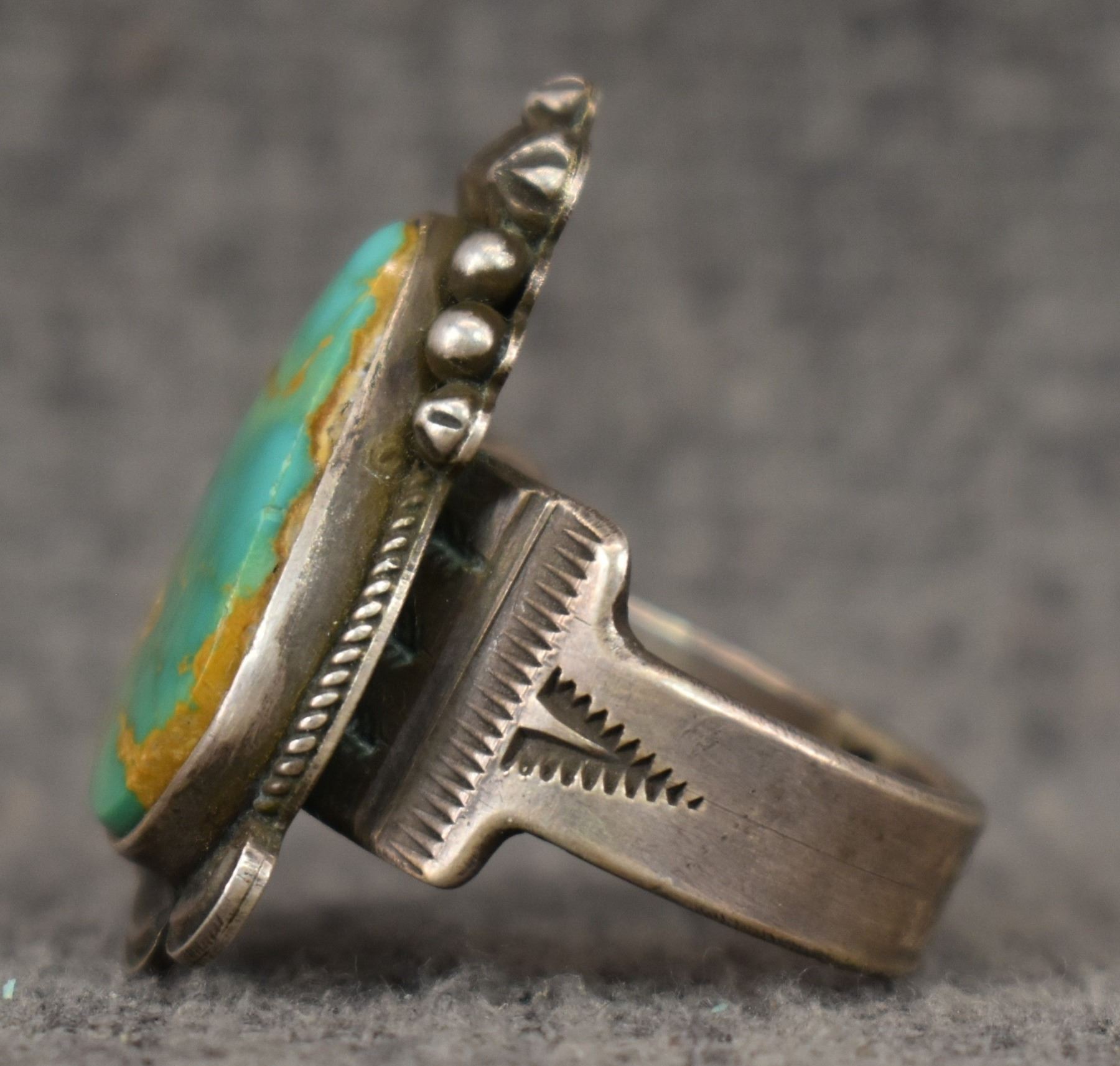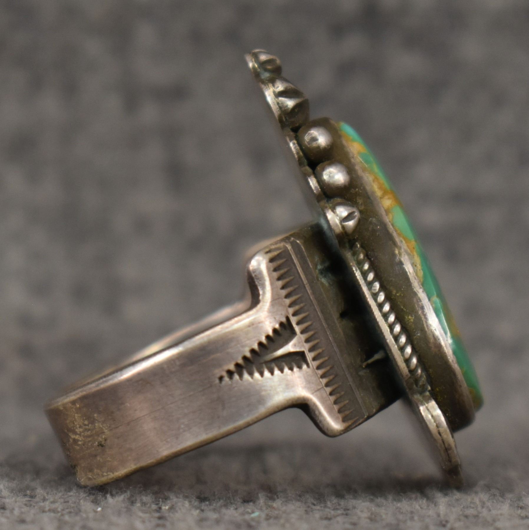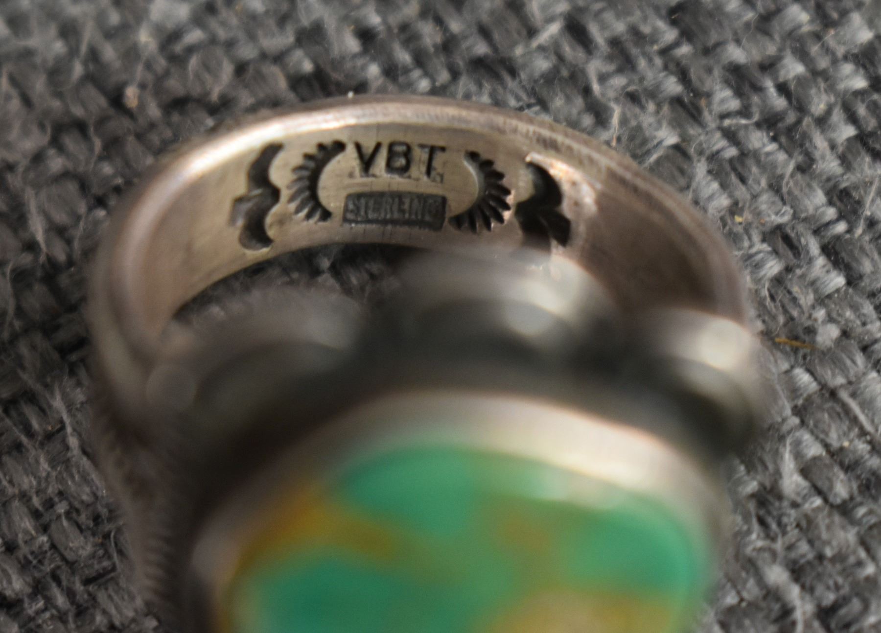 1990's Navajo, Sterling silver stamped design with turquoise stone signed VTB for Vernon Tracy. 1.25" x .75" size 9 total weight 15 grams