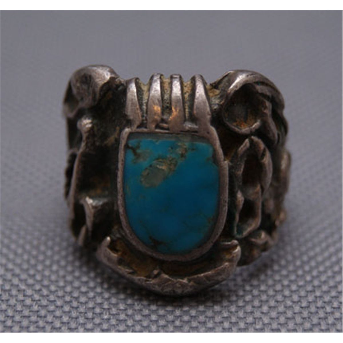 1970s sterling silver cast design with turquoise stone, has old repair, size 8