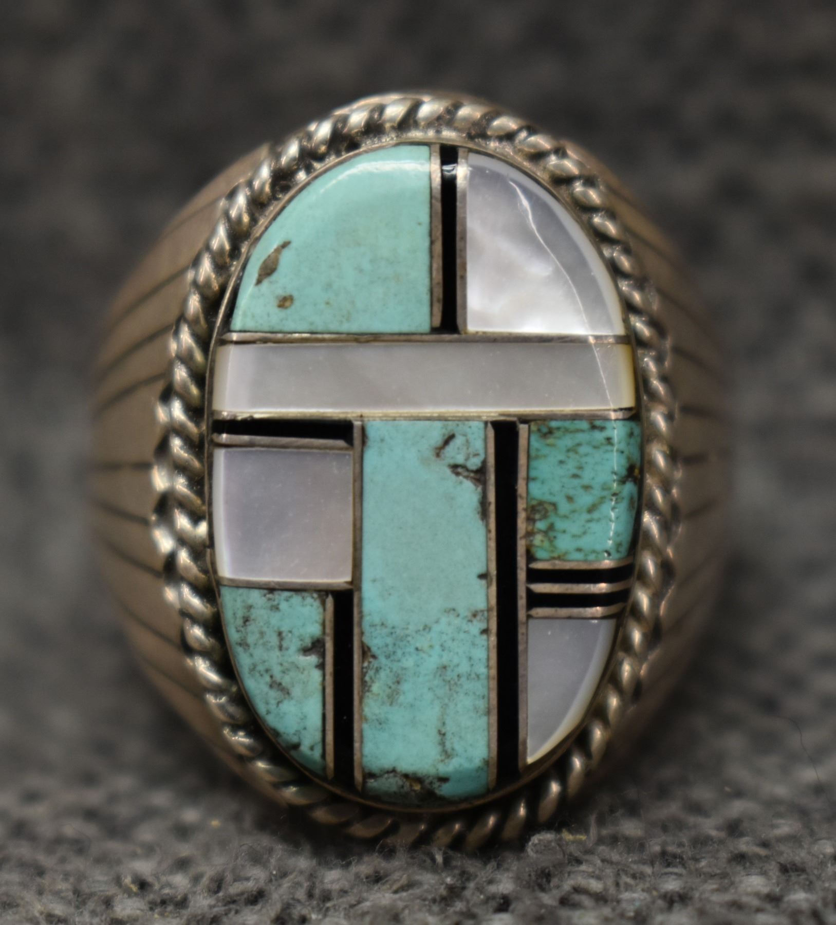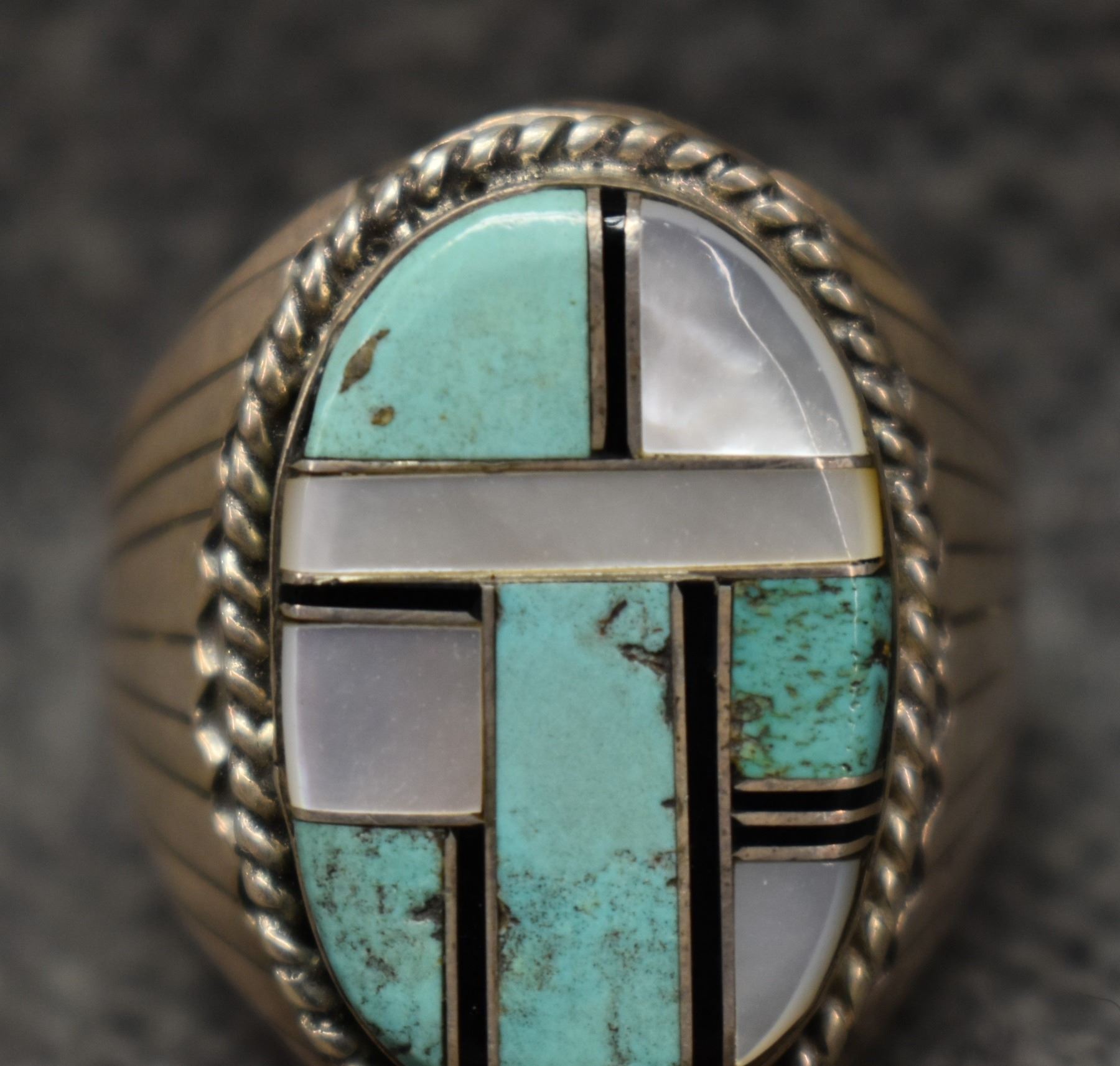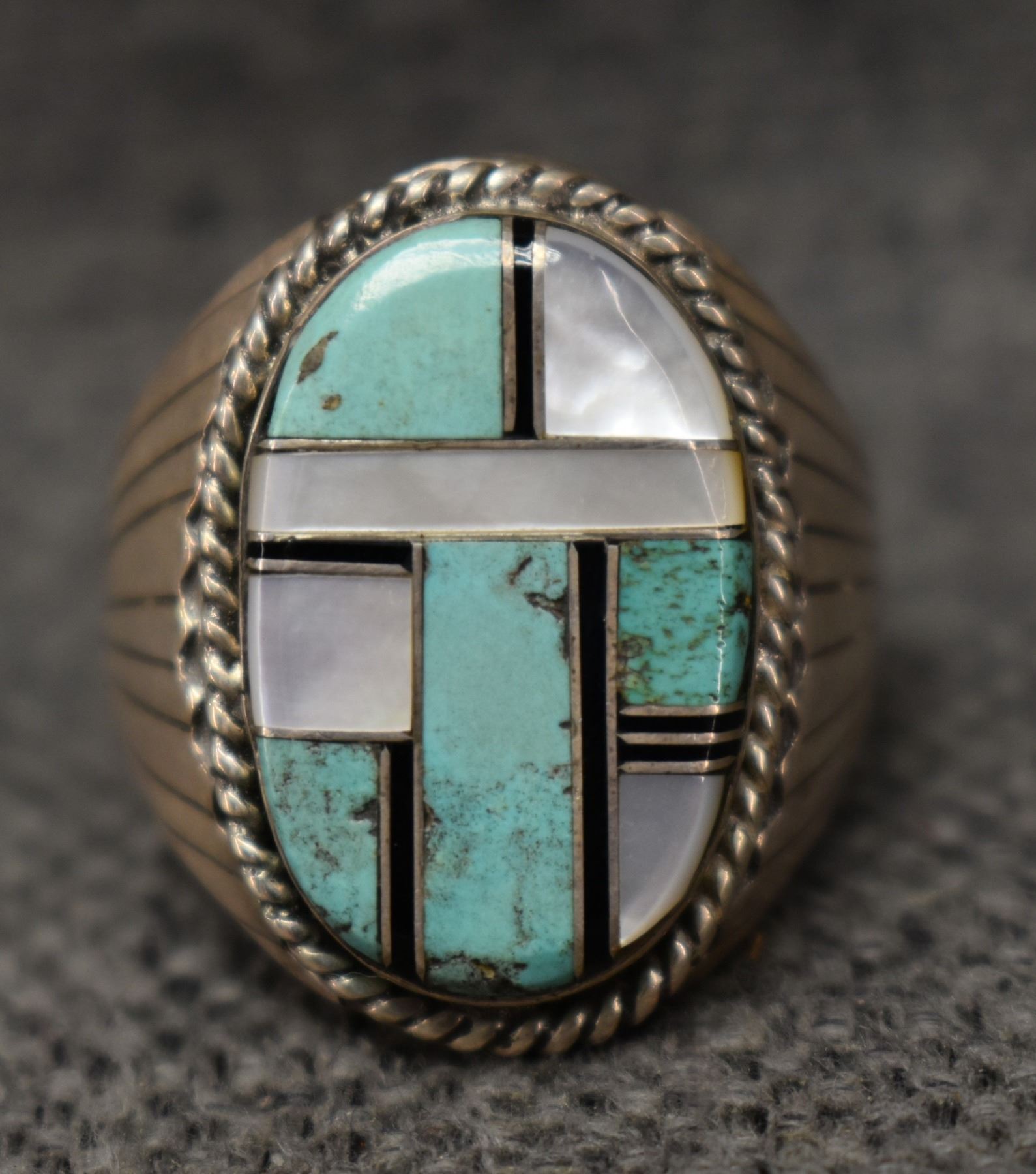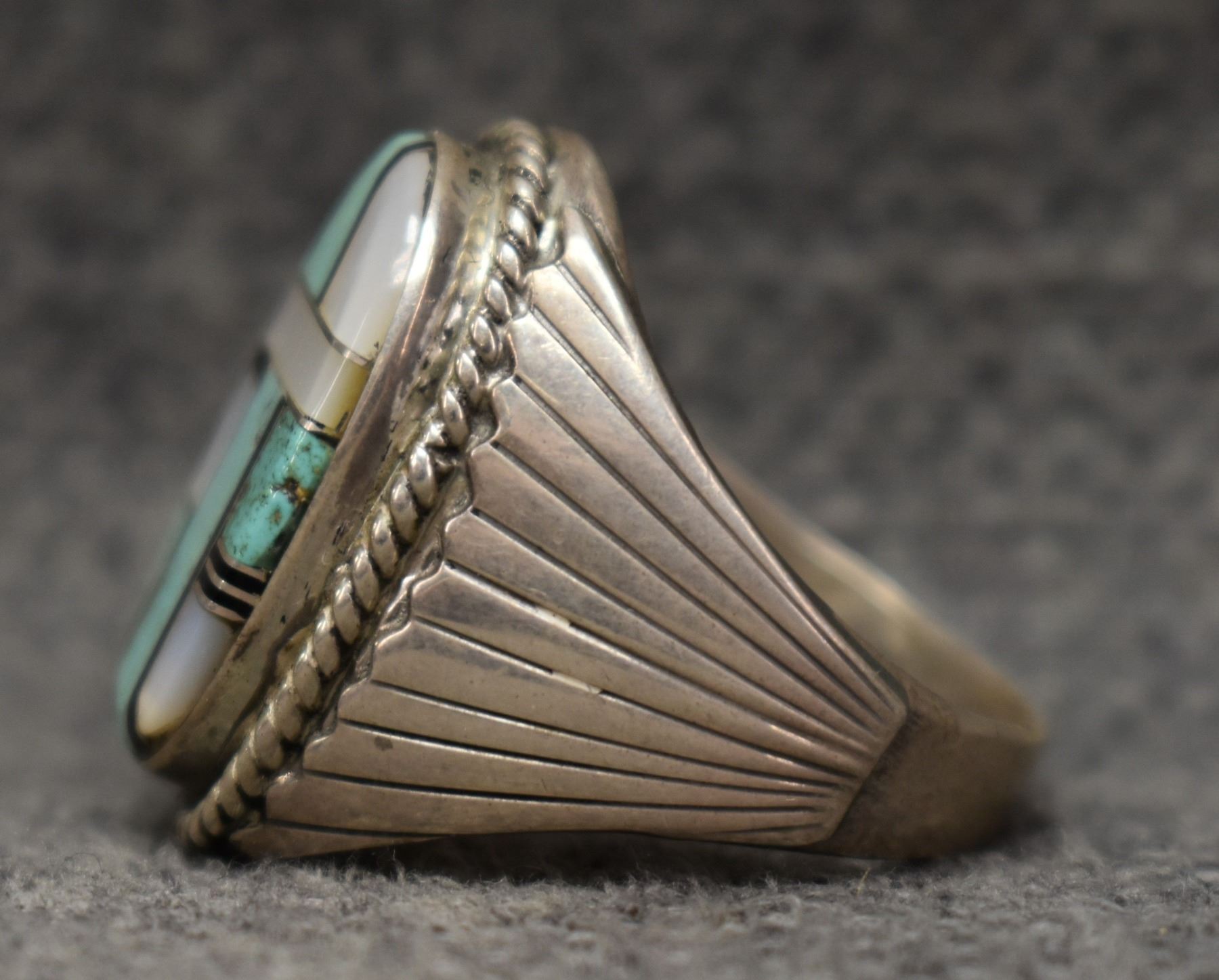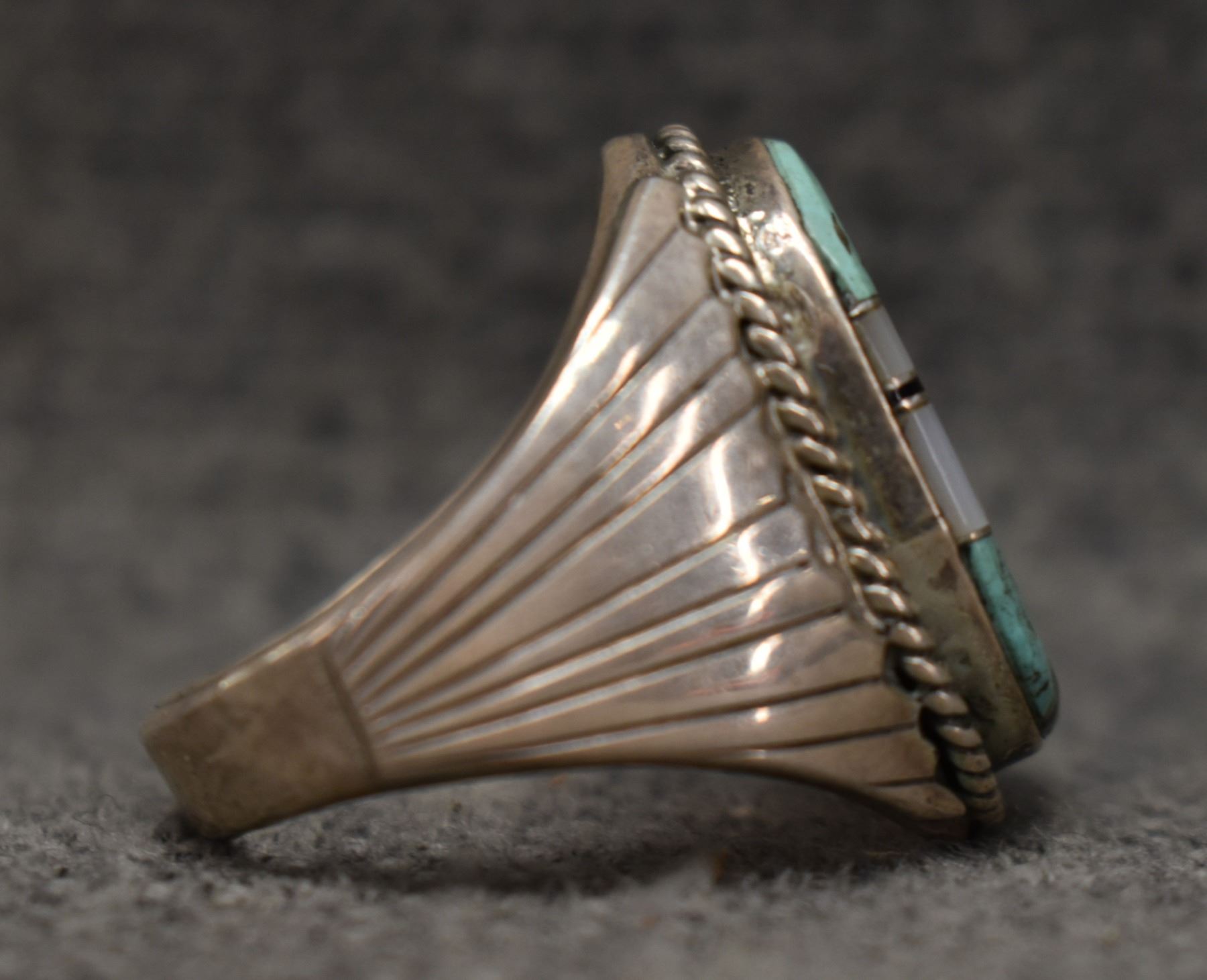 1980's Navajo. Sterling silver turquoise and shell ring, size 12.5. total weight 25 grams
