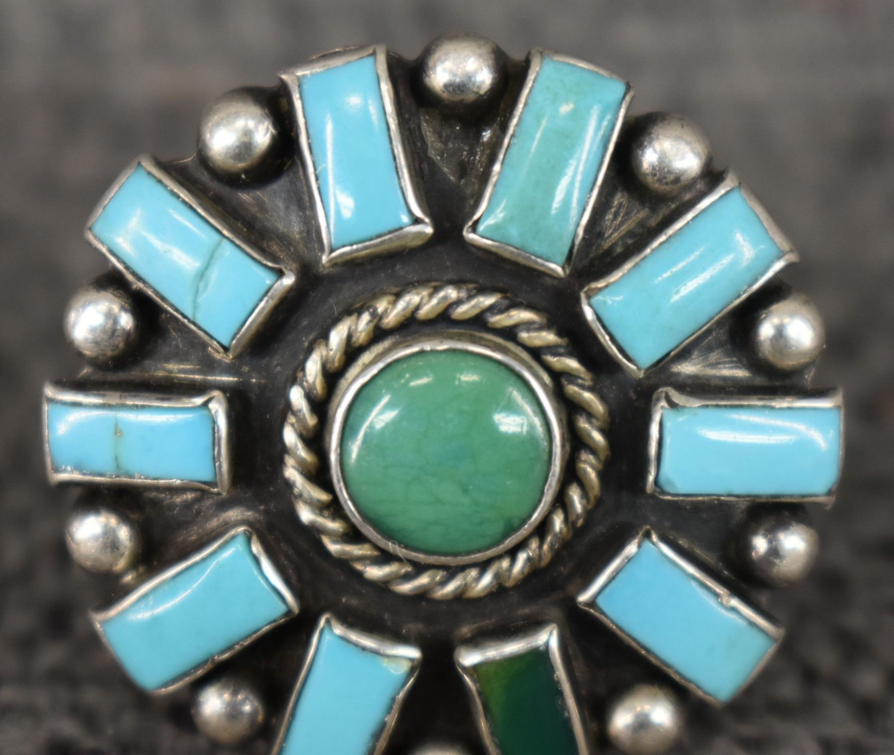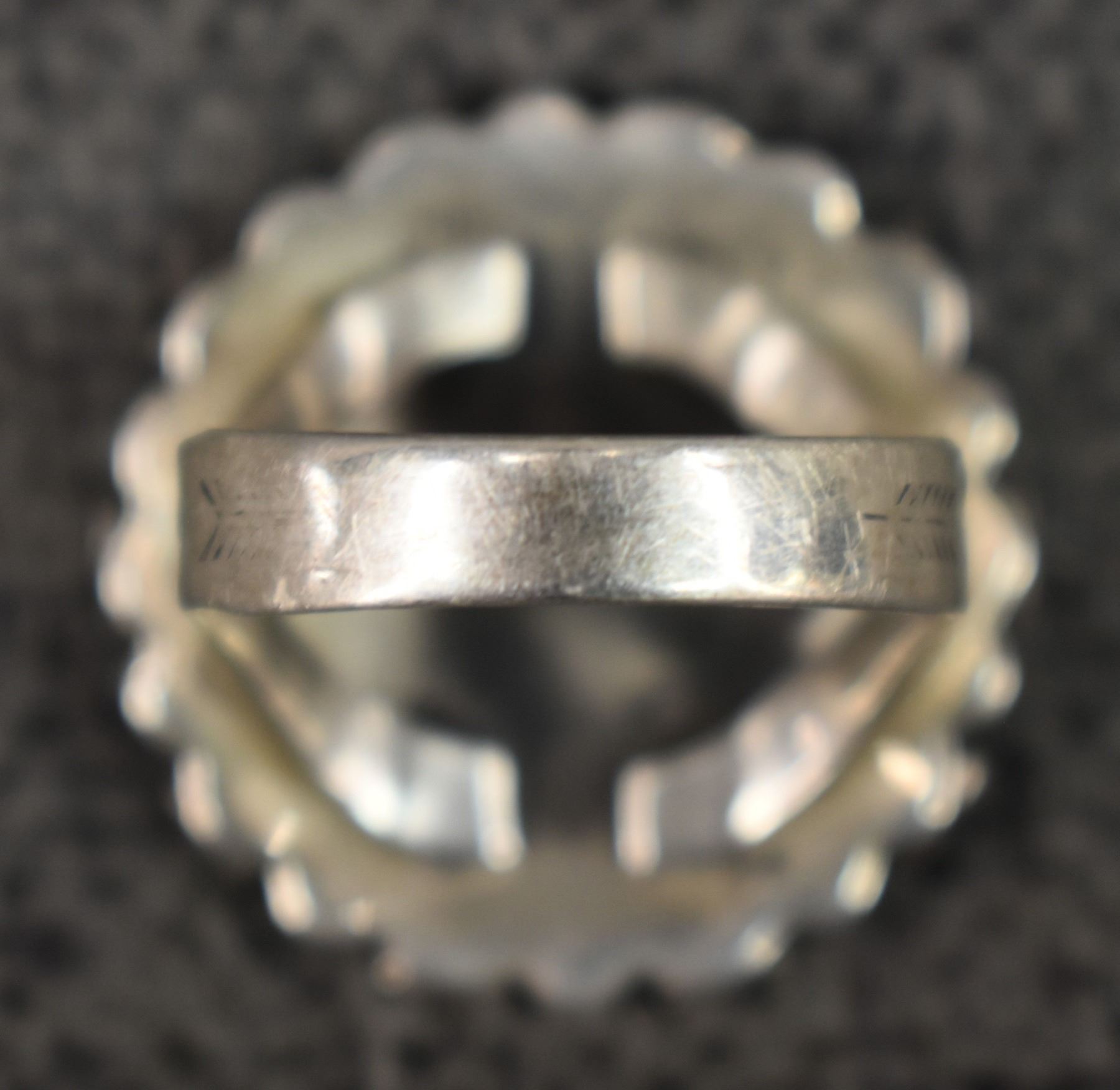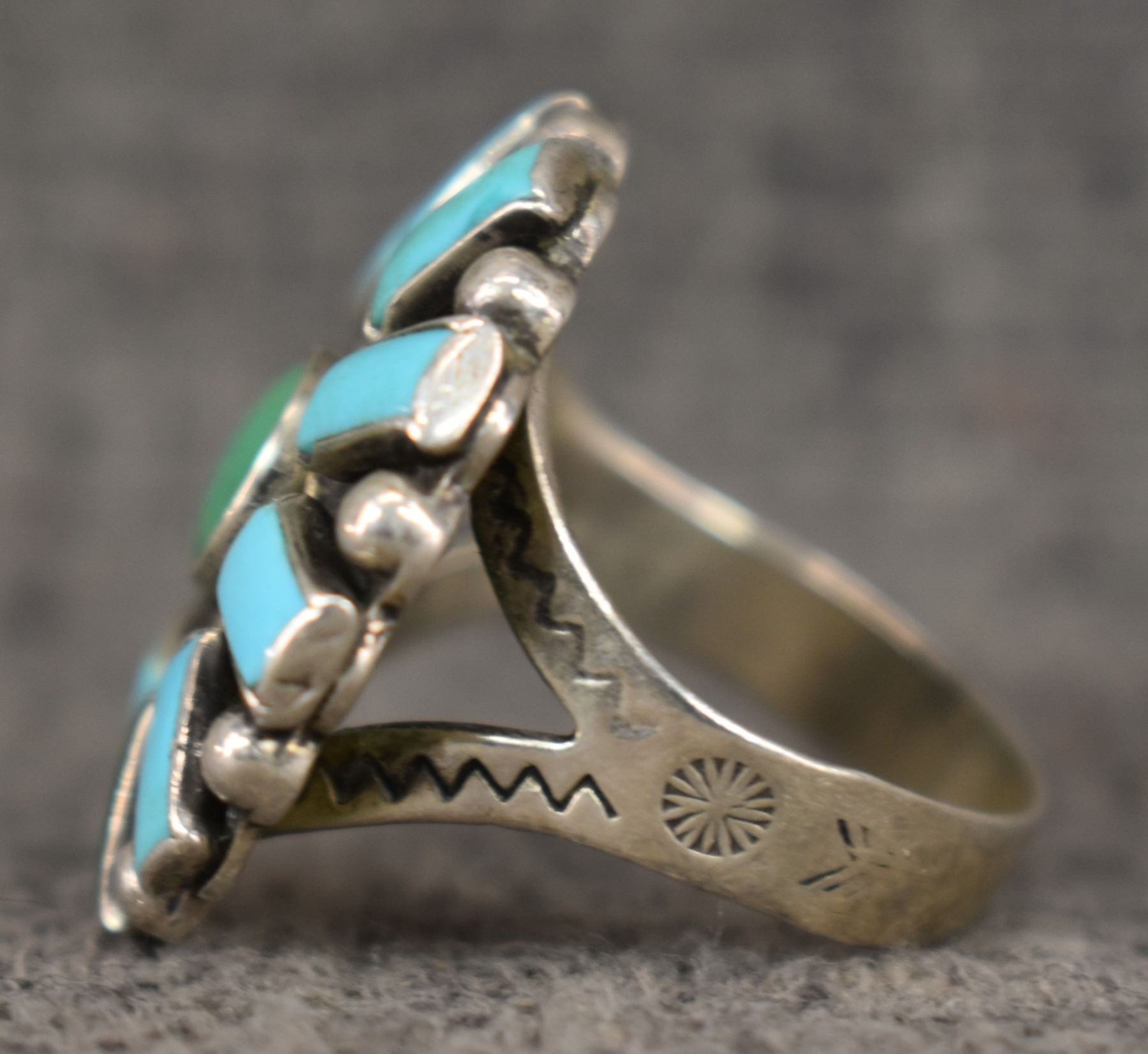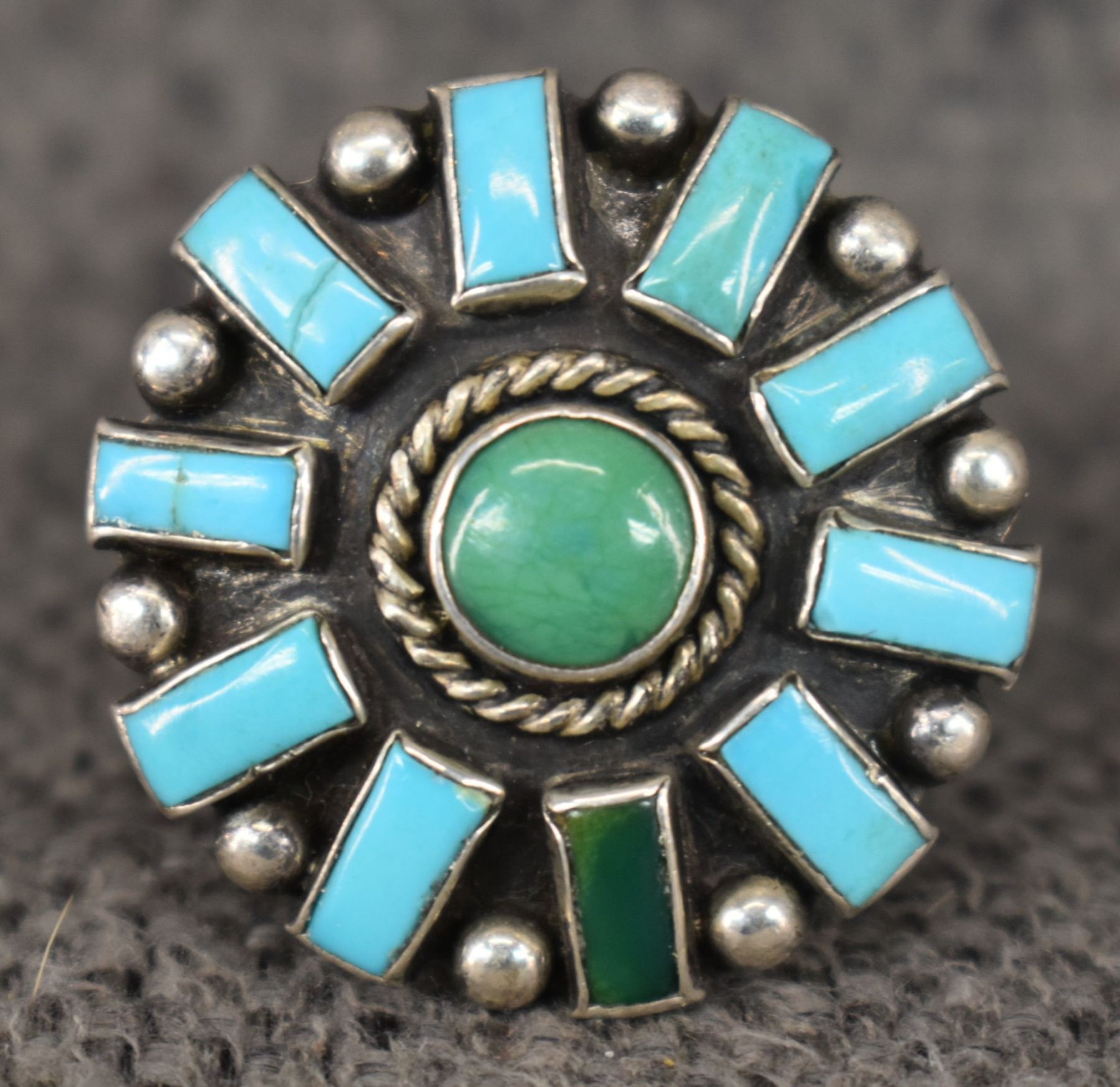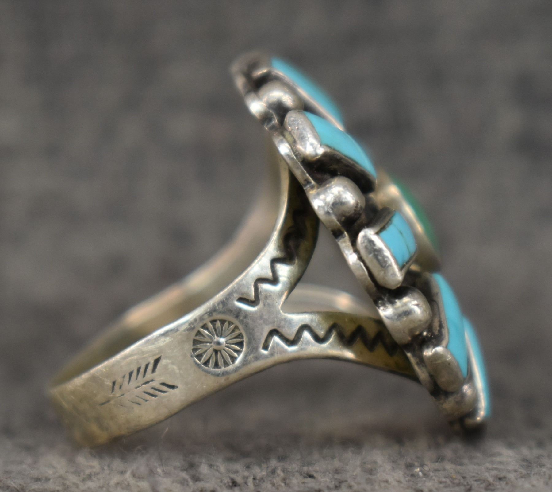 1960's Navajo, Sterling silver with stamped design and turquoise stones, 1" diameter size 8.5 total weight 10 grams