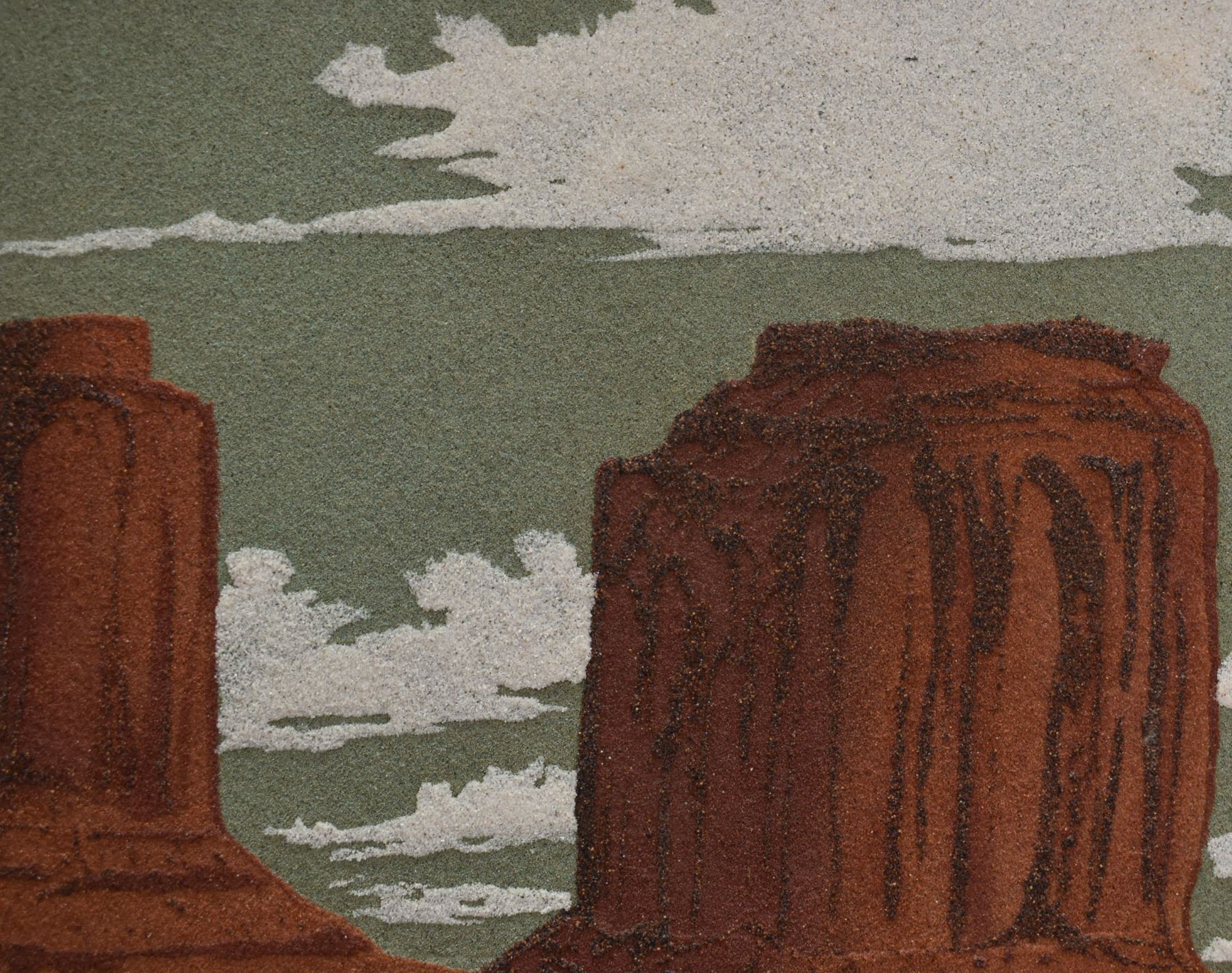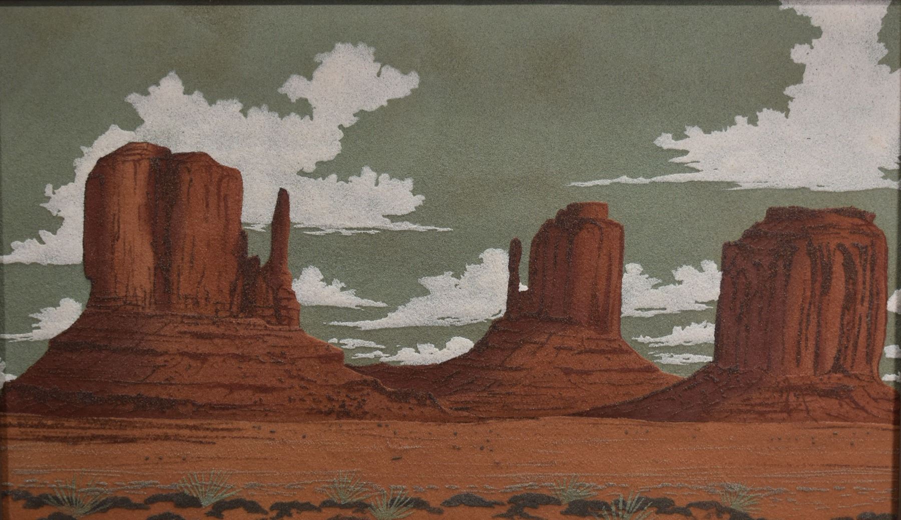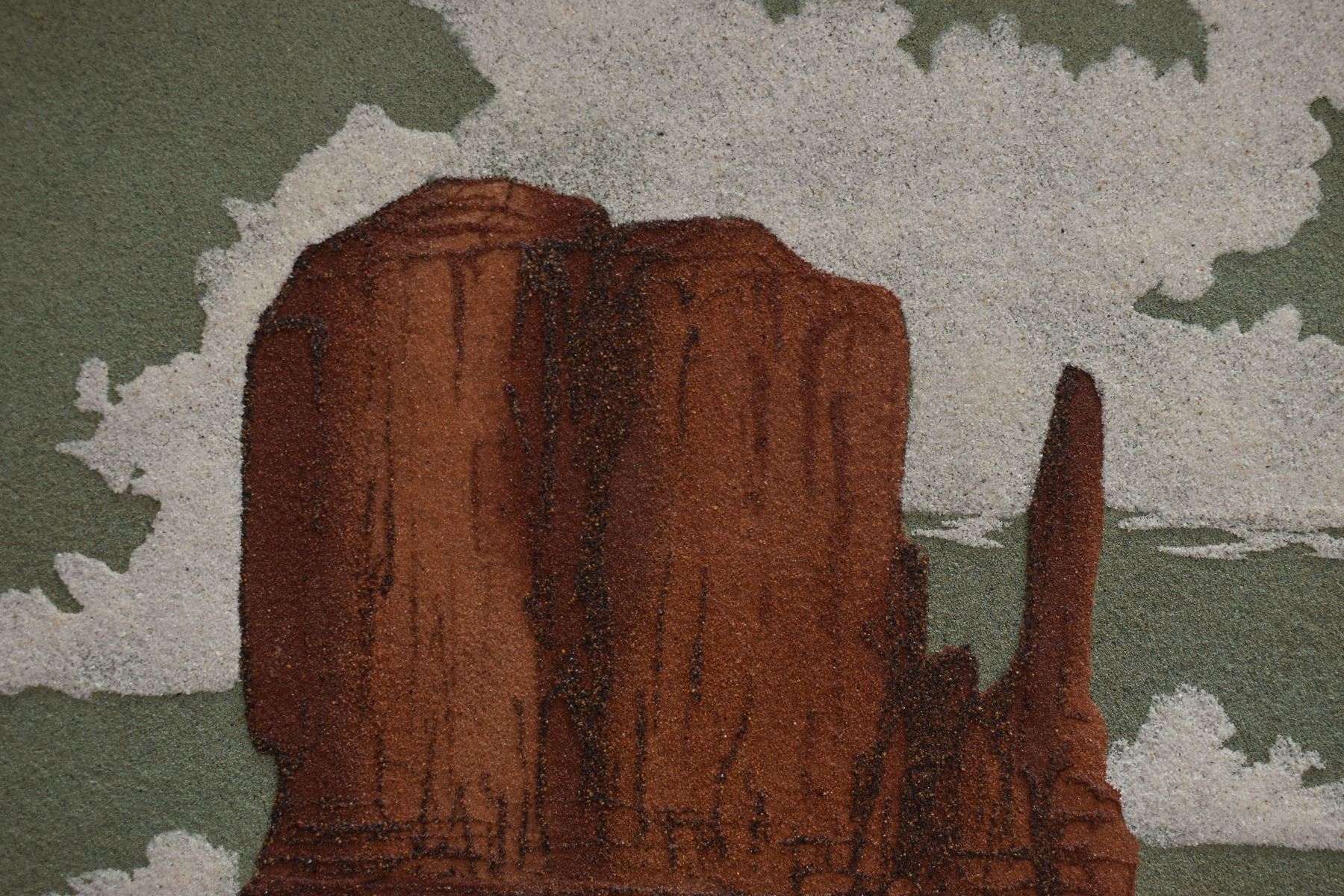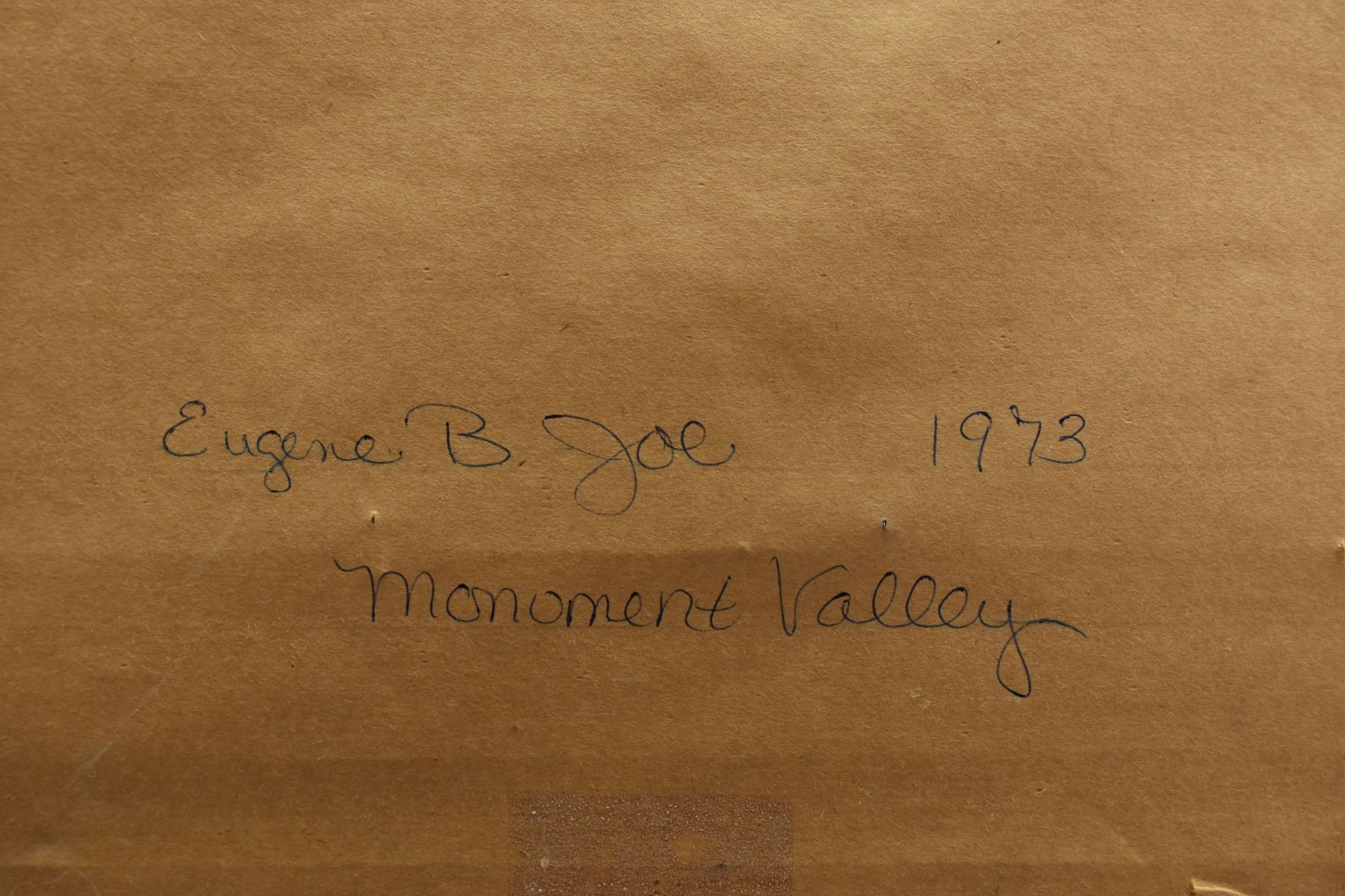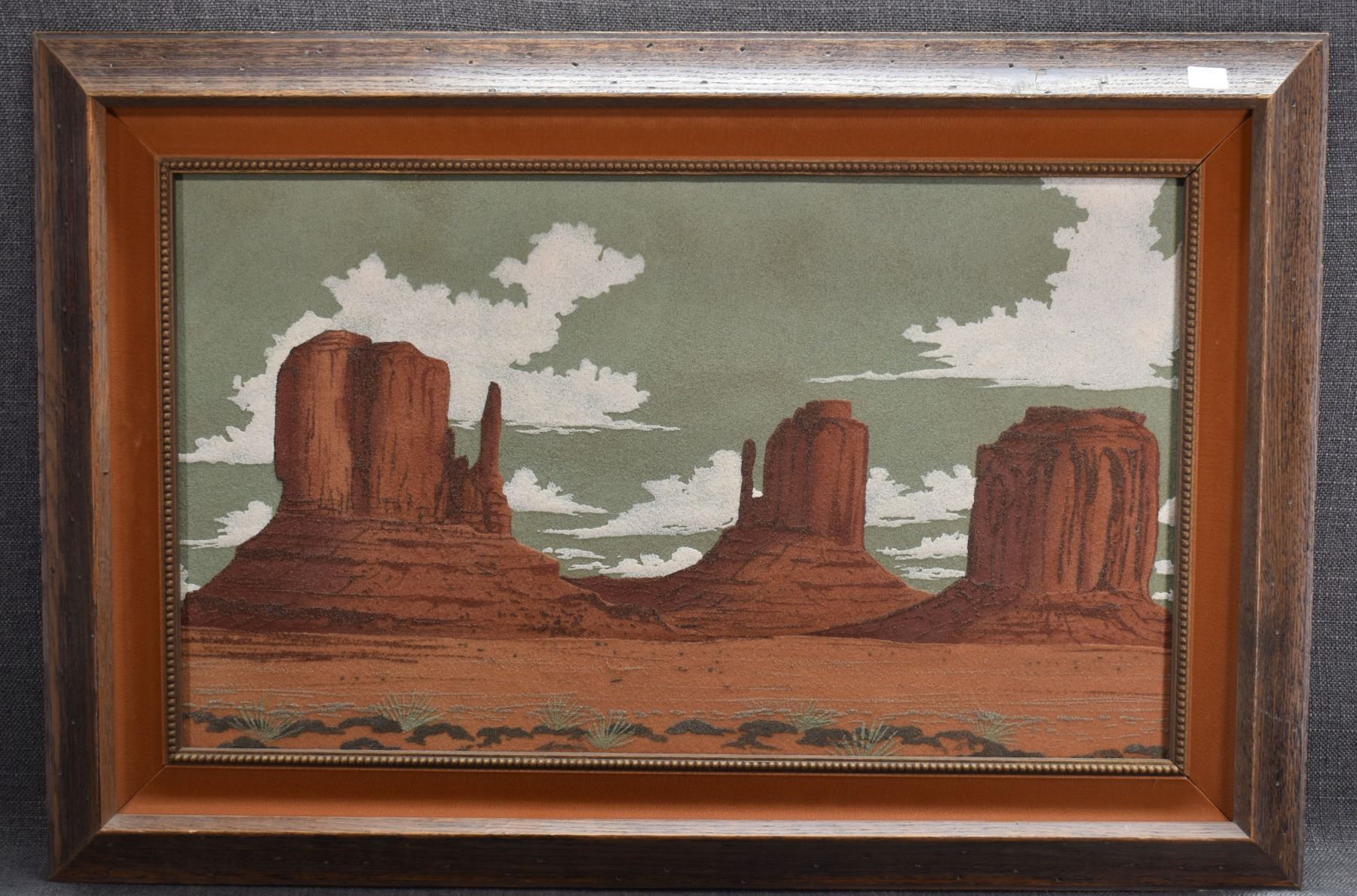 1973 Navajo sand painting depicting monument valley signed on back Eugene B Joe. Image 13.5" x 23" framed to 20" x 30"