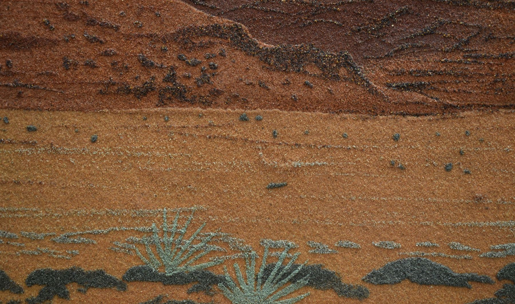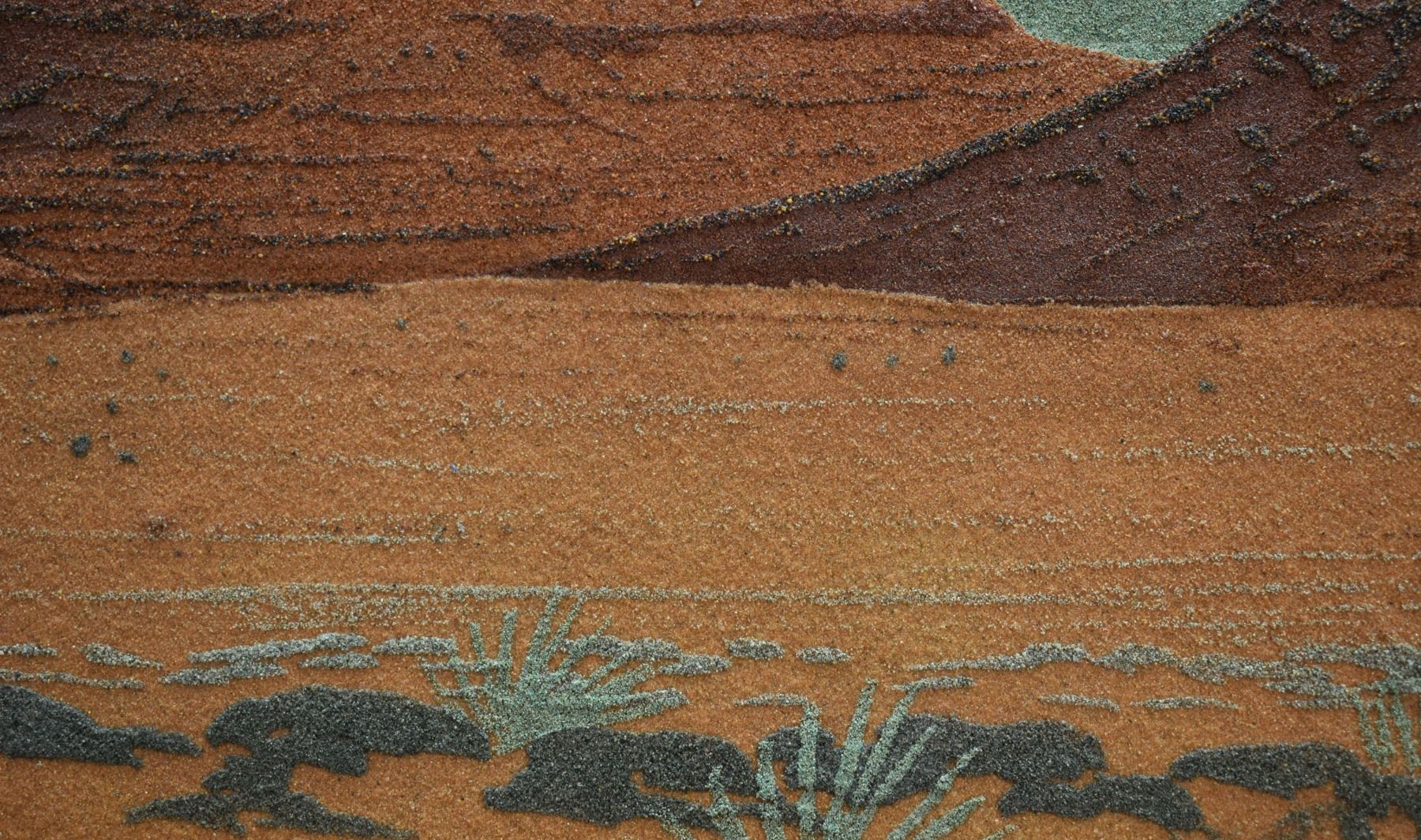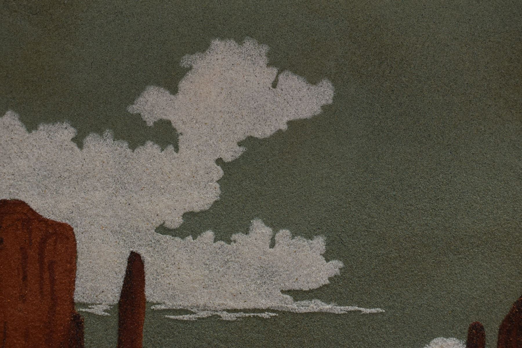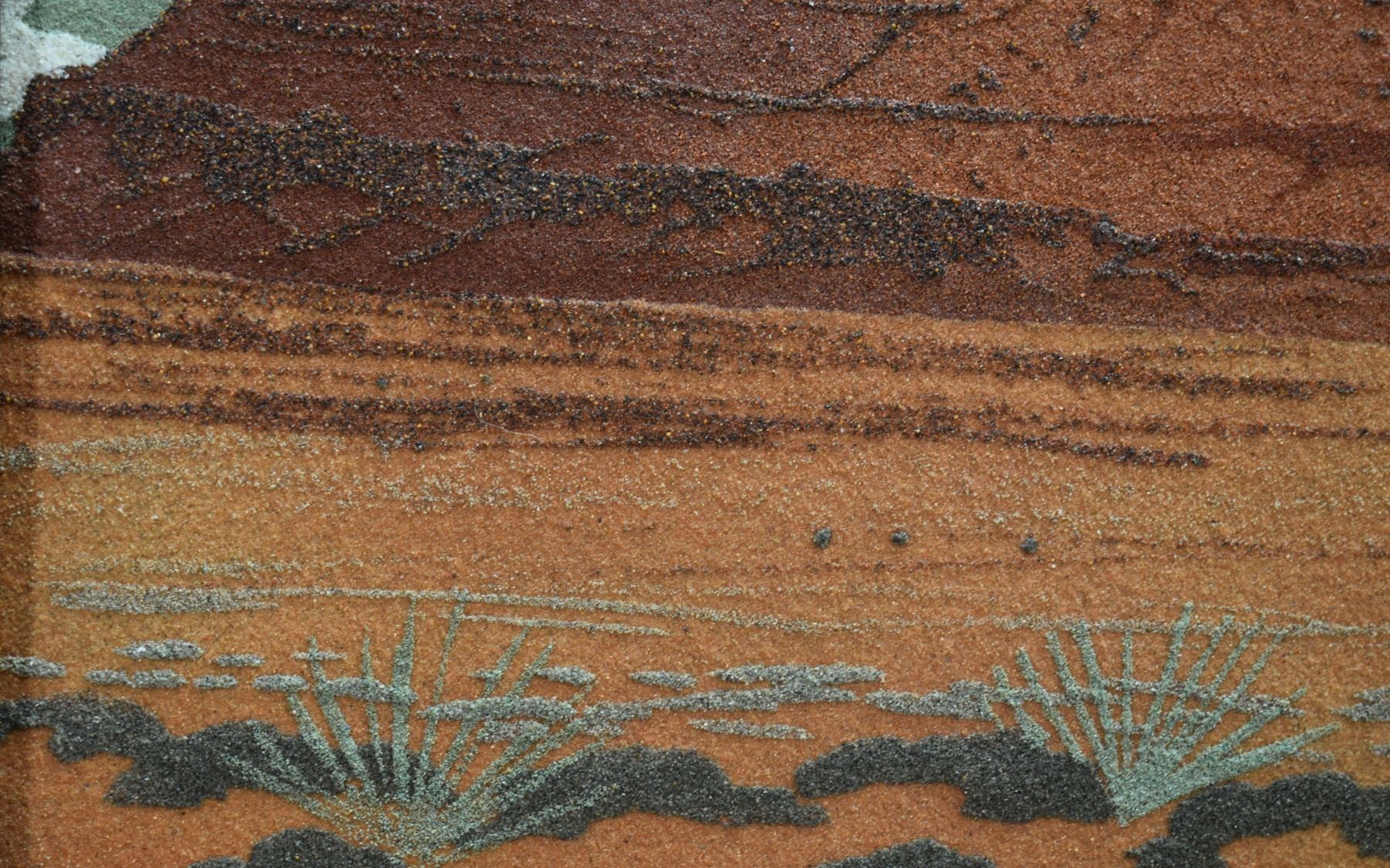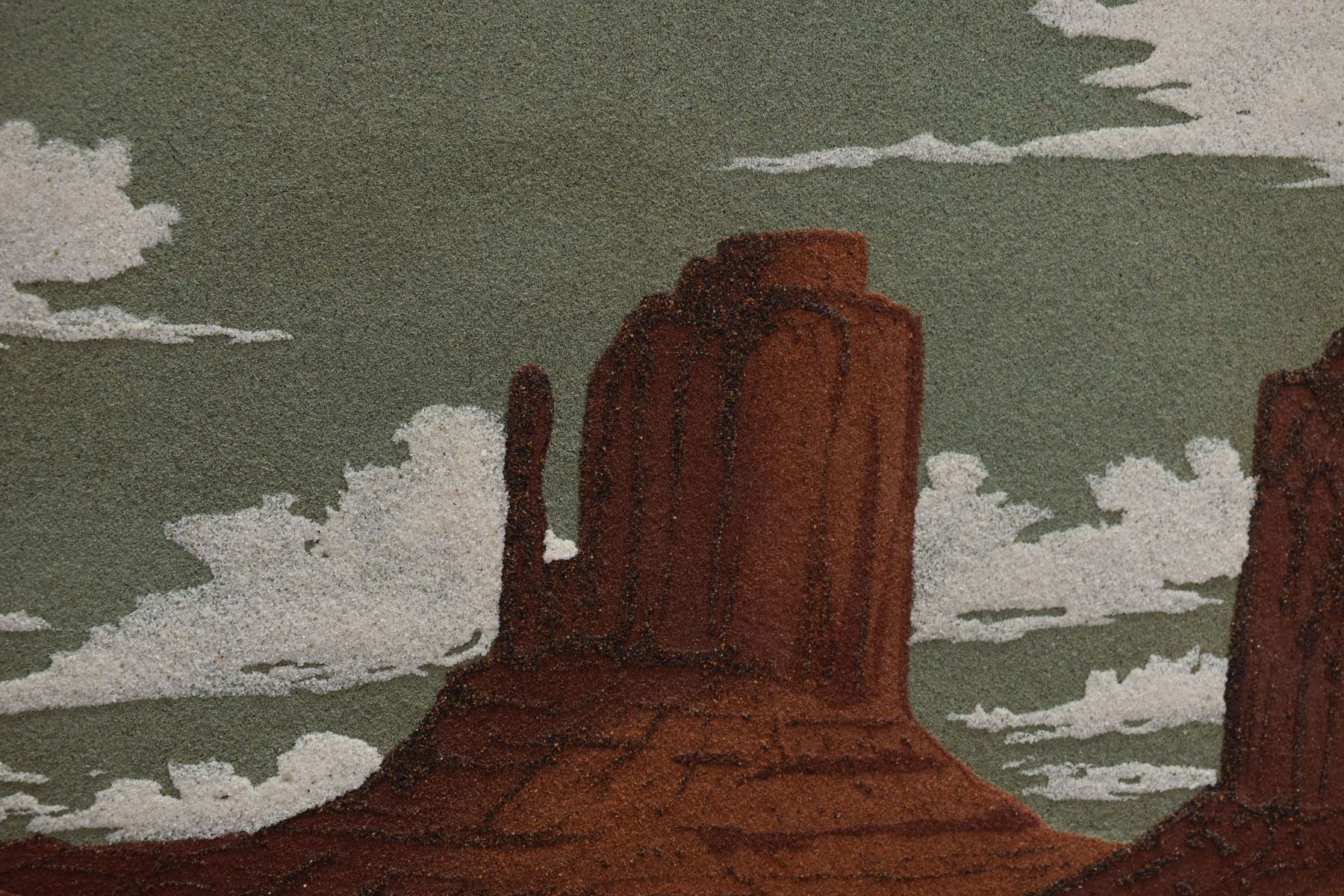 1973 Navajo sand painting depicting monument valley signed on back Eugene B Joe. Image 13.5" x 23" framed to 20" x 30"