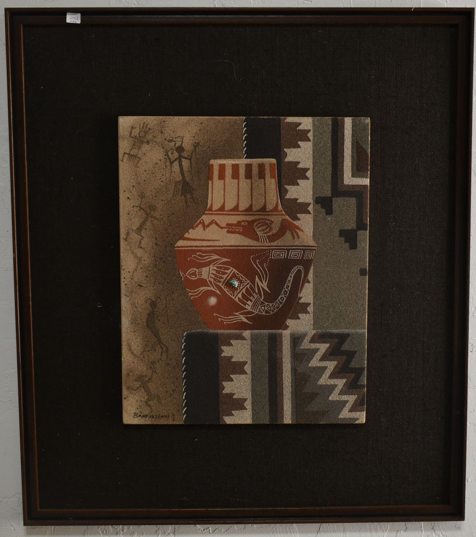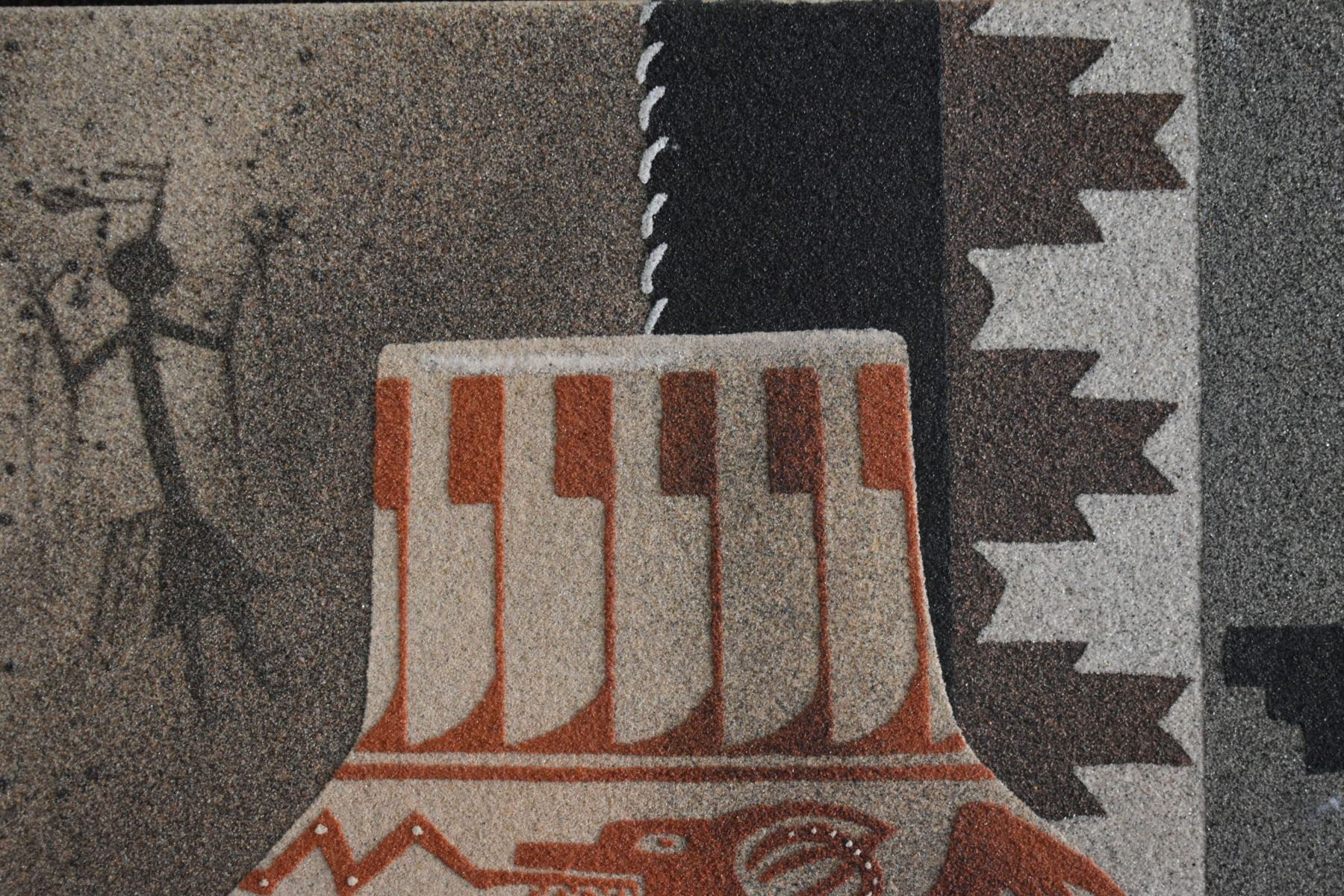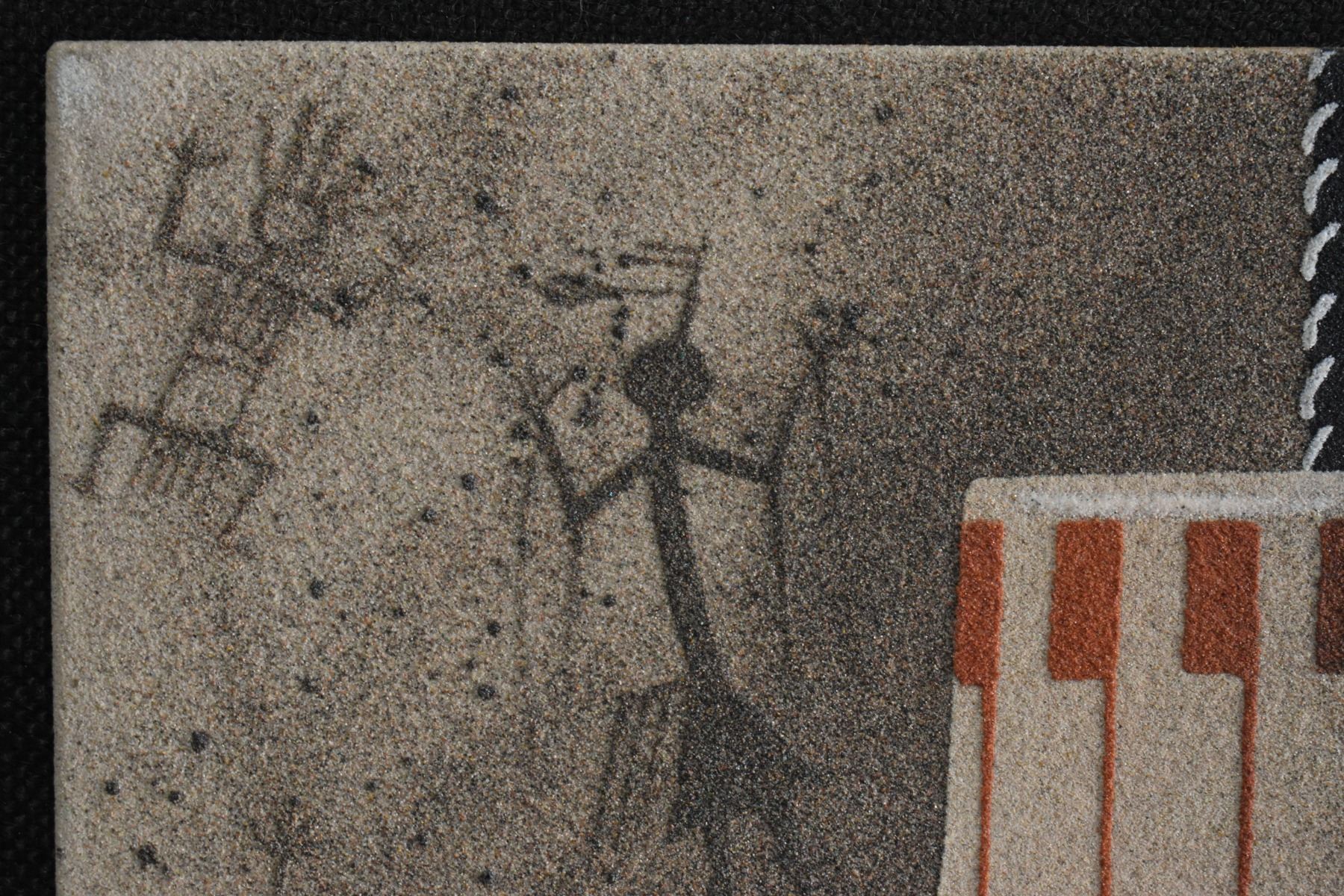 1990-2000's Navajo, hand made sand painting on board signed Baatsoslanii for Eugene Joe 20" x 16" framed to 33.5" x 29.5"