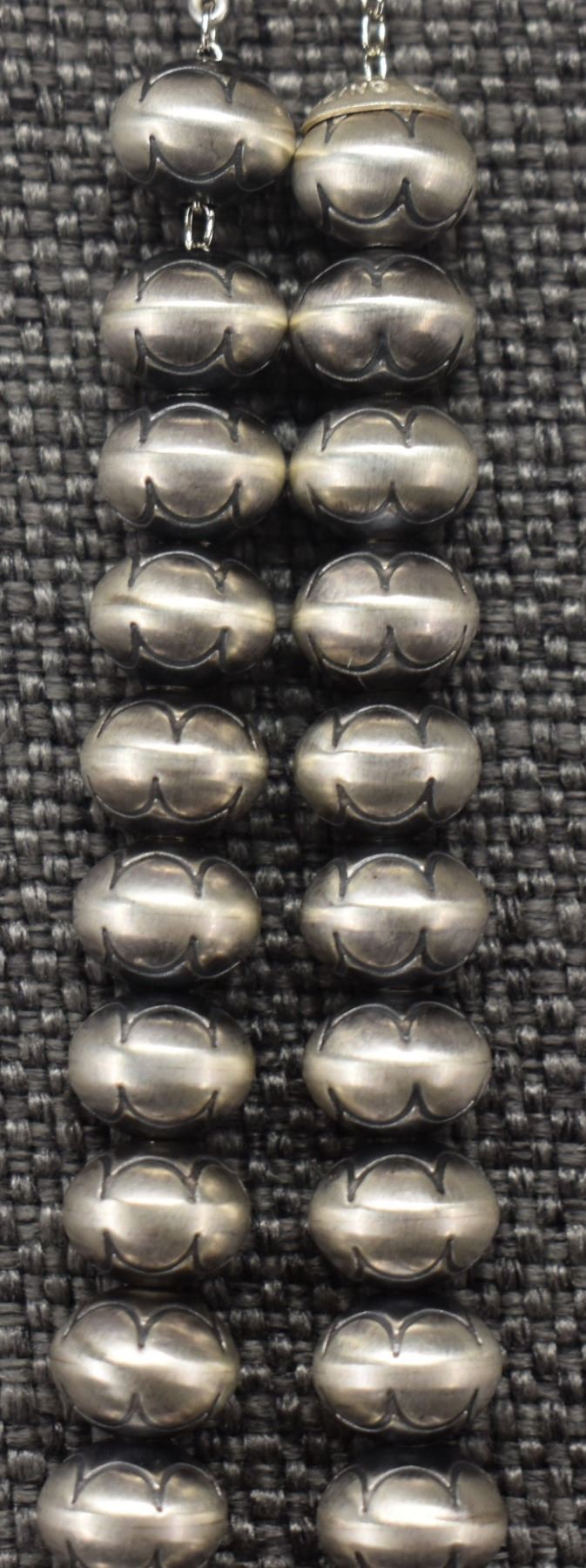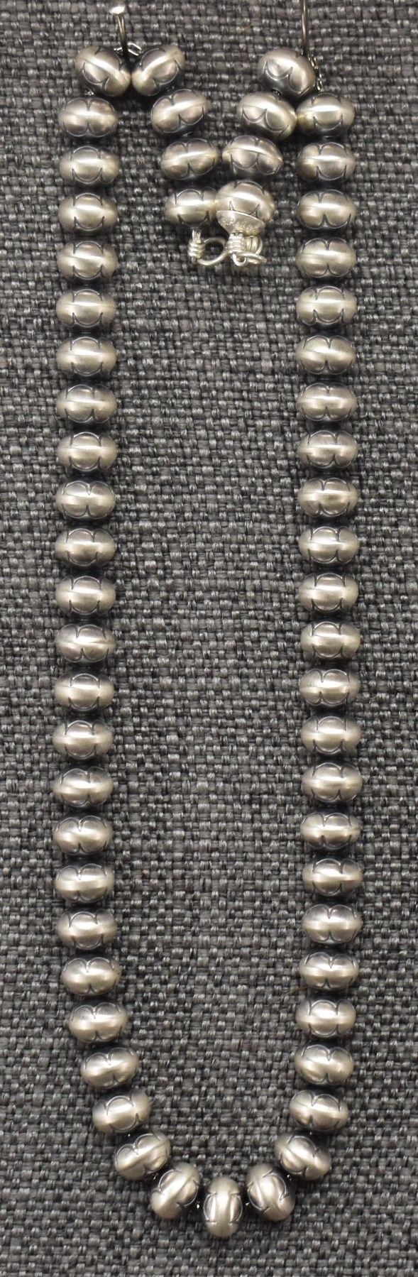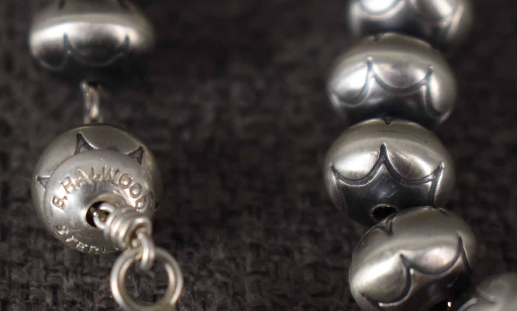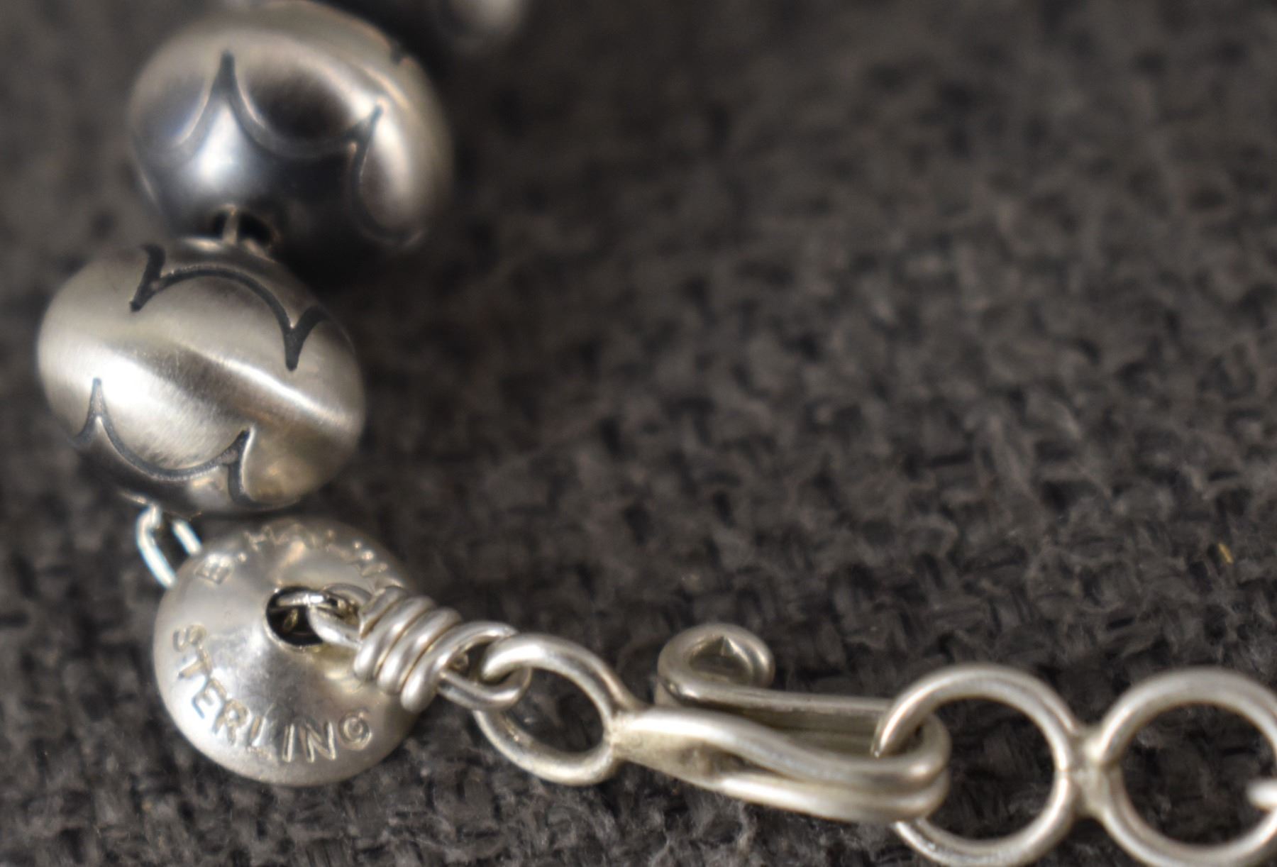 1990's Navajo. Single strand sterling silver bead necklace. 19'' long. Total weight 63 grams. Signed B. Halwood