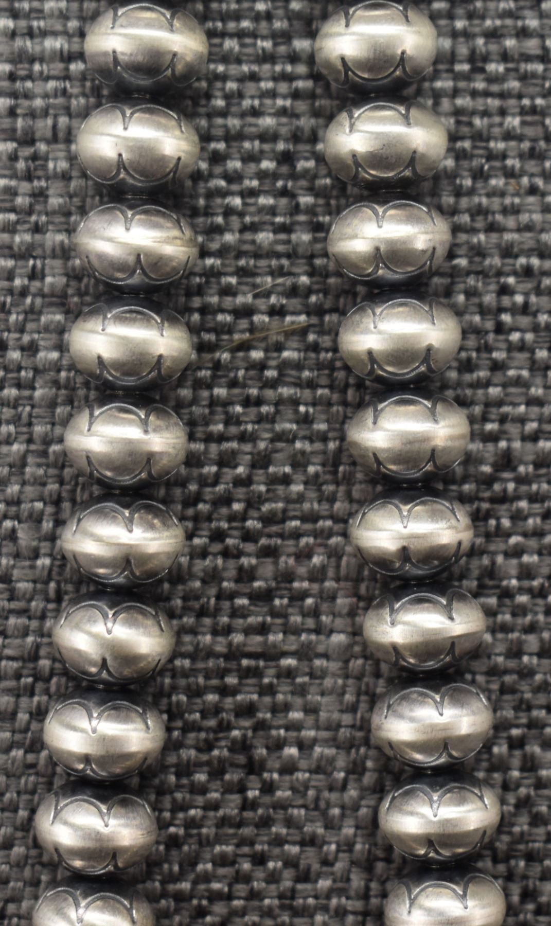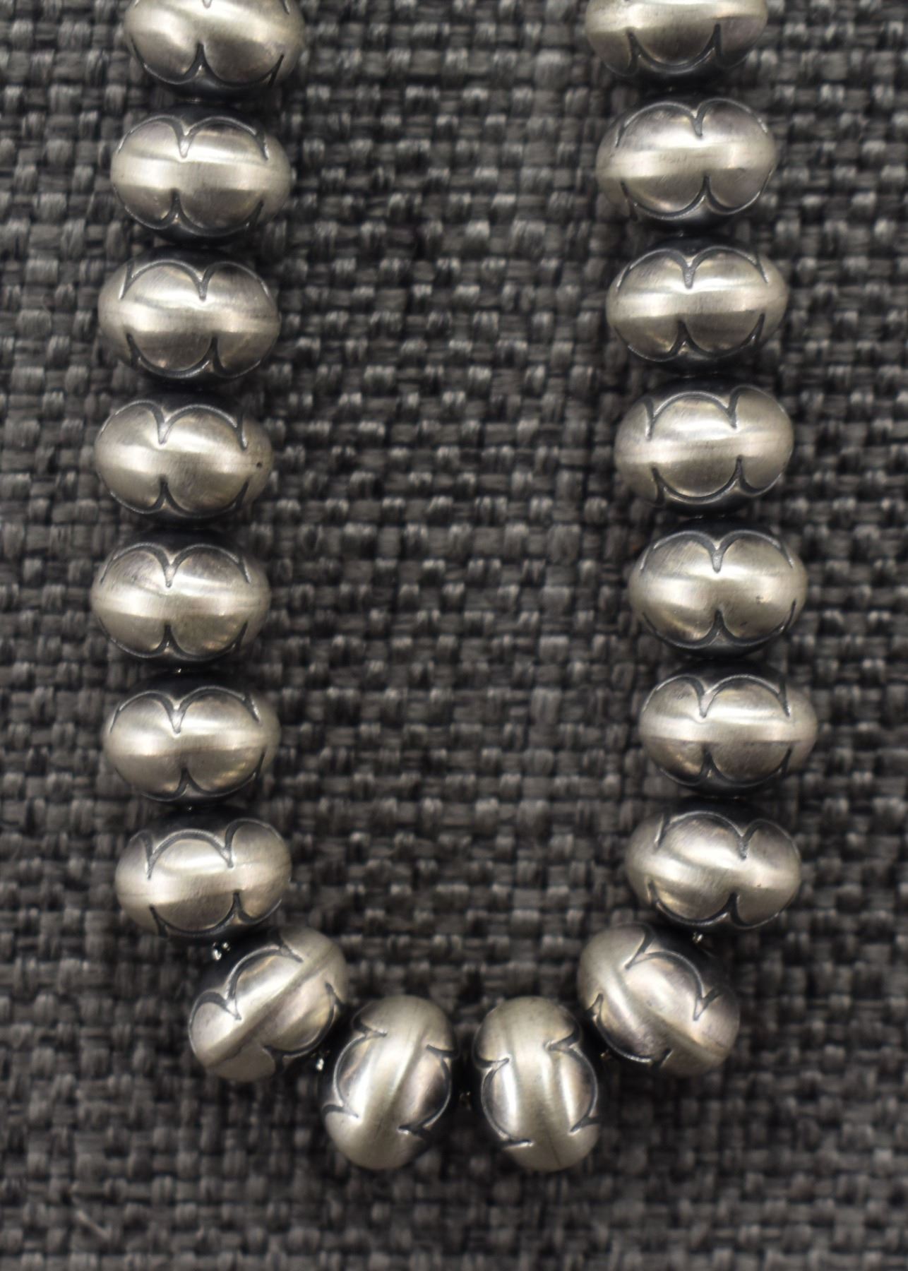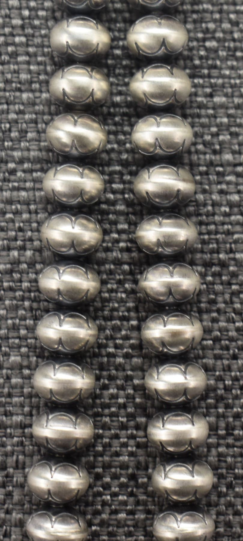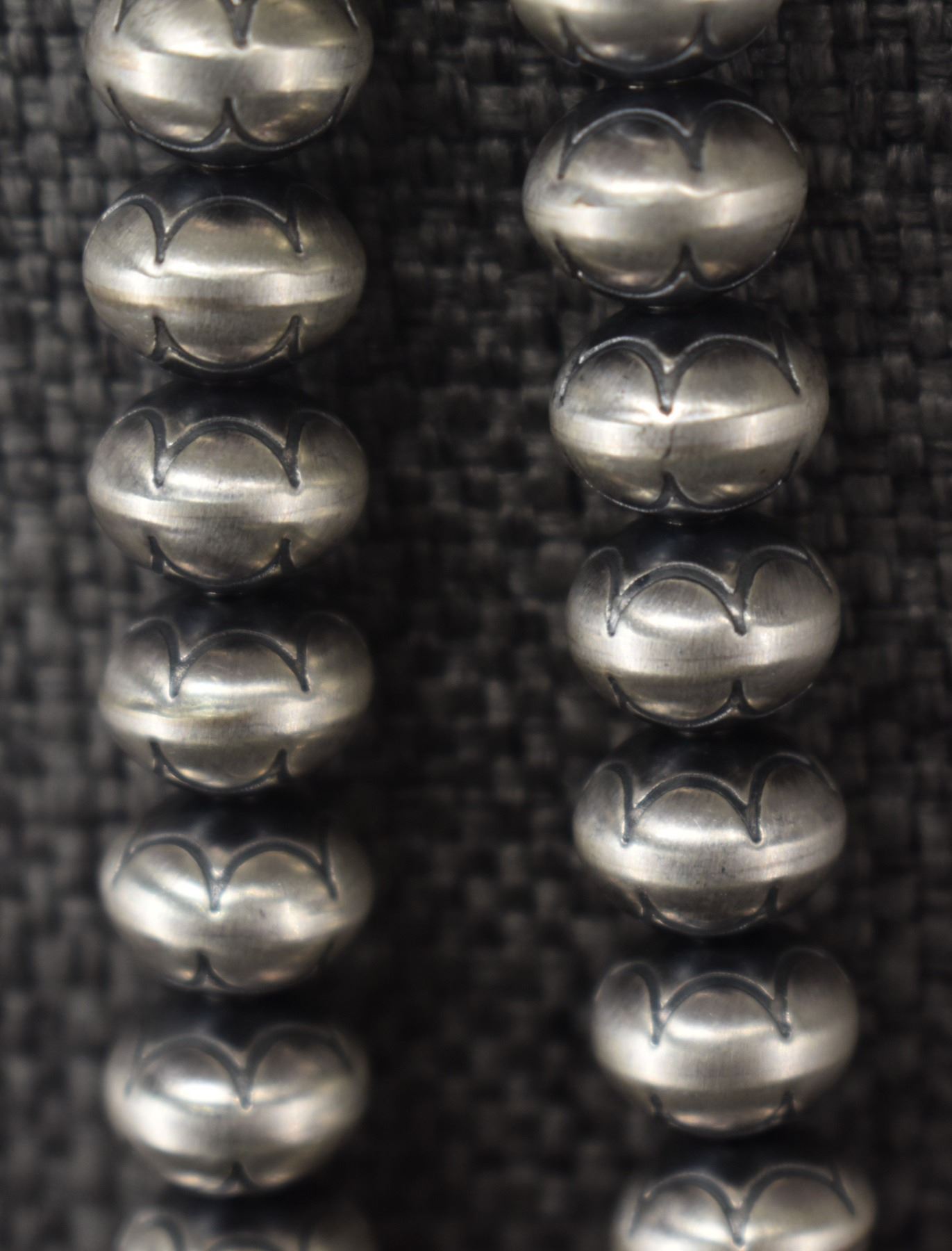 1990's Navajo. Single strand sterling silver bead necklace. 19'' long. Total weight 63 grams. Signed B. Halwood