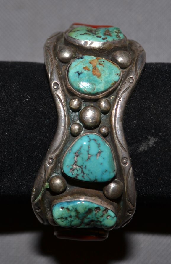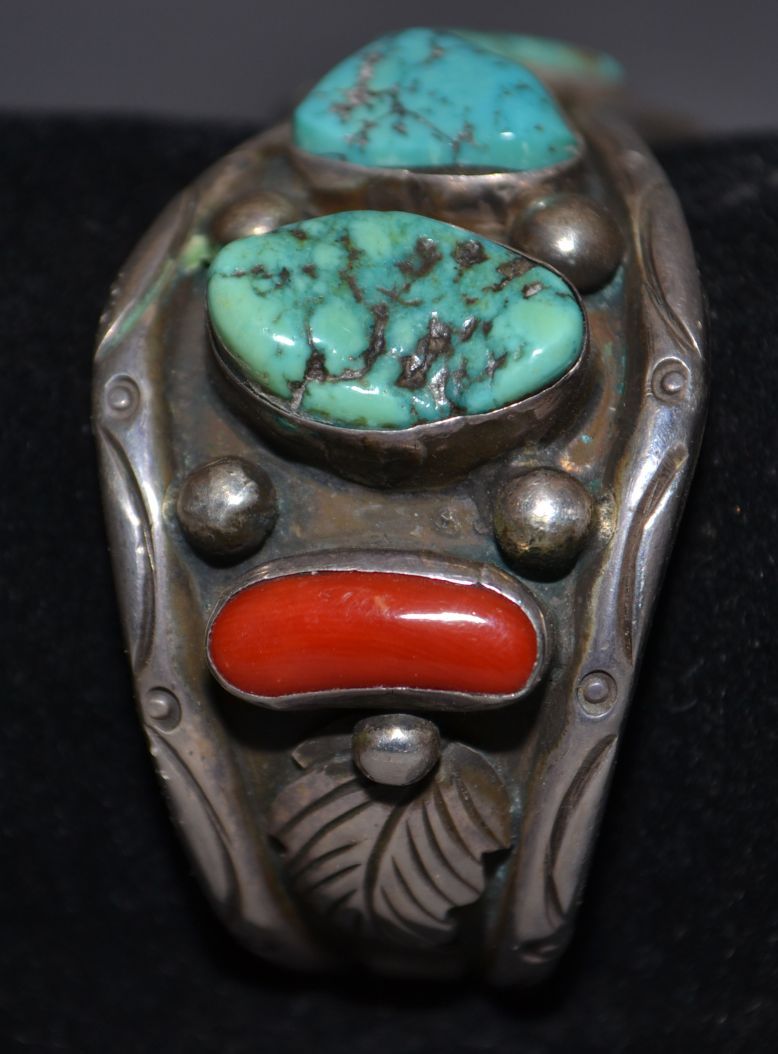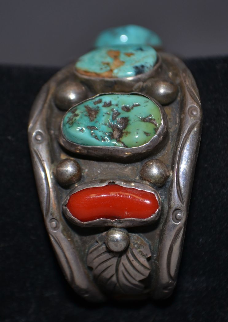1960s 70s sterling Silver for turquoise stones two coral stones signed BVL 4.75" x 1" x 1"