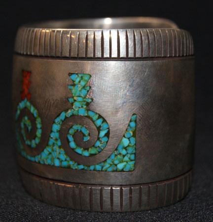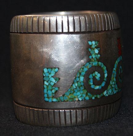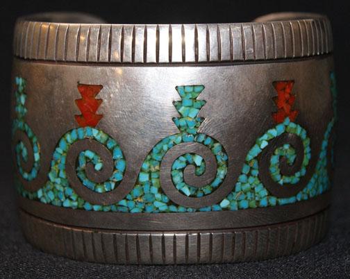 1970'S coral & turquoise chip inlaid, 1.1/8" opening, 5.75" around, 1.75" wide