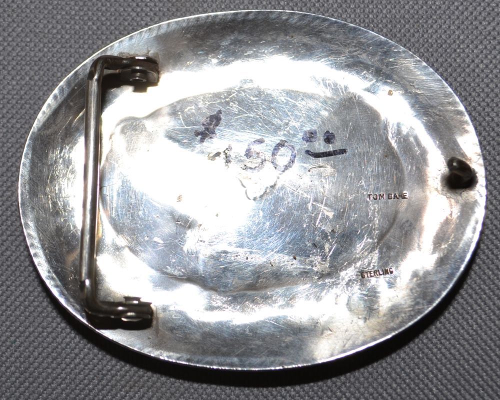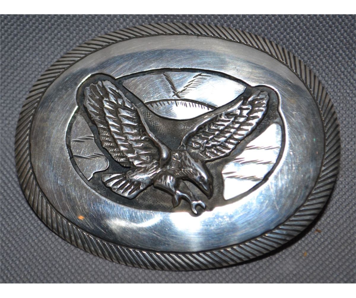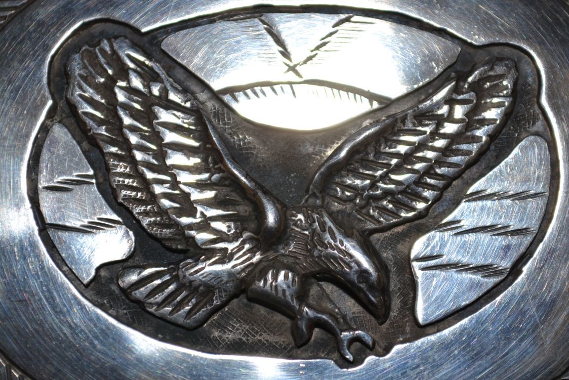 1980s 90s sterling silver eagle design, signed Tom Bahe, 2.5" x 3.25" fits 1.5" belt