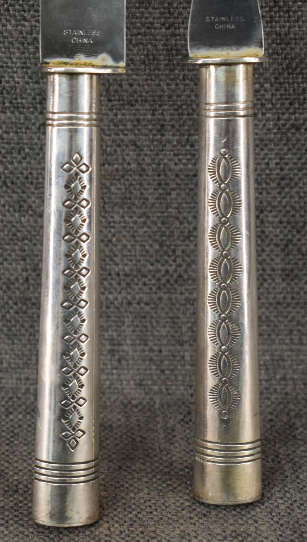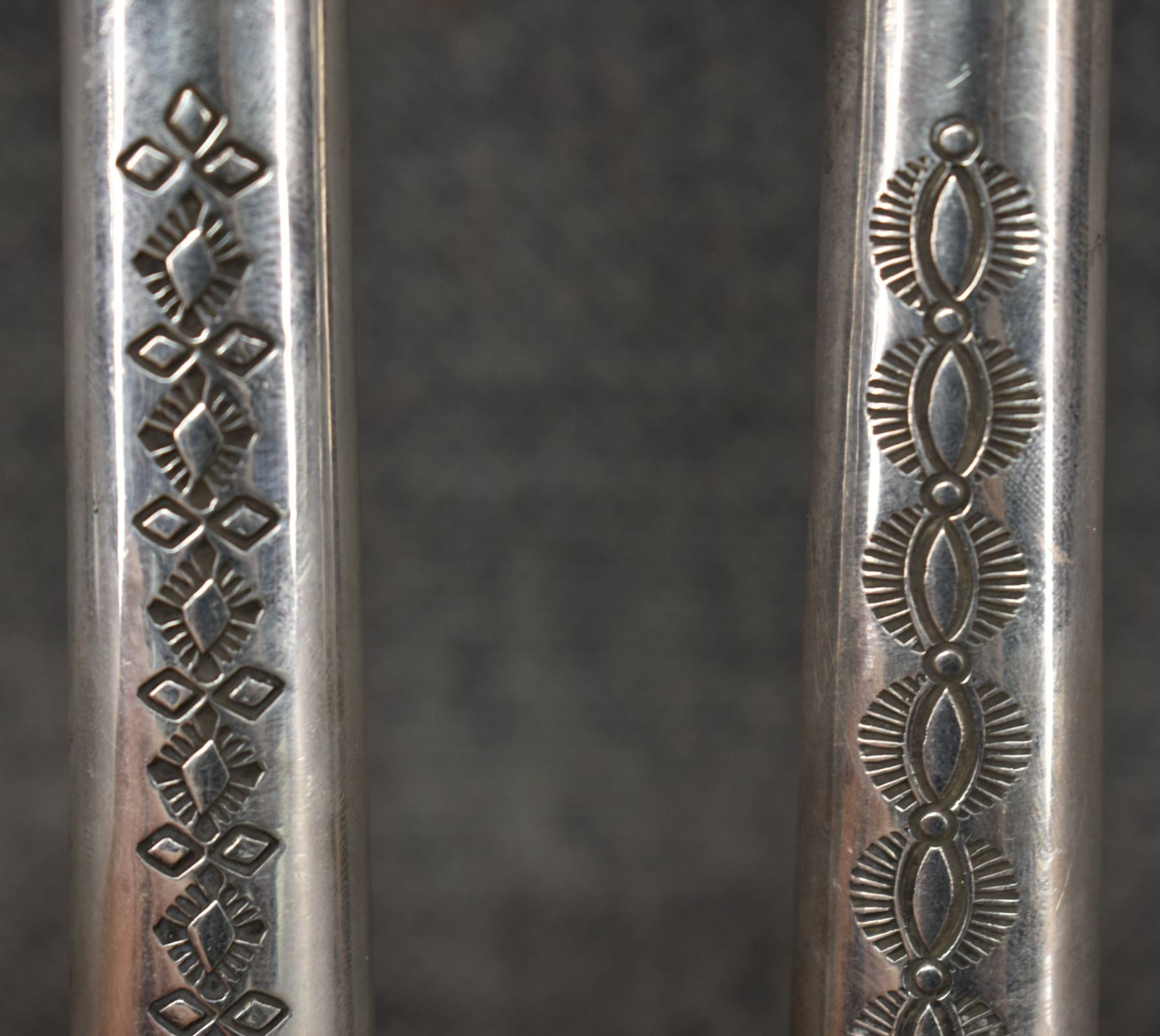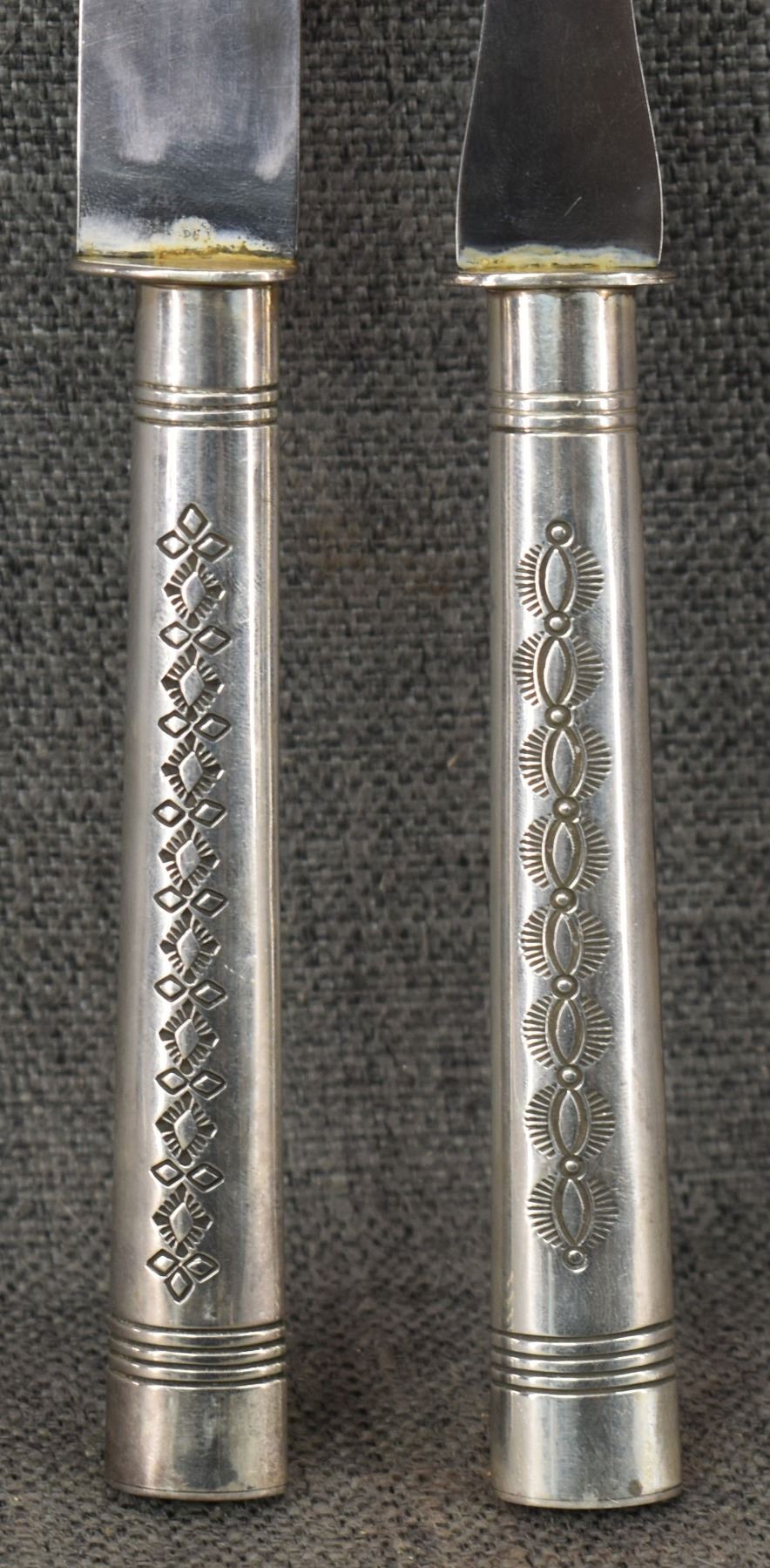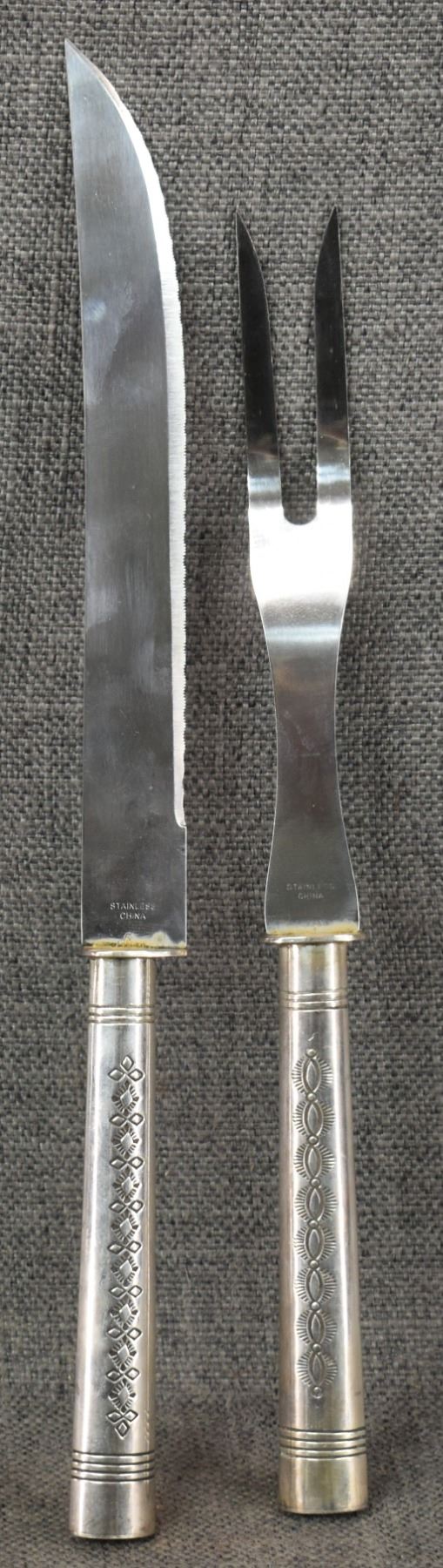 1980's Sterling silver hand stamped handles stamped TD on bottom. Blade and fork are stainless. Total weight 169 Grams, knife 13" x 1"