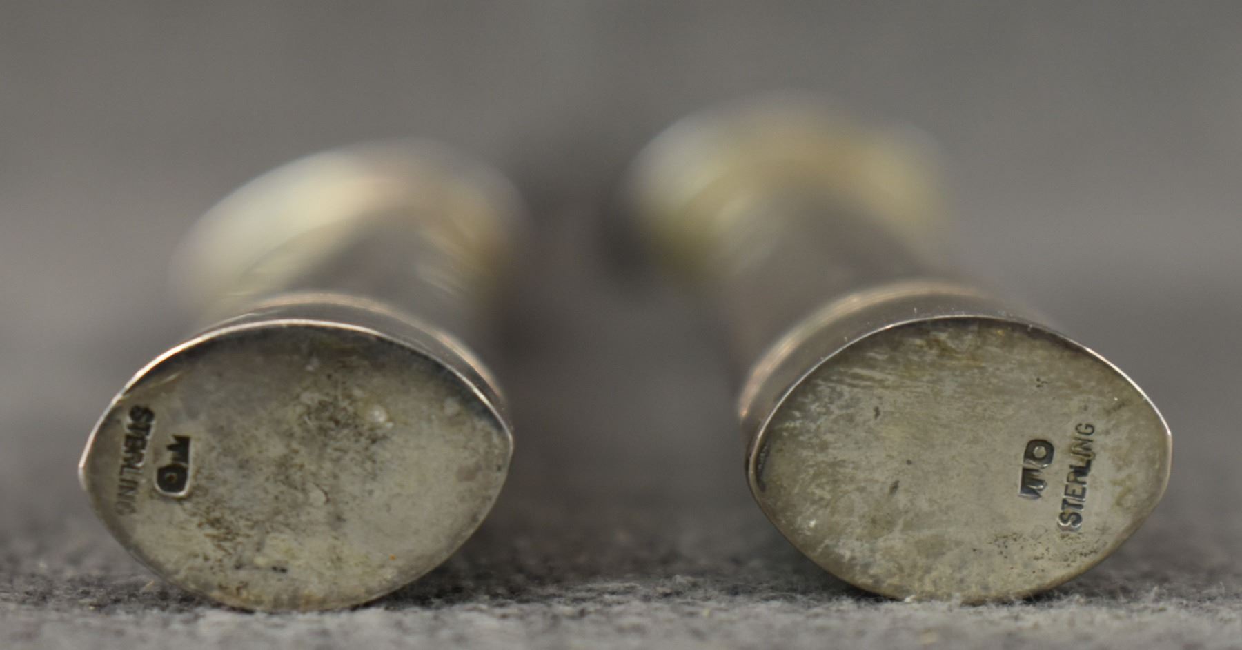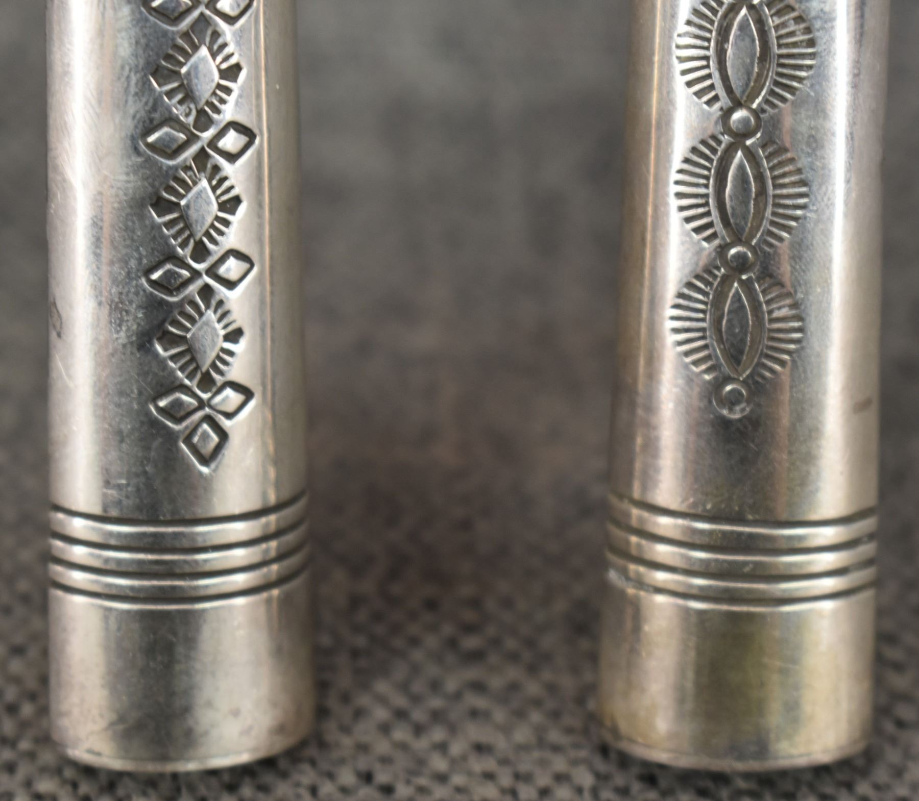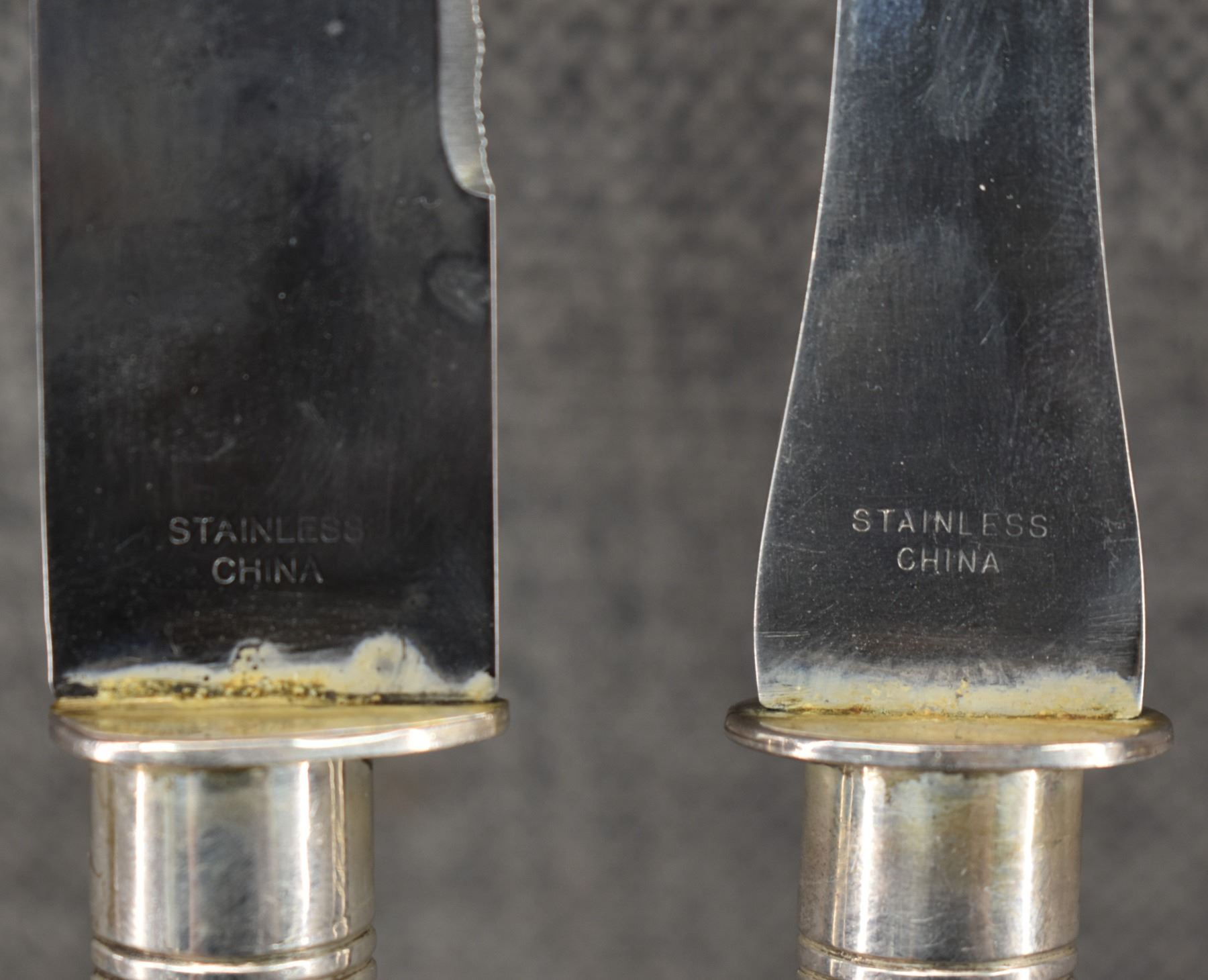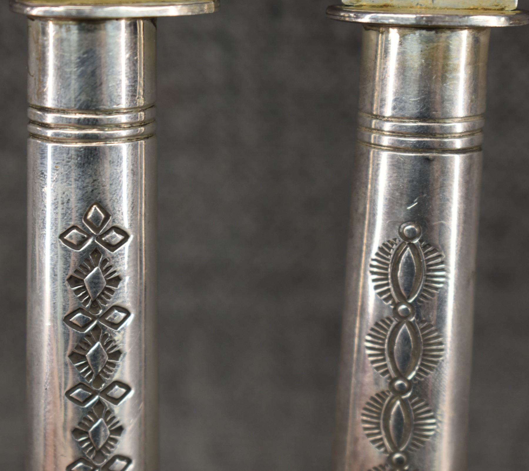 1980's Sterling silver hand stamped handles stamped TD on bottom. Blade and fork are stainless. Total weight 169 Grams, knife 13" x 1"