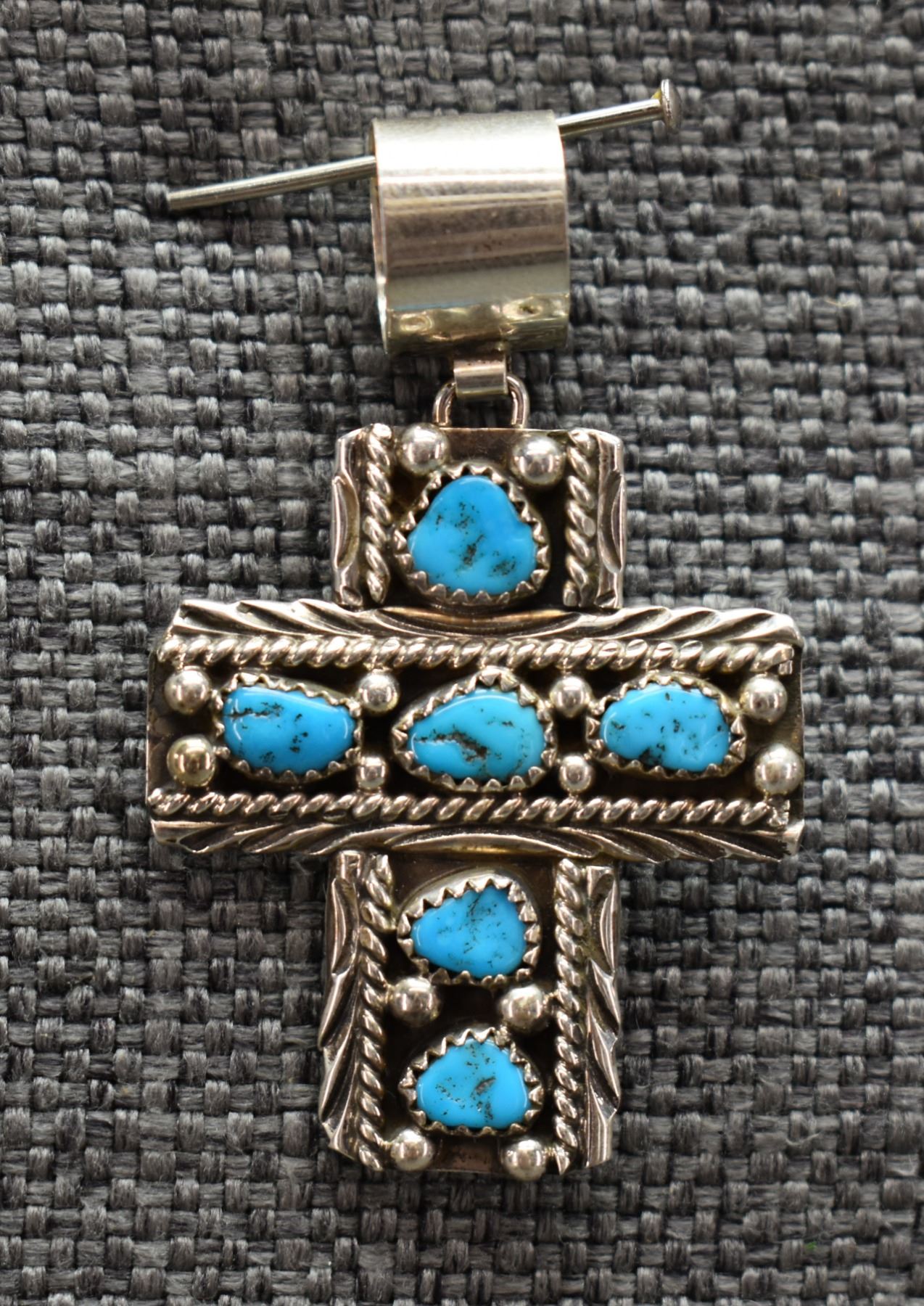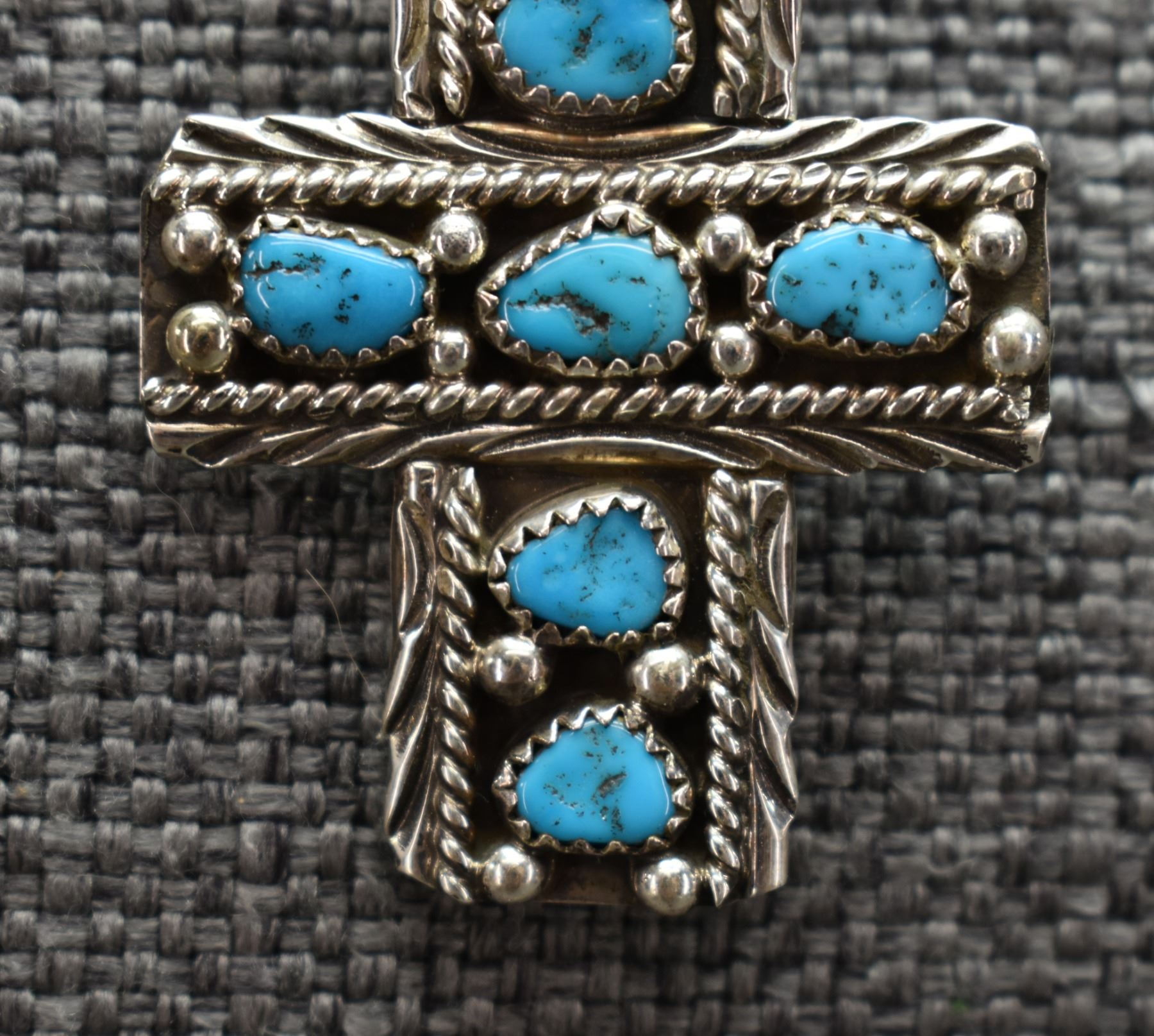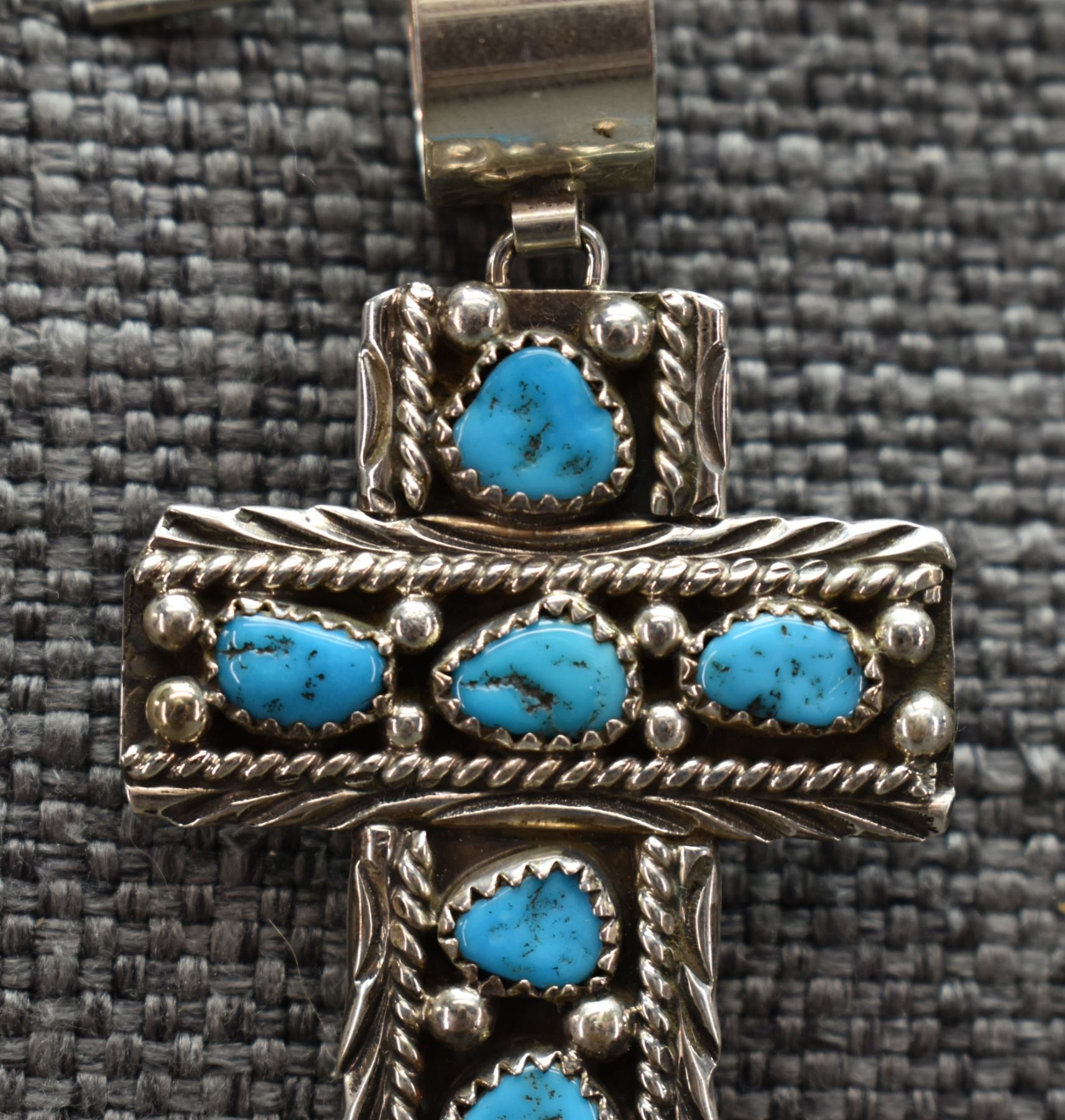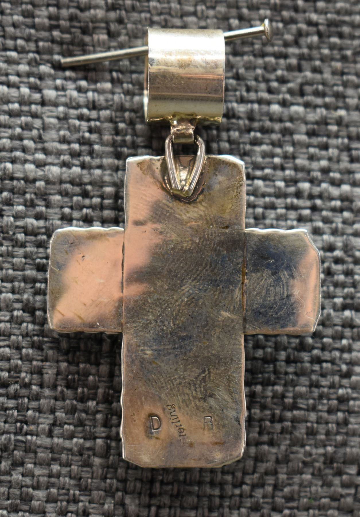 1980's Navajo. Sterling silver and turquoise cross pendant, signed D.R. 2.25'' x 1.25''. Total weight 10 grams
