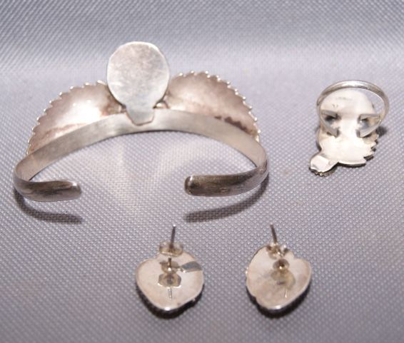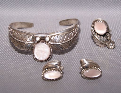 1970s 80s sterling silver mother-of-pearl bracelet ring and earrings bracelet 5.5" x 1" x 1" ring size 6.25 ear rings .75" x .5"
