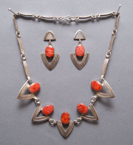 1980s, sterling silver with spiny oyster and matching earrings by Mary and Jack Tom, 18" long