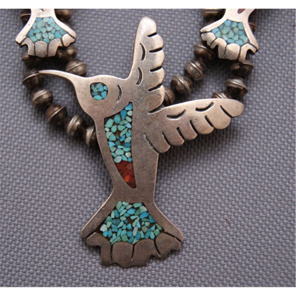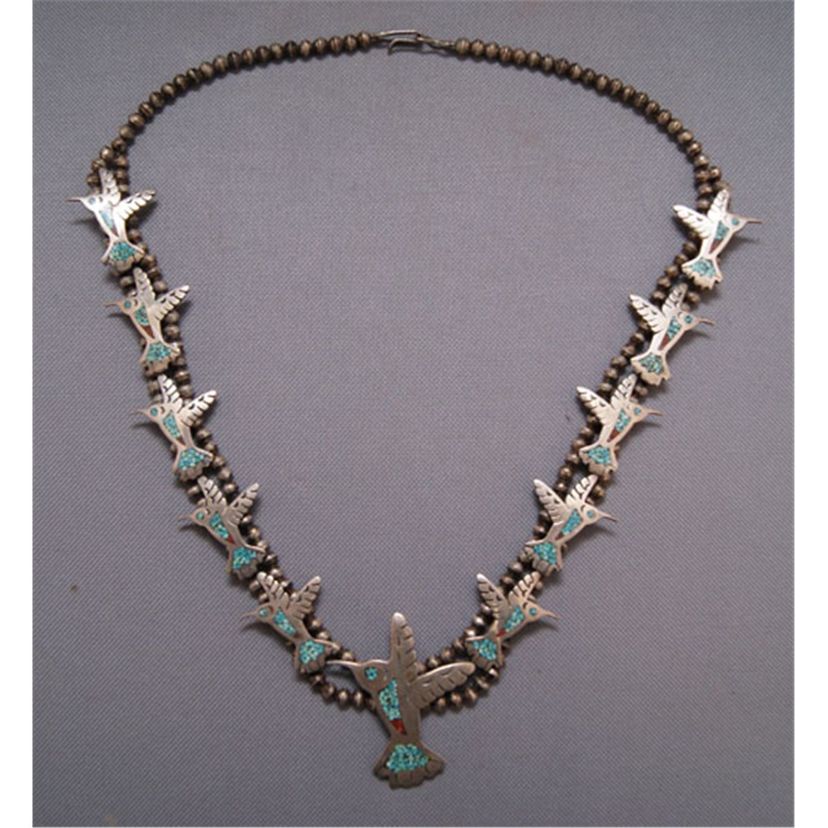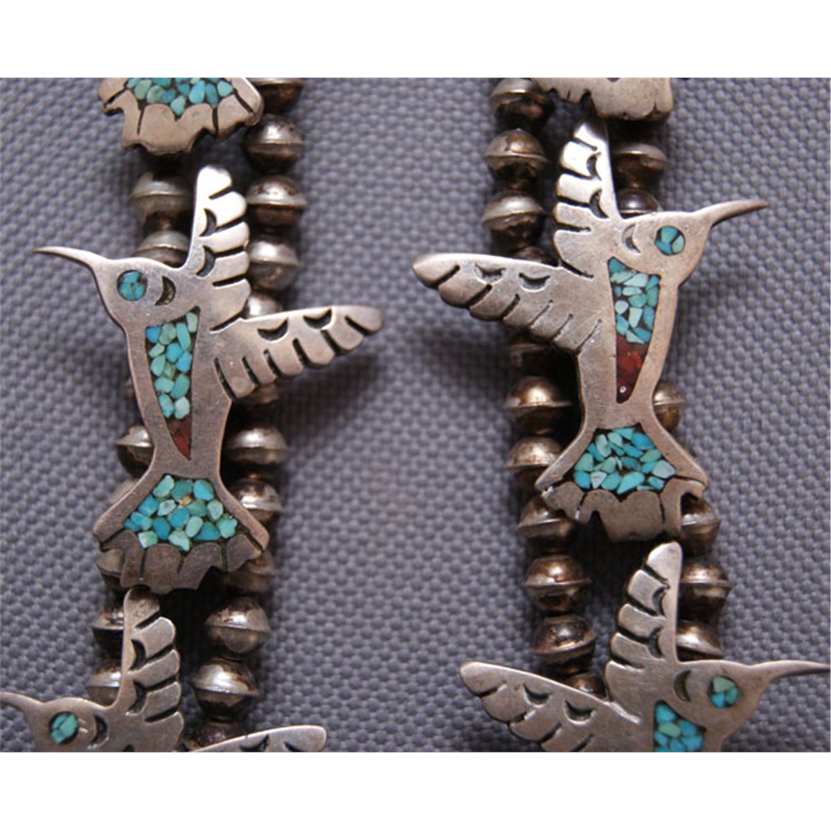 1970s, Chip inlay coral and turqoiuse hummingbirds, 24 " long