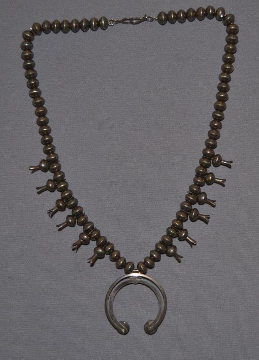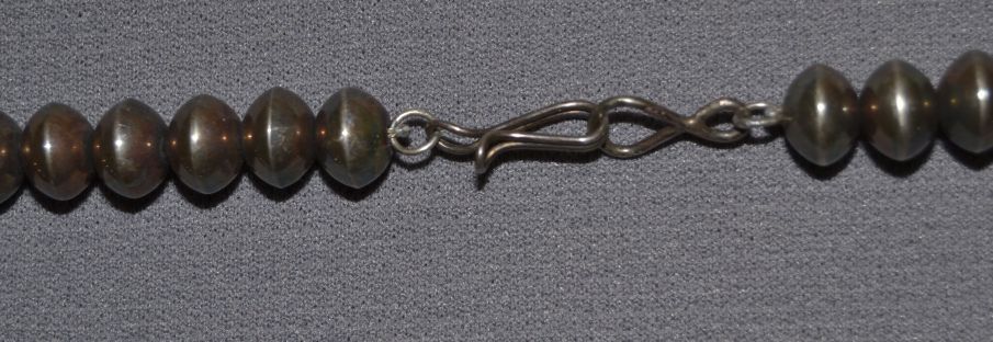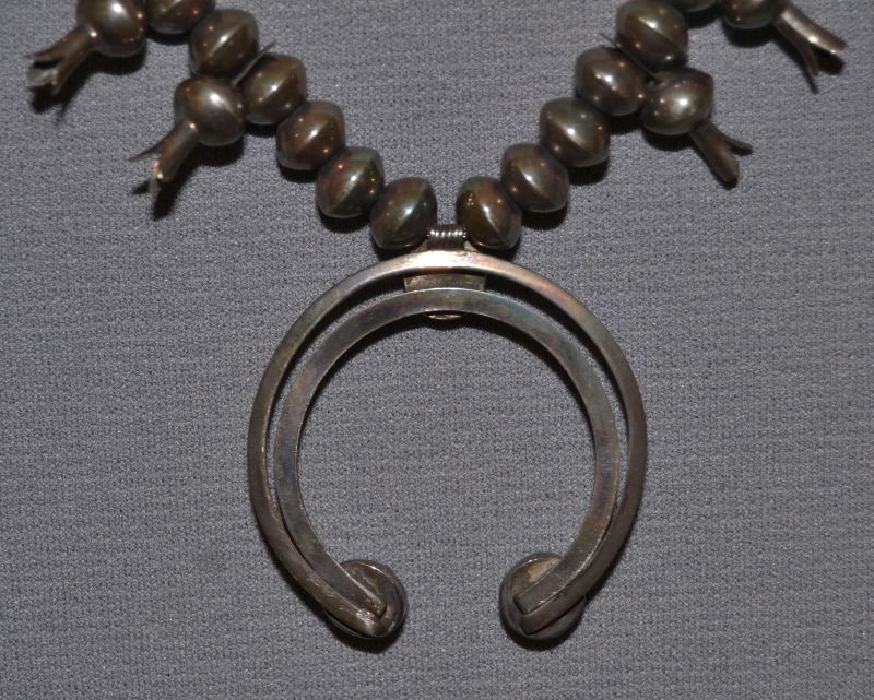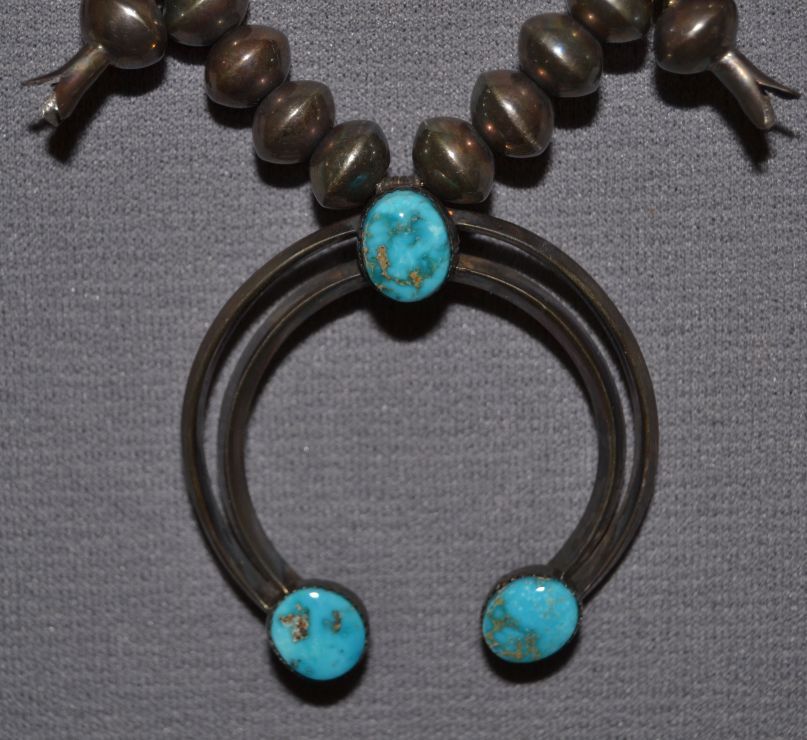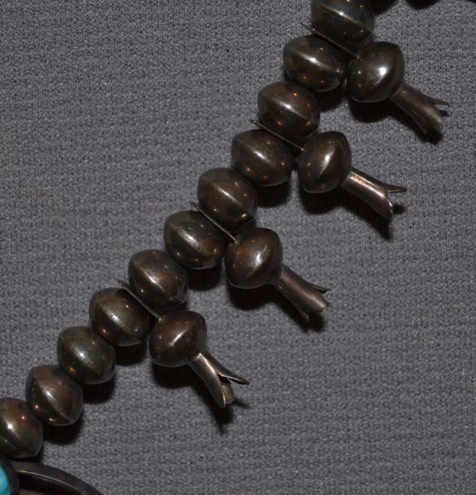 1970's sterling silver beads 22'' long with sterling and turquoise Naja 2'' x 2''