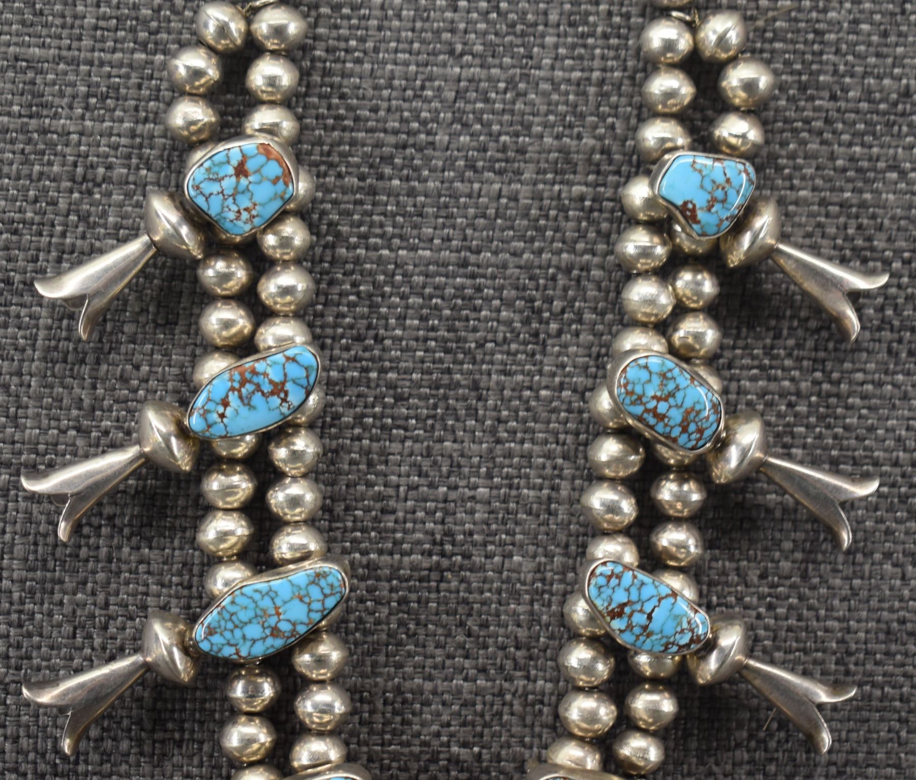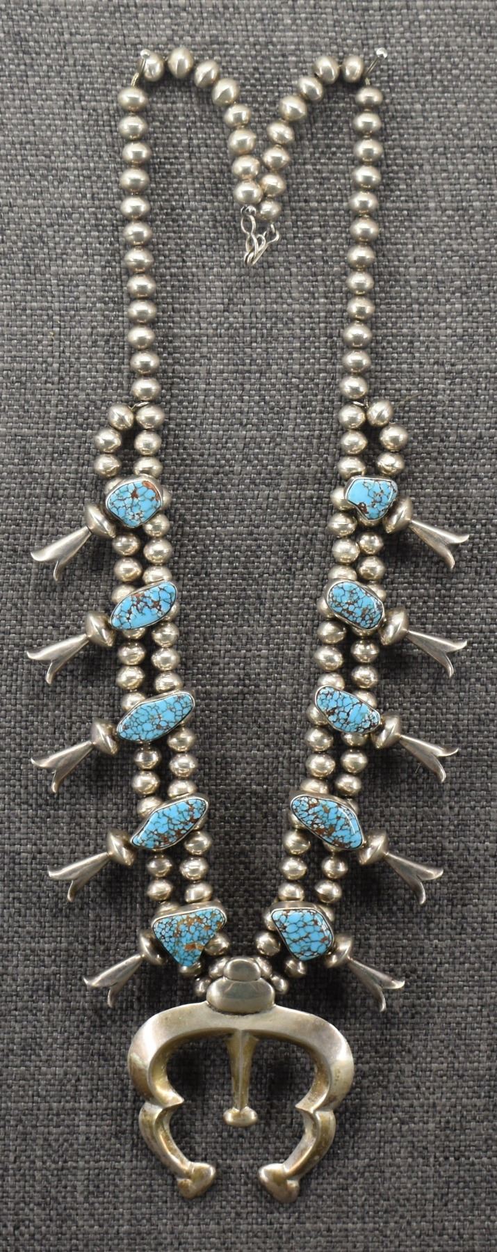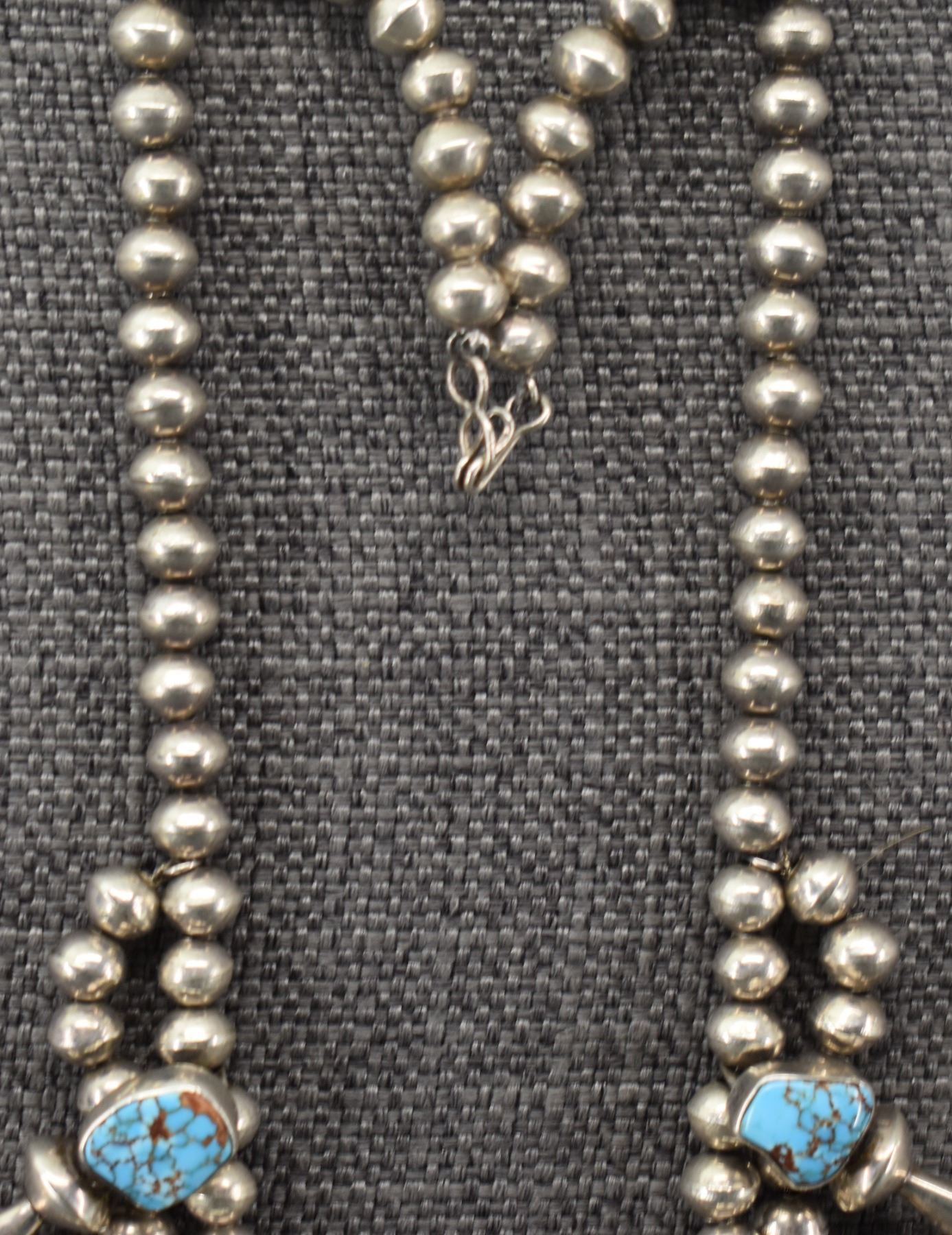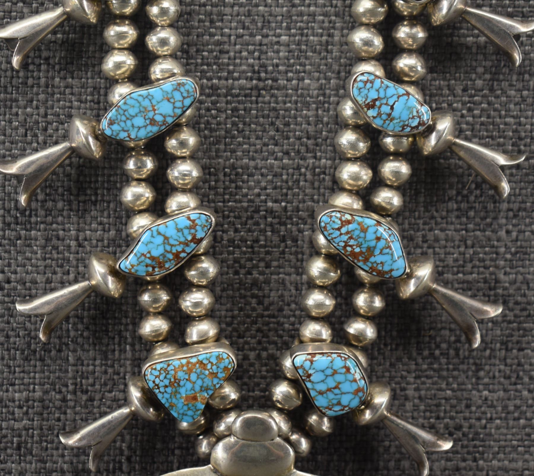 1960's Navajo. Sterling silver and #8 turquoise, beads measures 24" long, 10 blossoms .5" x 1.5" and sand cast naja 2.75" x 2.5" total weight 161 grams
