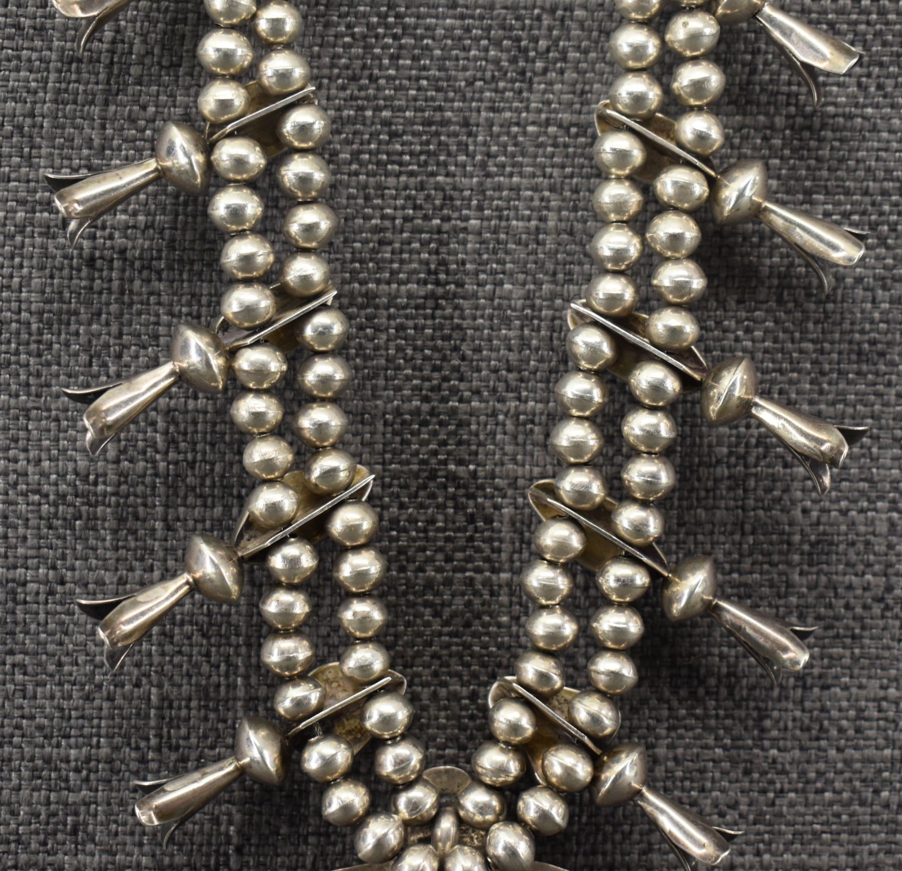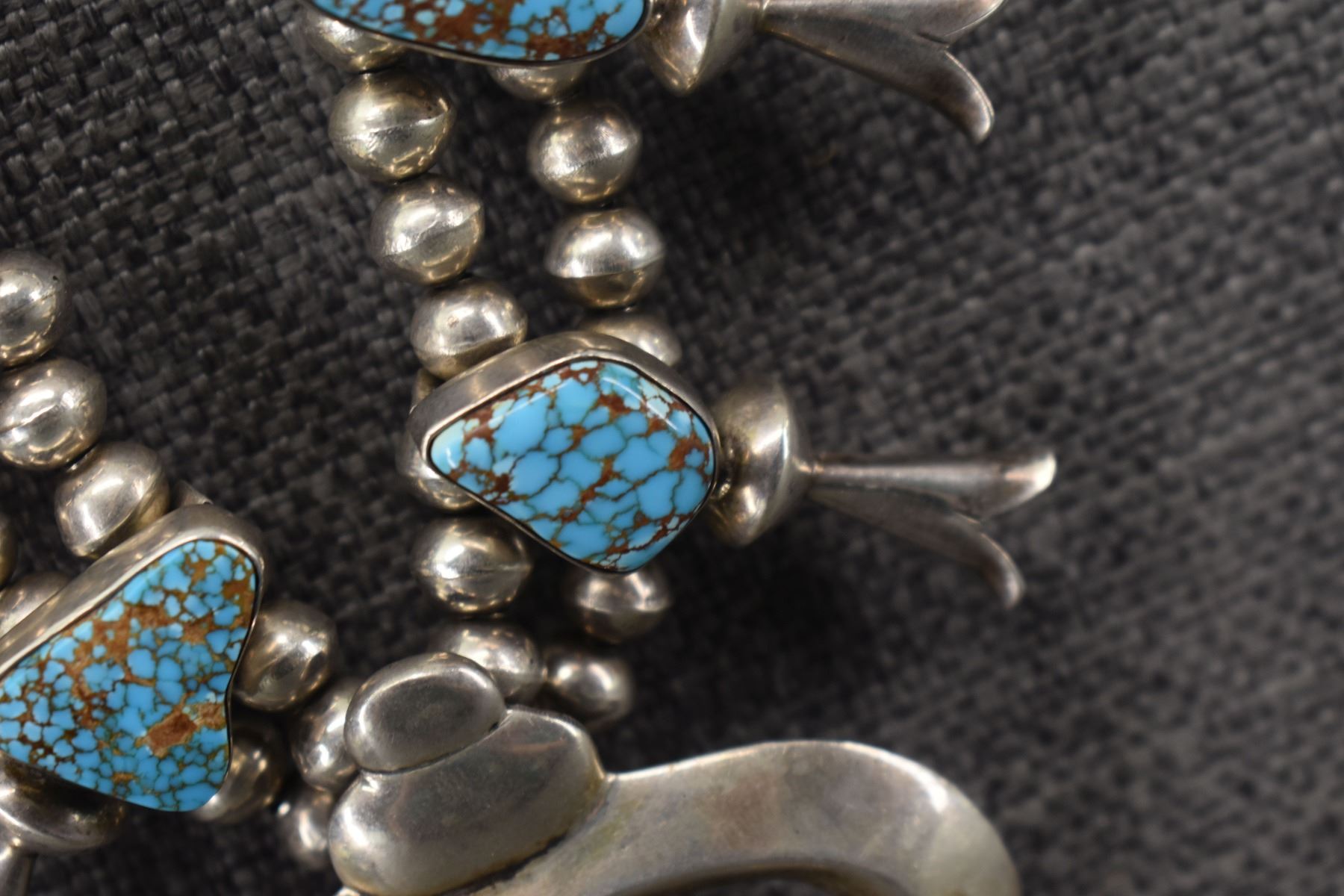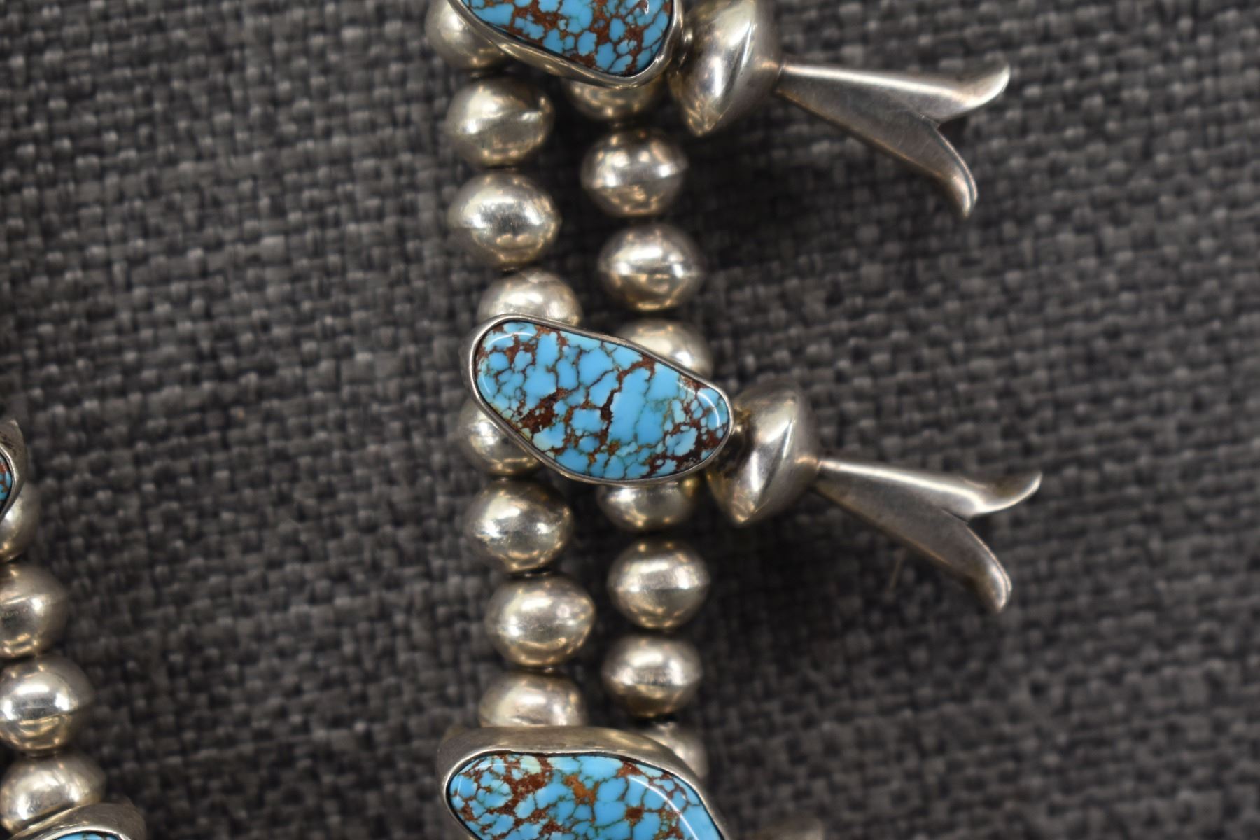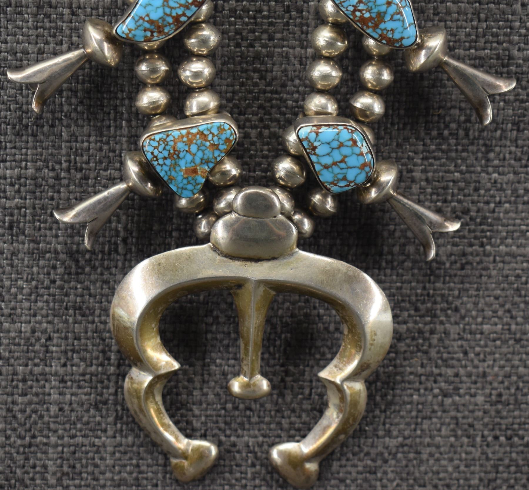 1960's Navajo. Sterling silver and #8 turquoise, beads measures 24" long, 10 blossoms .5" x 1.5" and sand cast naja 2.75" x 2.5" total weight 161 grams