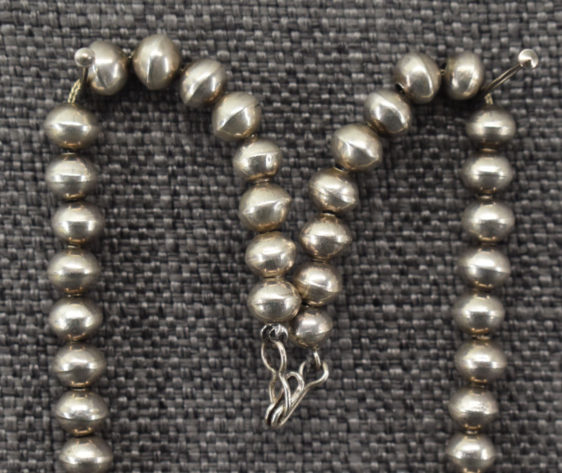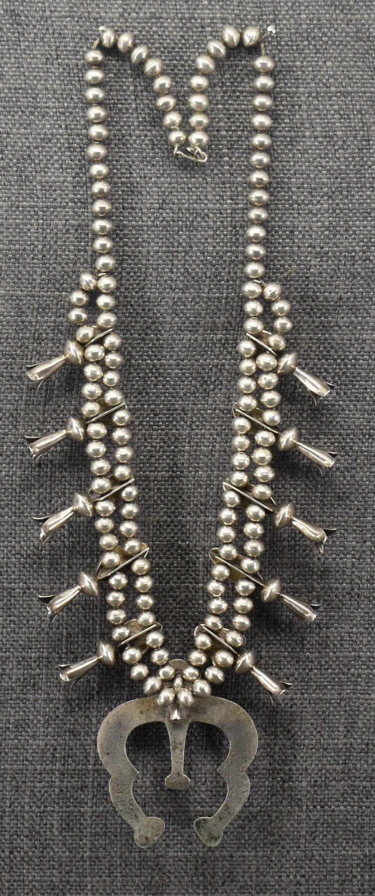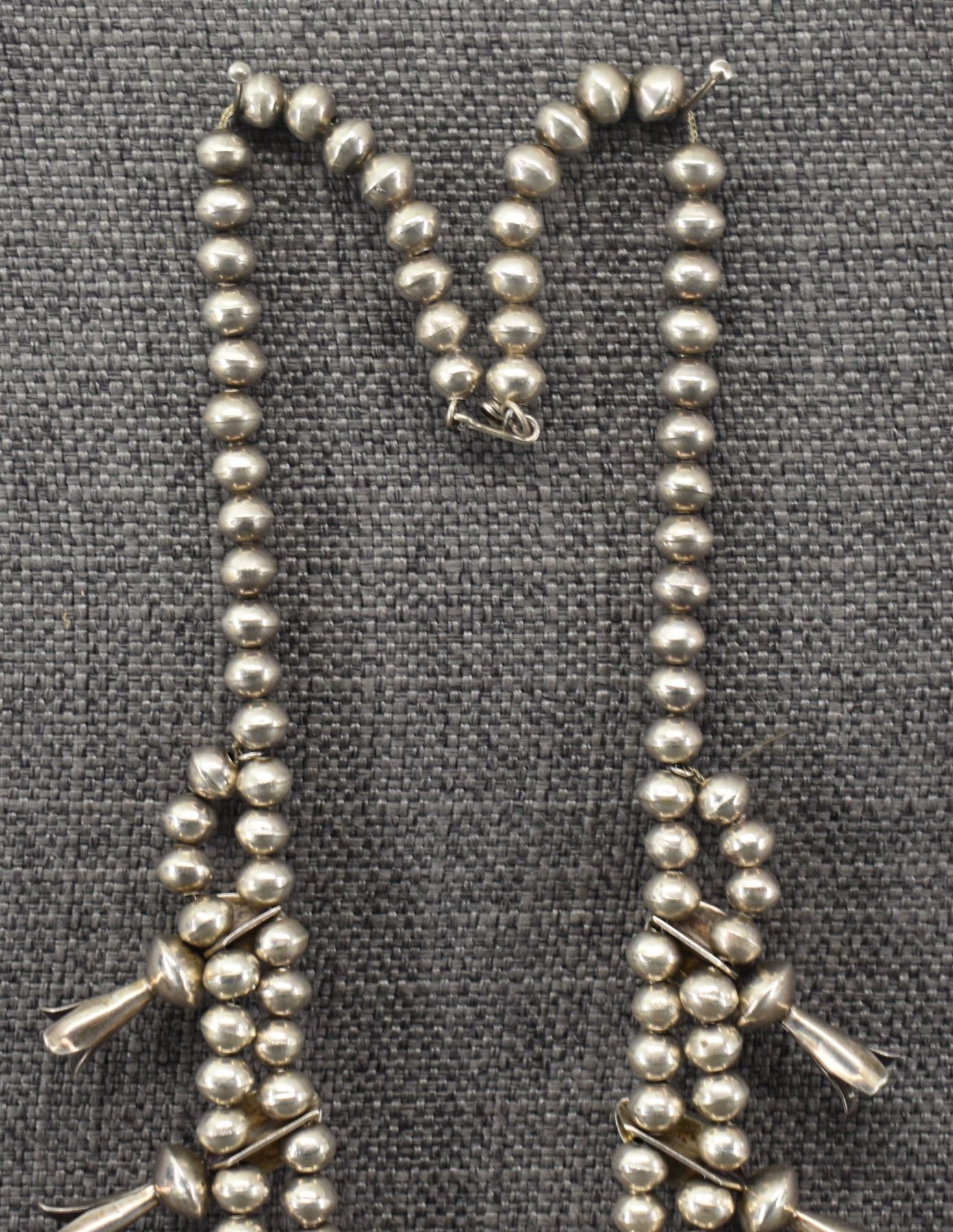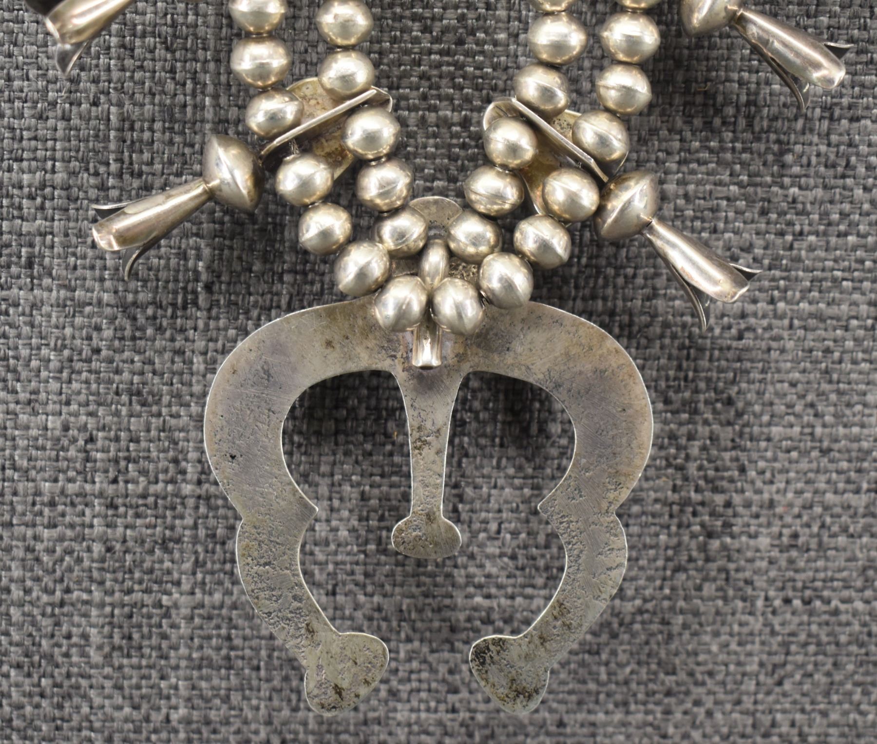 1960's Navajo. Sterling silver and #8 turquoise, beads measures 24" long, 10 blossoms .5" x 1.5" and sand cast naja 2.75" x 2.5" total weight 161 grams